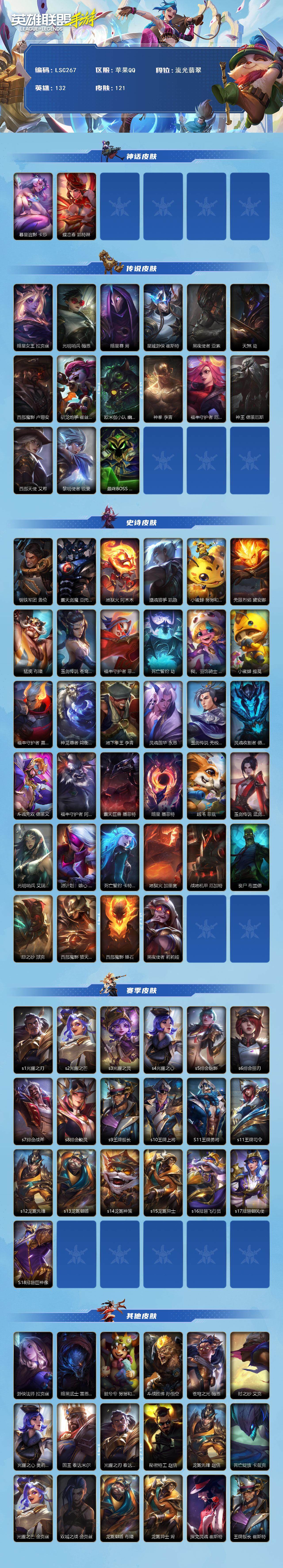 132英雄/121皮肤/2神话/15传说/34史诗/流光翡翠/