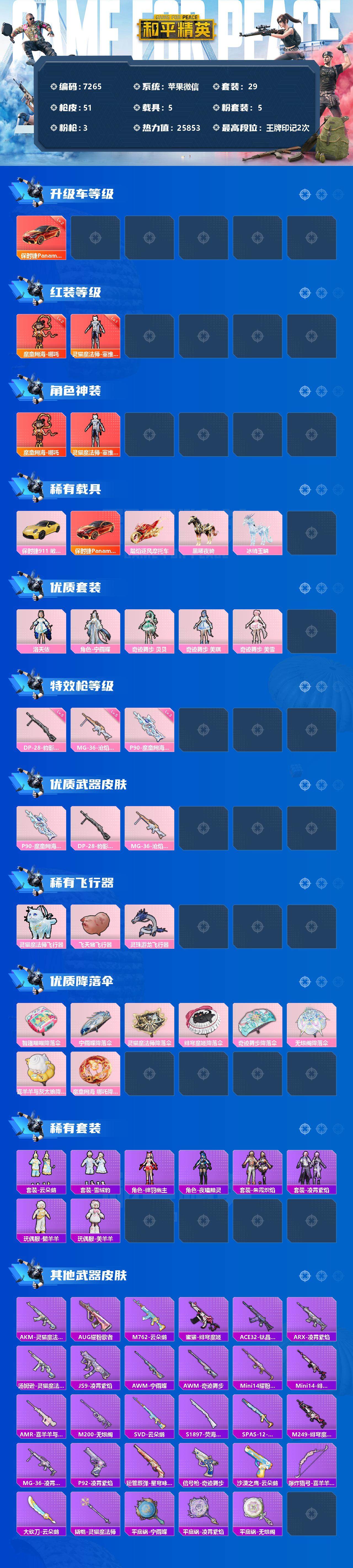 【7265】苹果 微信-5粉装-3特效枪-5载具-25853热力值-2印记-2