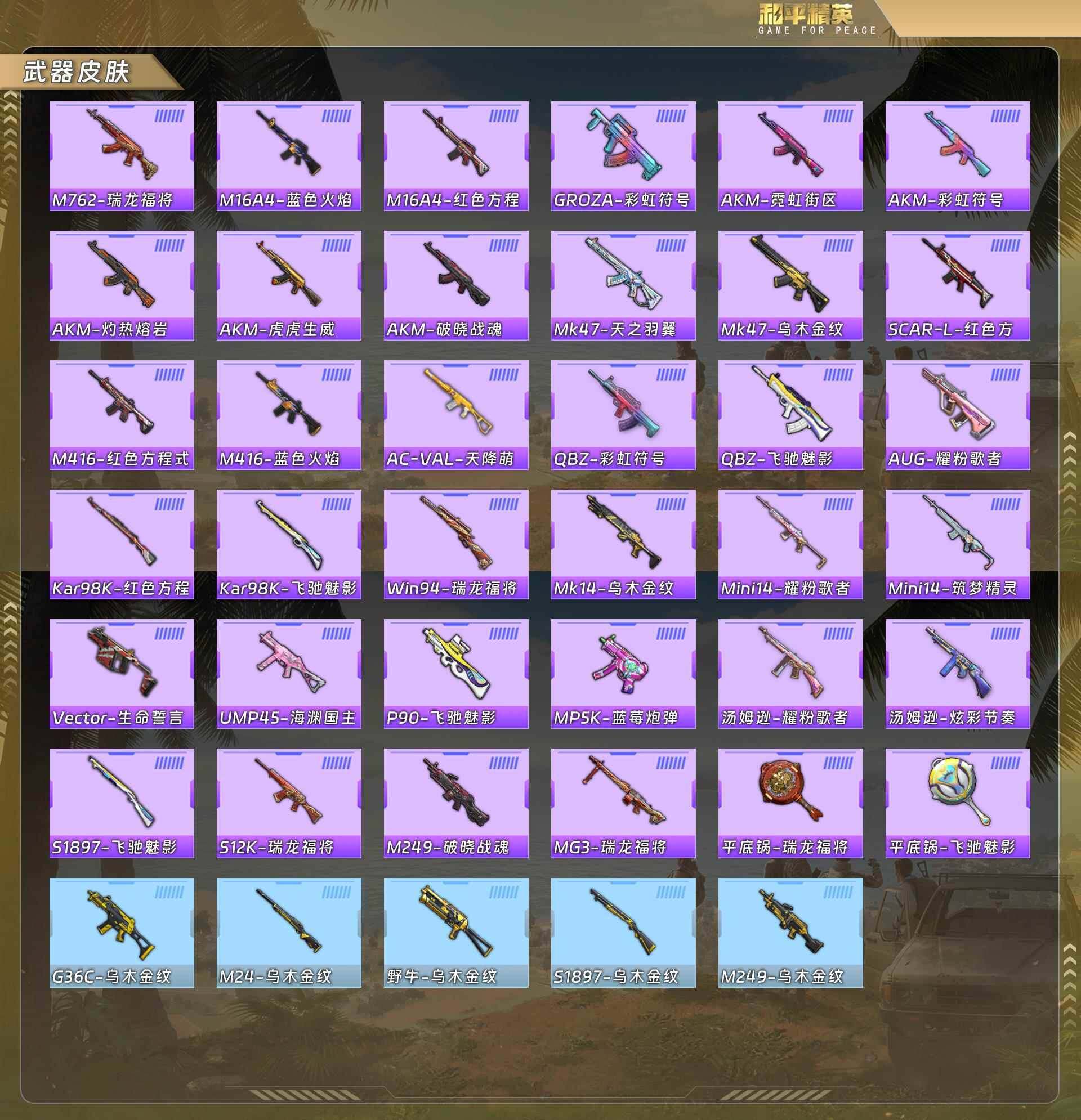 【稀有枪皮】:AKM-彩虹符号,AKM-灼热熔岩,AKM-破晓战魂,AKM-虎虎生威,AKM-霓虹街区,M16A4-红色方程式,M16A4-蓝色火焰,SCAR-L-红色方程式,M416-红色方程式,M416-蓝色火焰,
