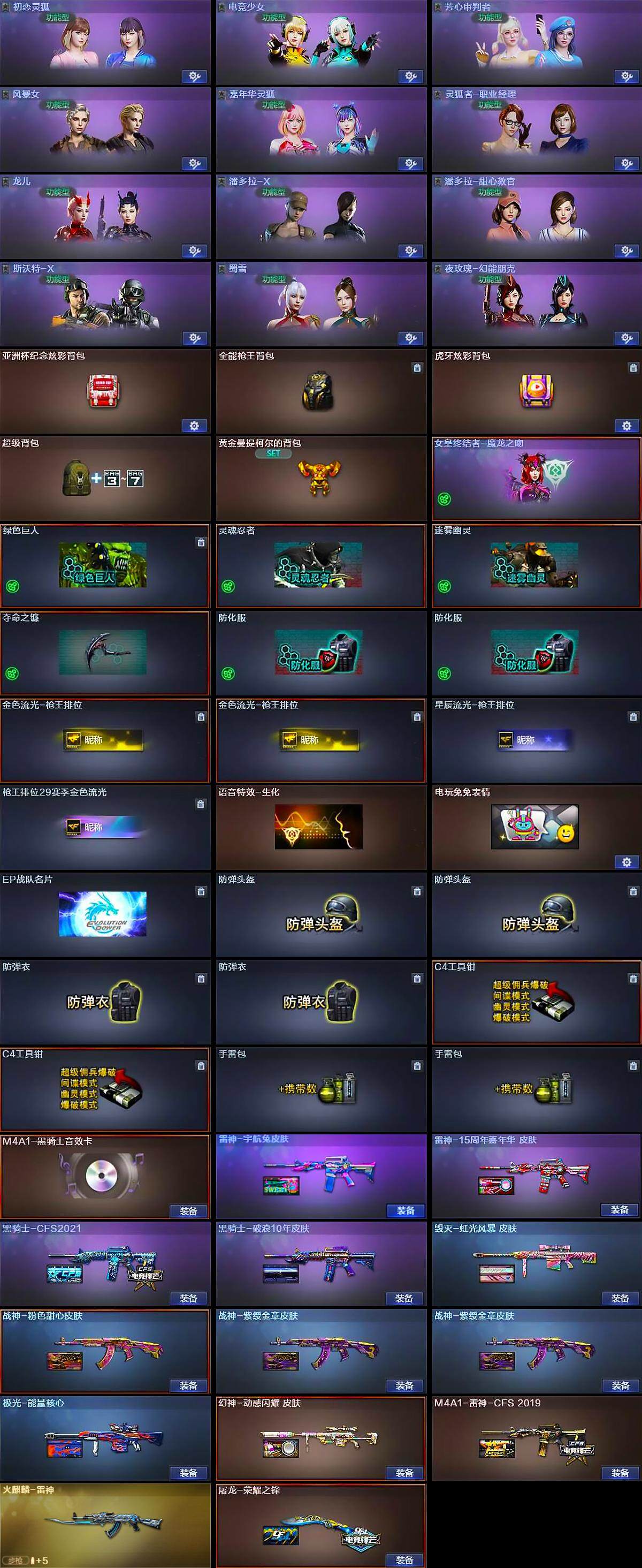 【皮肤】:幻神-动感闪耀 皮肤,M4A1-雷神-CFS 2019,雷神-宇航兔皮肤,雷神-15周年嘉年华 皮肤,火麒麟-雷神,毁灭-虹光风暴 皮肤,黑骑士-CFS2021,黑骑士-破浪10年皮肤,战神-