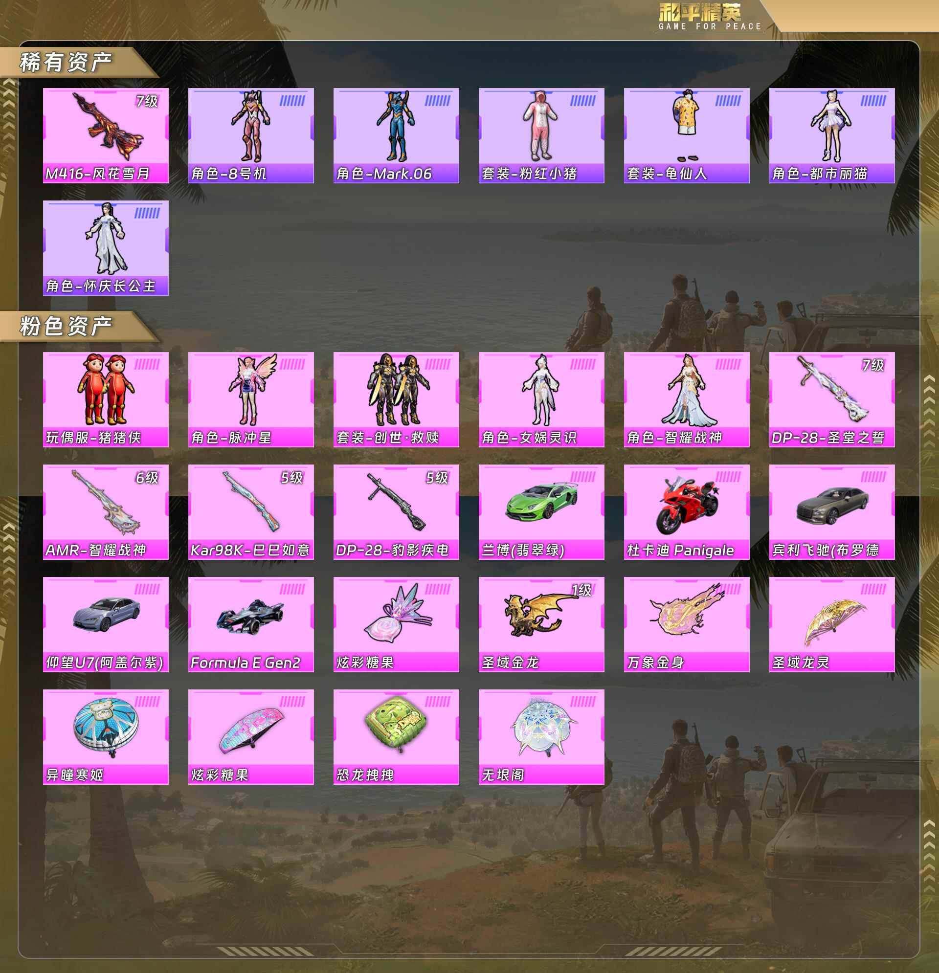 (5粉套5粉枪5载具)粉螳螂/蓝螳螂/粉红小猪/都市丽猫/怀庆长公主/玩偶服-猪猪侠/脉冲星/创世·救赎/女娲灵识/智耀战神【枪皮】DP28圣堂之誓7级/AMR智耀战神6级/98K巳巳如意5级/DP28豹影疾电5级/M4风花雪月7级【载具】兰博基尼(绿)/杜卡迪(杜卡迪红)/宾利飞驰/仰望U7(阿盖尔紫)/Formula E Gen2(幽光蓝) 没战神框 HP4183-3粉色飞行器-54087热