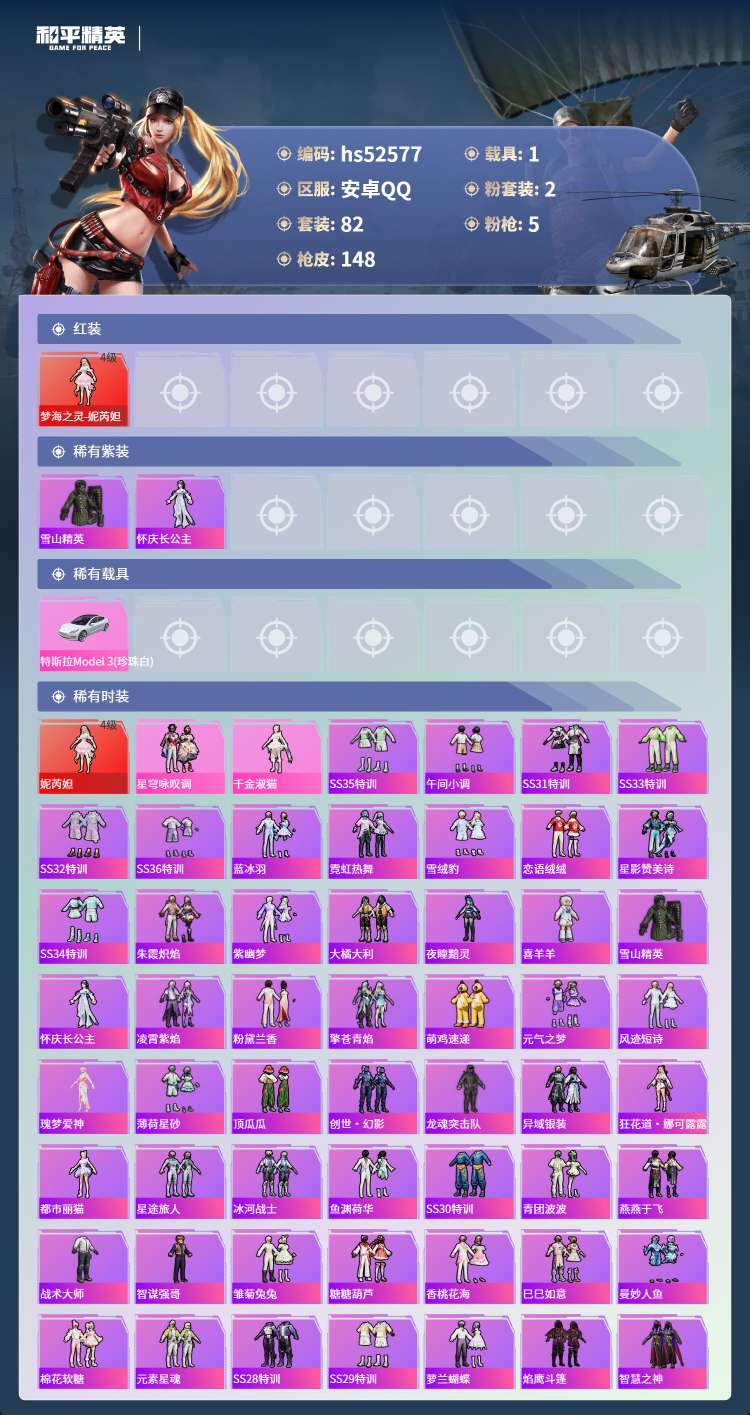 hs52577 安卓手Q-3王牌印记-1红装-2粉装-5特效枪-1载具-46517热力值-82套装-