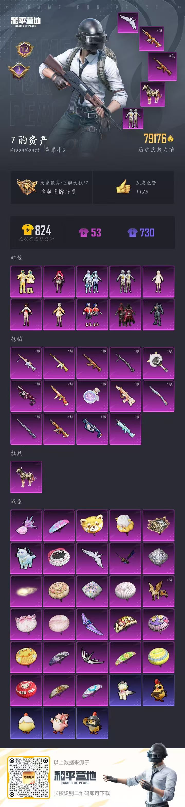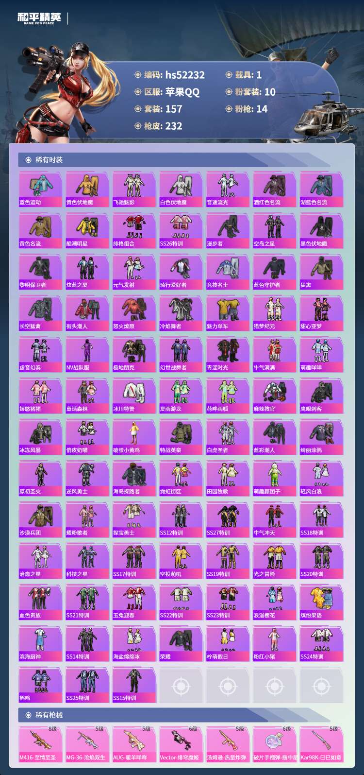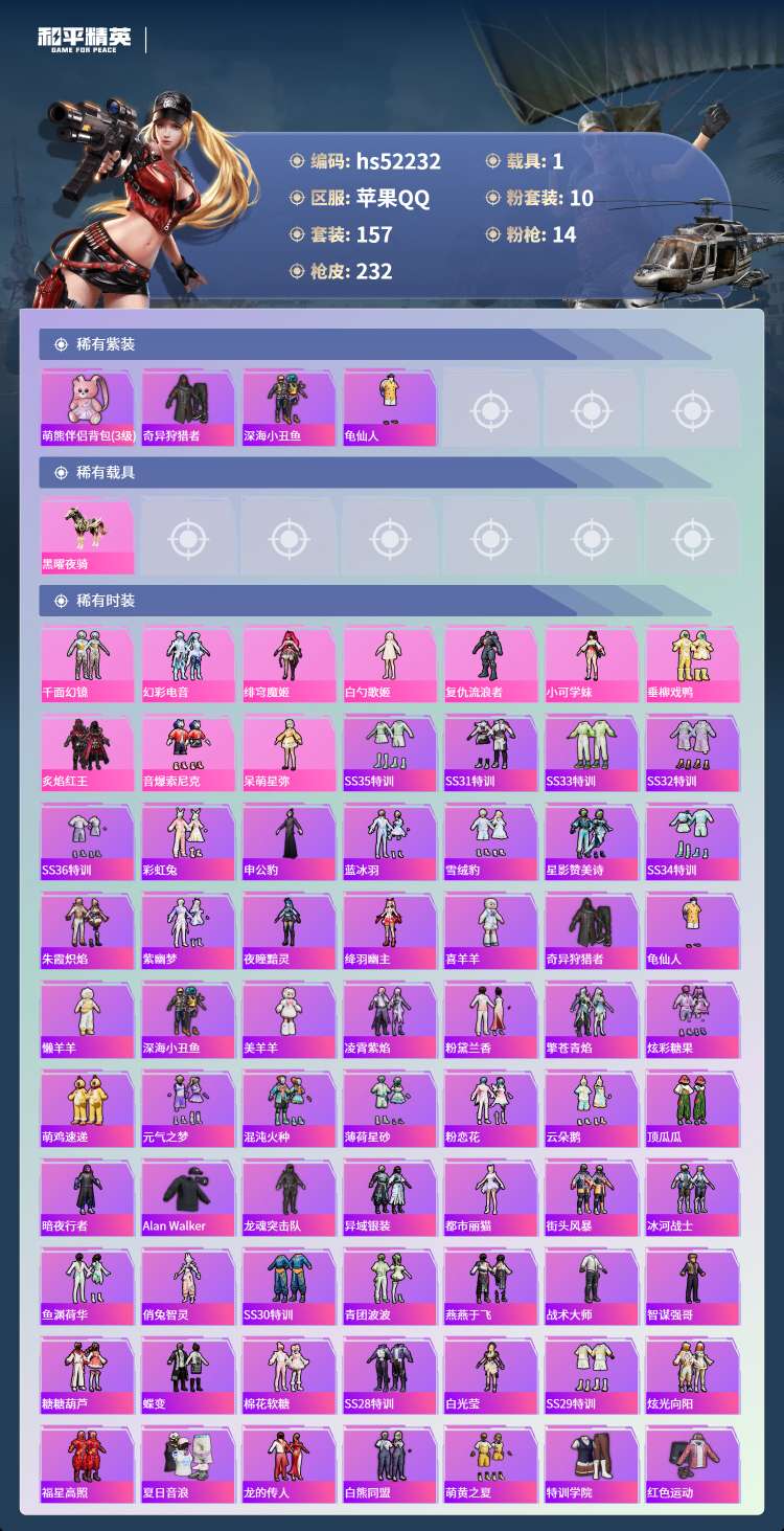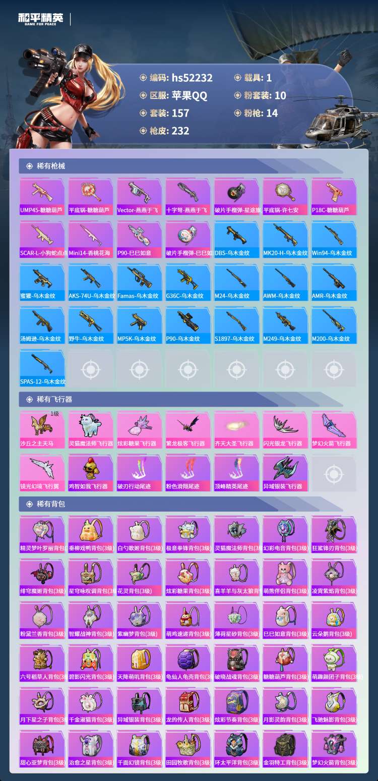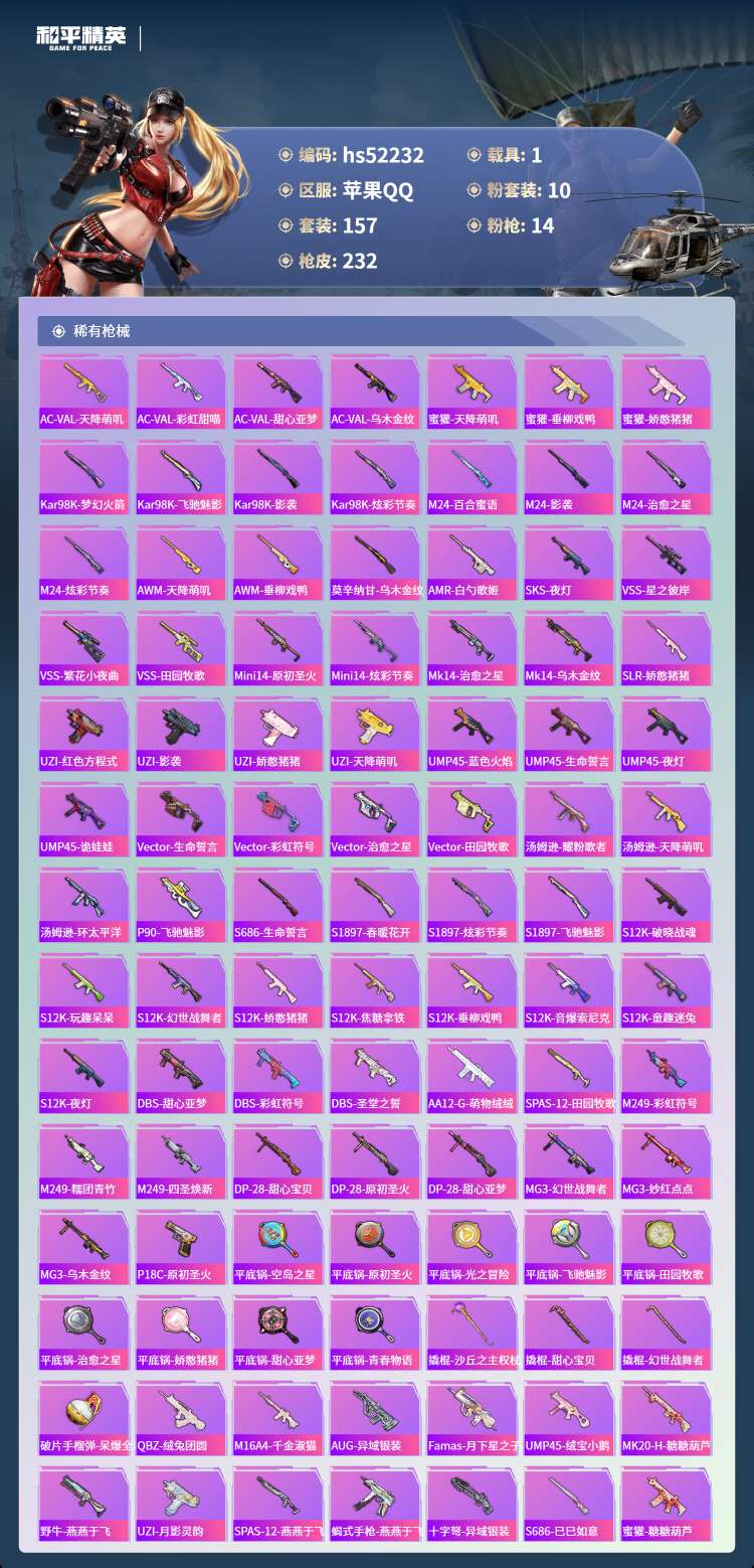 hs52232 苹果手Q-12王牌印记-10粉装-14特效枪-1载具-79176热力值-157套装-
