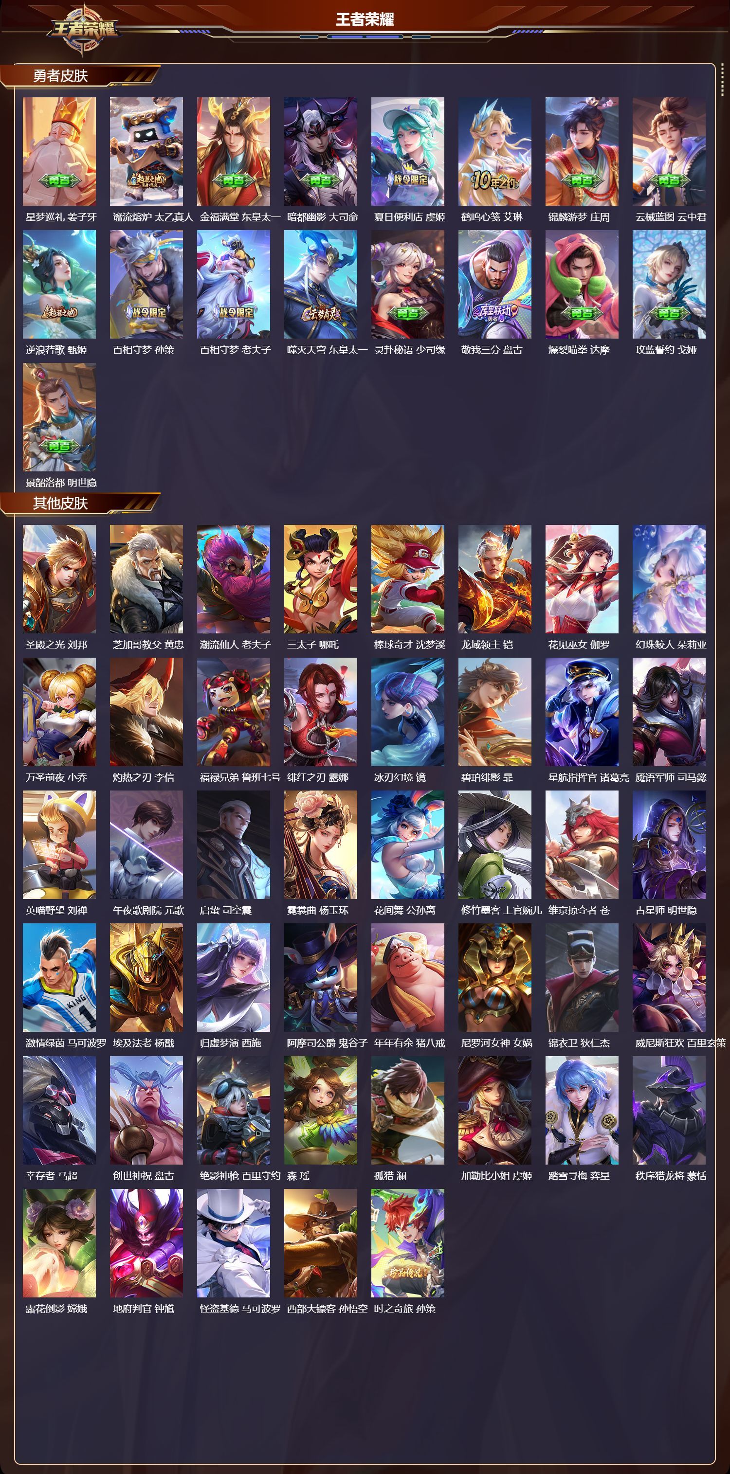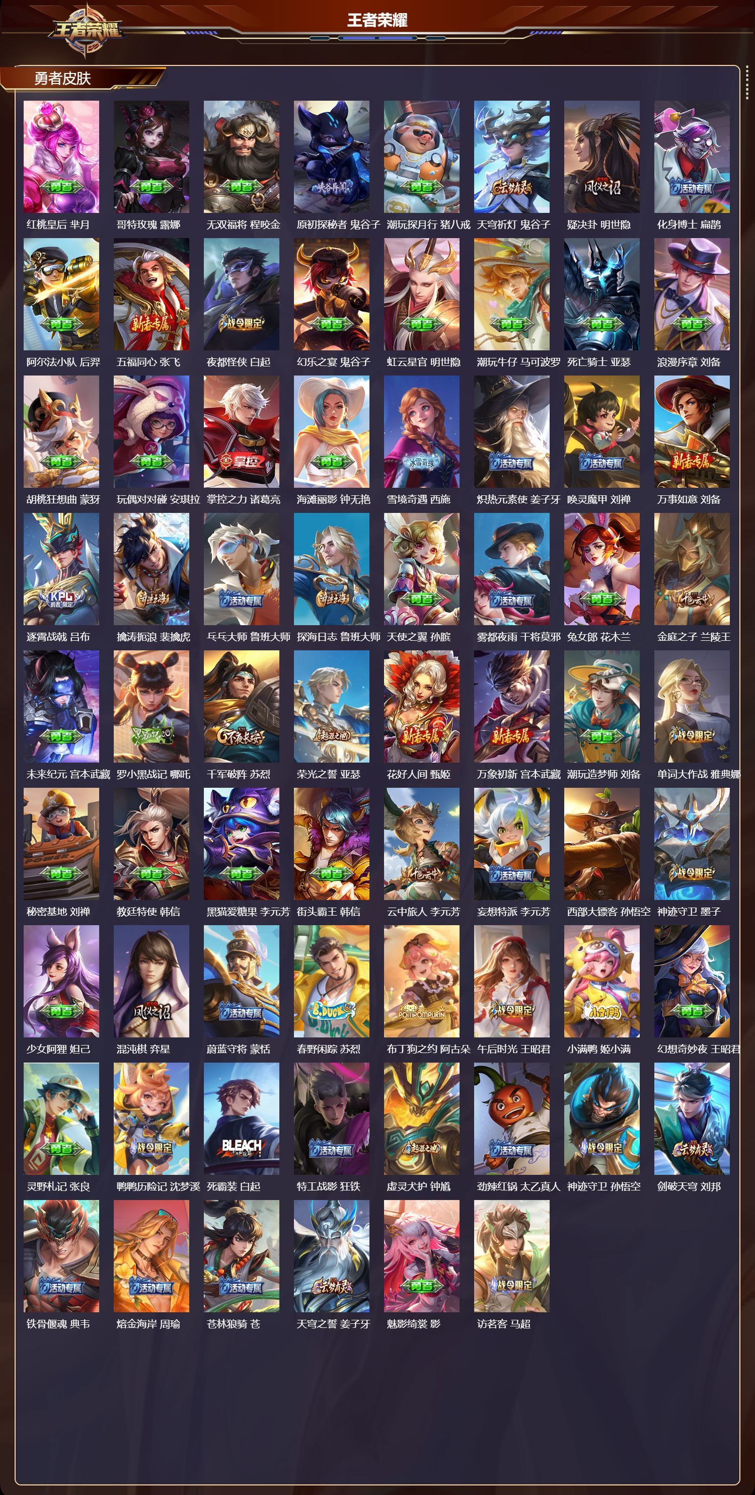 安卓QQ/最强王者/269皮肤/124英雄/1典藏/0珍品无双/0无双/2珍品传说/23传说/84史