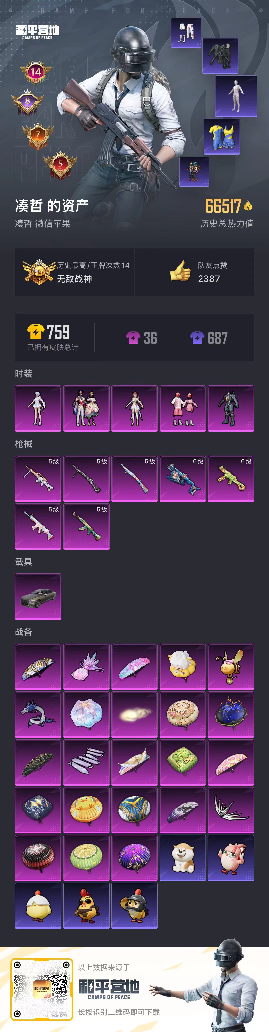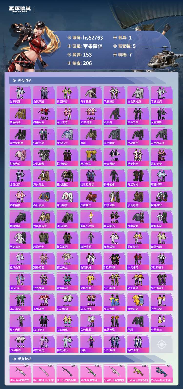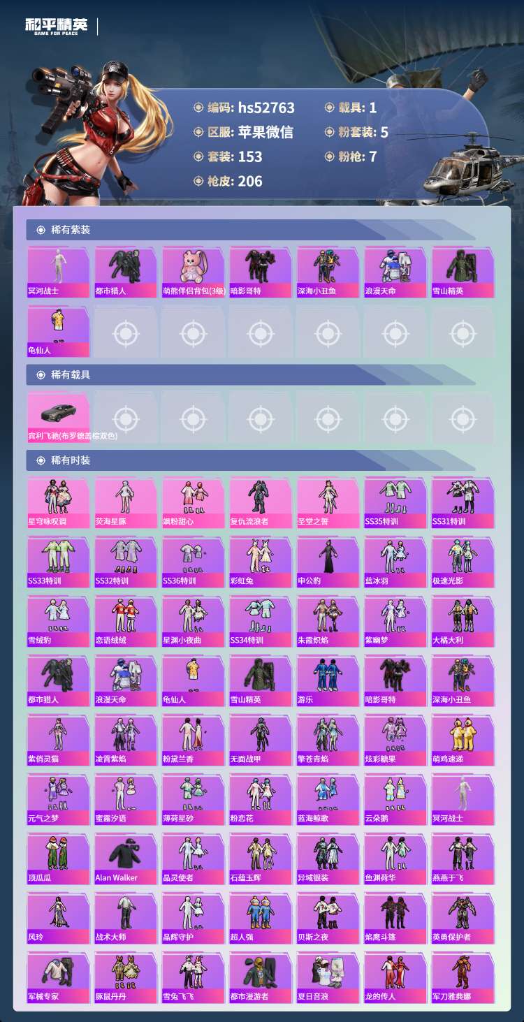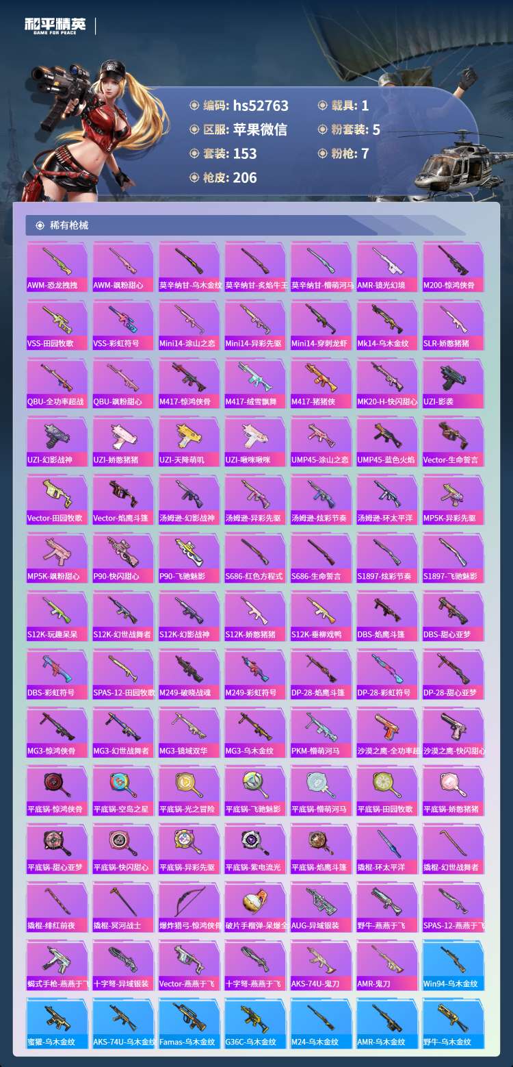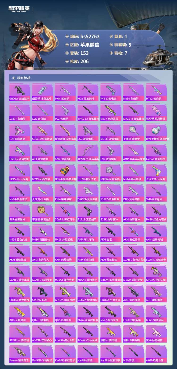 hs52763 苹果微-14王牌印记-有战神框-5粉装-7特效枪-1载具-66517热力值-153
