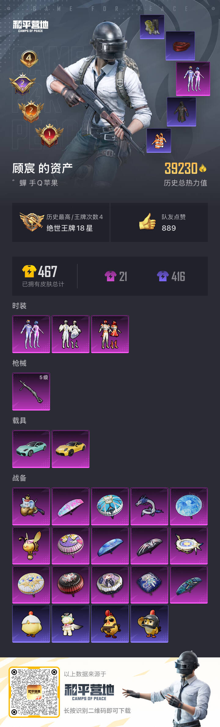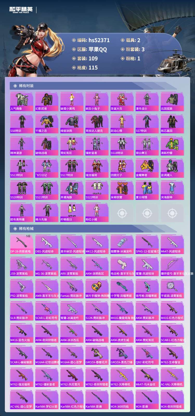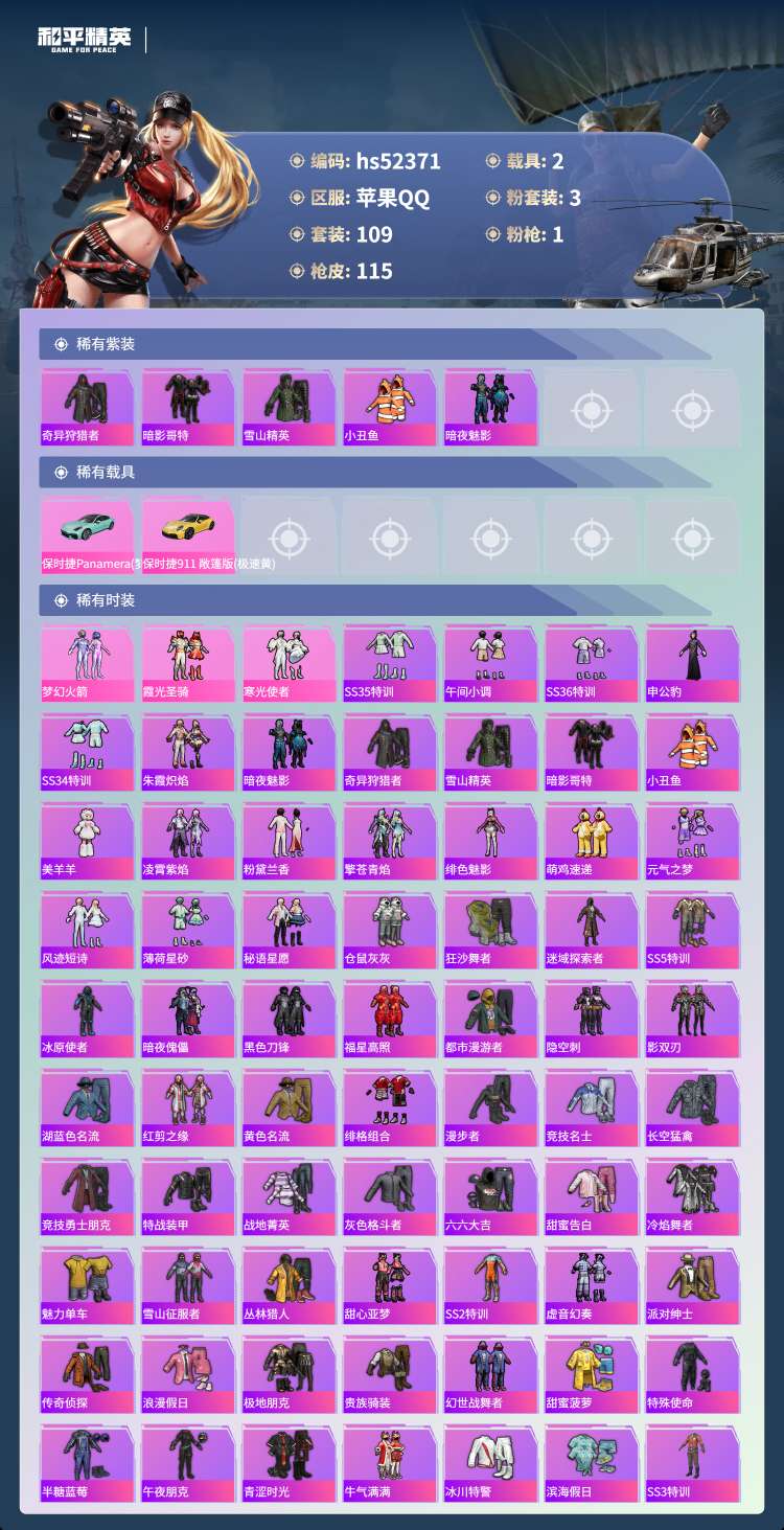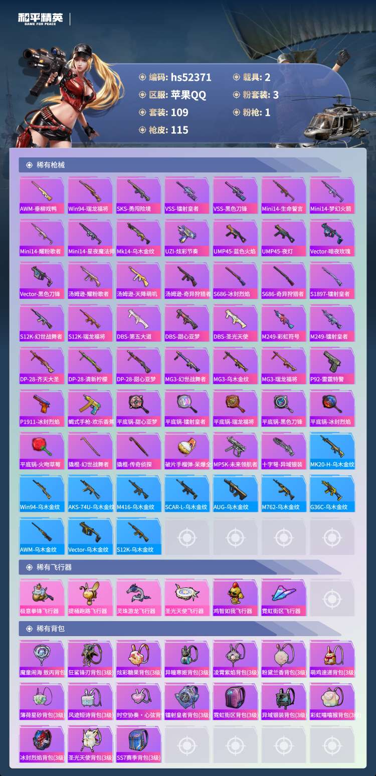 hs52371 苹果手Q-4王牌印记-3粉装-1特效枪-2载具-39230热力值-109套装-115