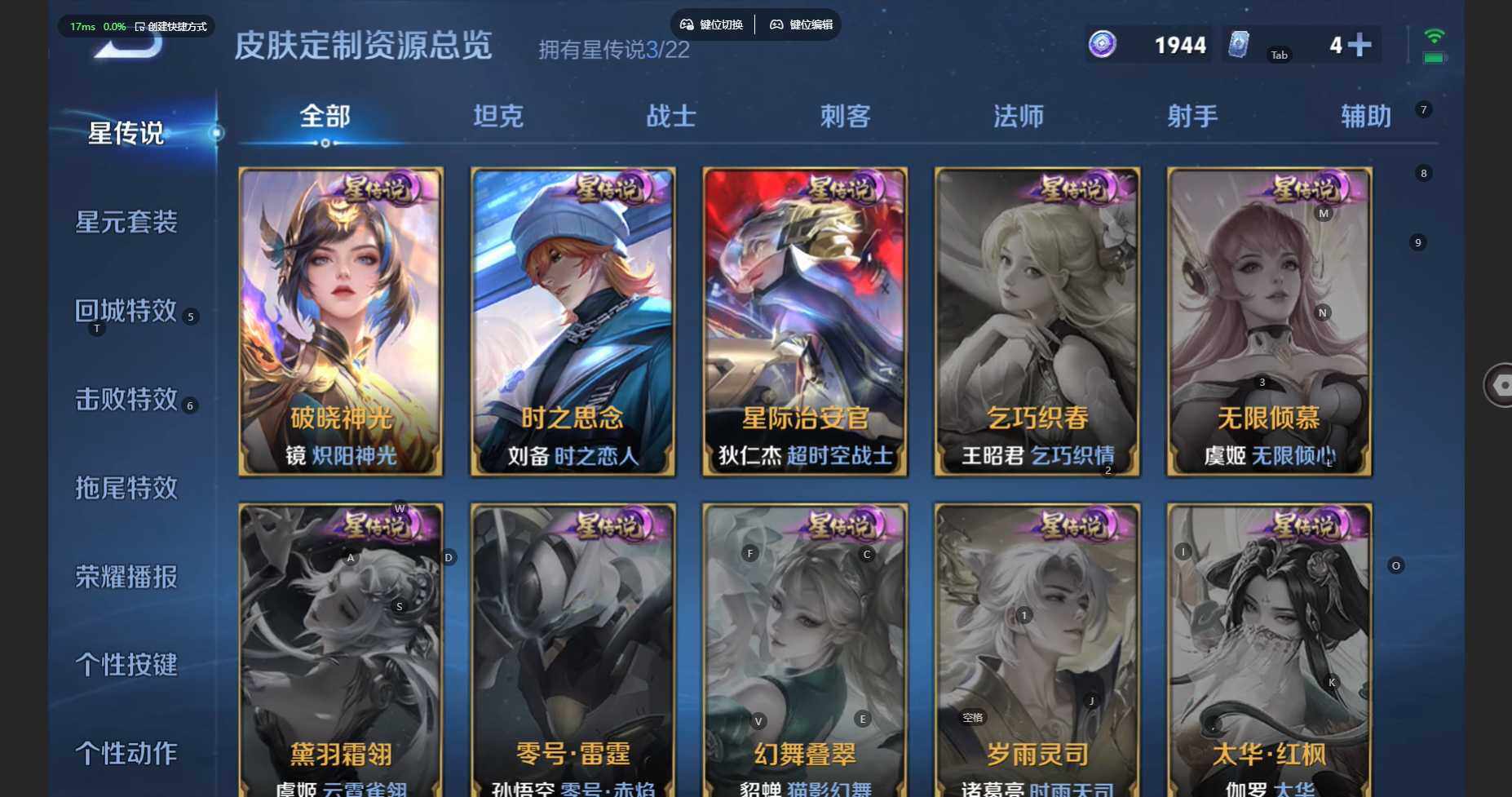 【传说皮肤】:后羿神树通天,虞姬愿照岁时盈,云缨幻光神枪,桑启鸣野蒿,赵云乘龙铭钟鼎,李信一念神魔,宫本武藏地狱之眼,狄仁杰超时空战士