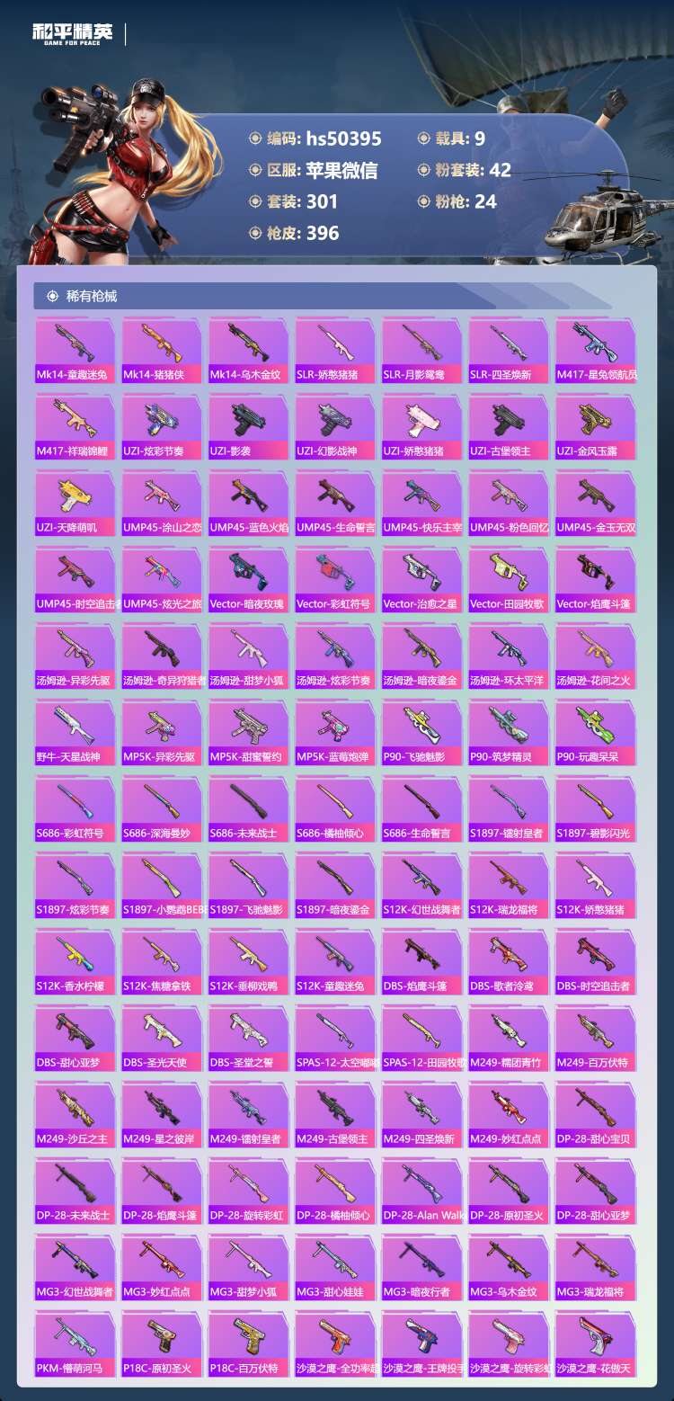 hs50395 苹果v-13王牌印记-2红装-42粉装-24特效枪-9载具-175975热力值-3