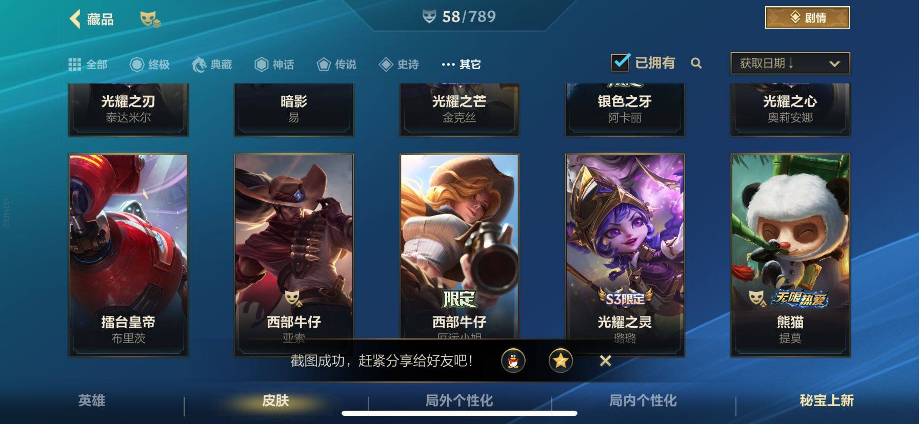 56英雄/58皮肤/1神话/2传说/15史诗/华贵铂金/