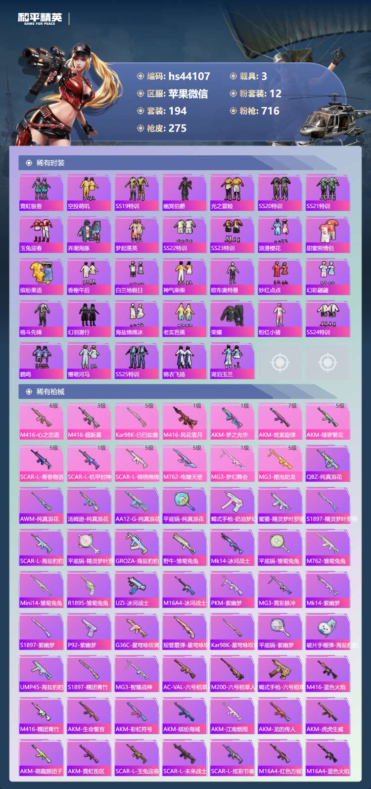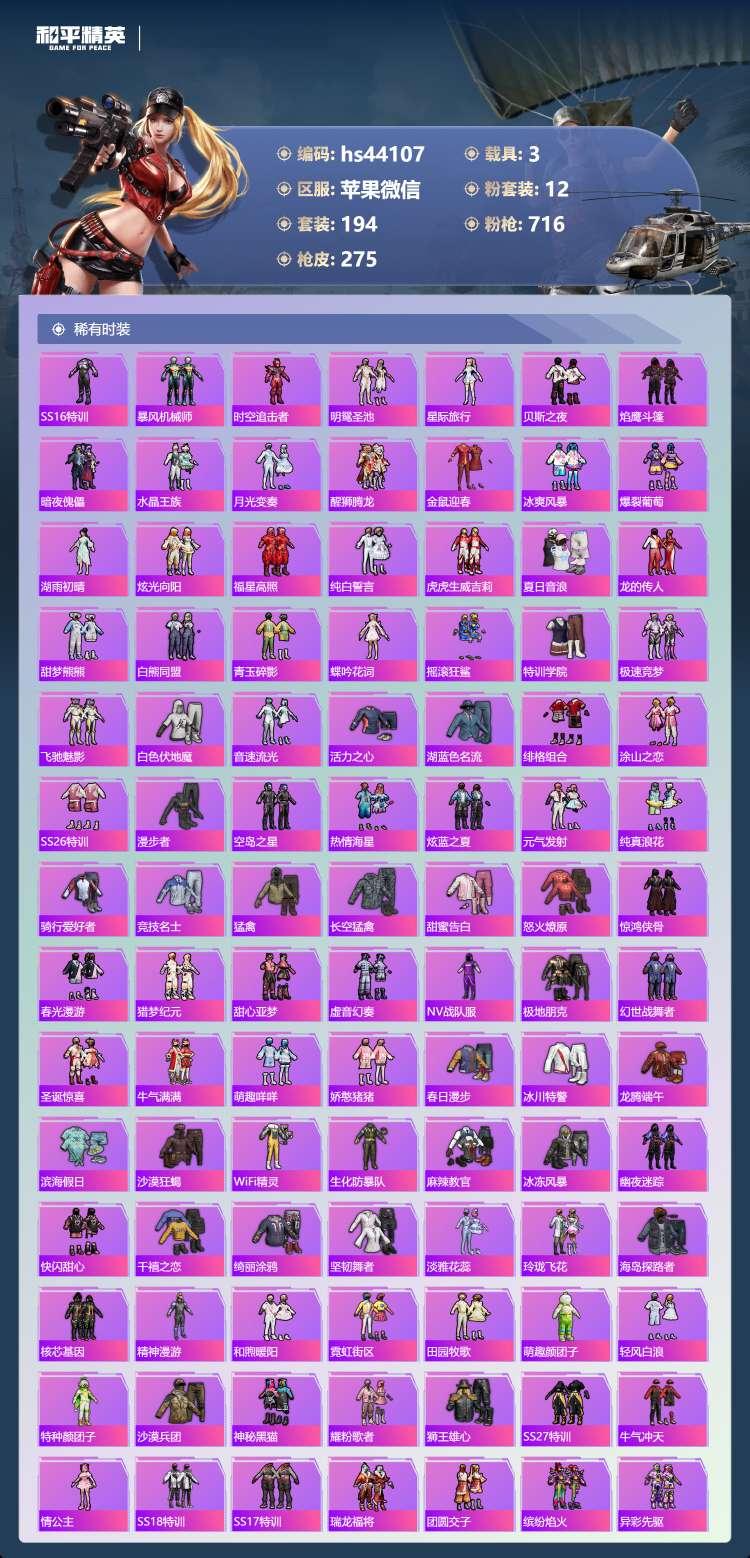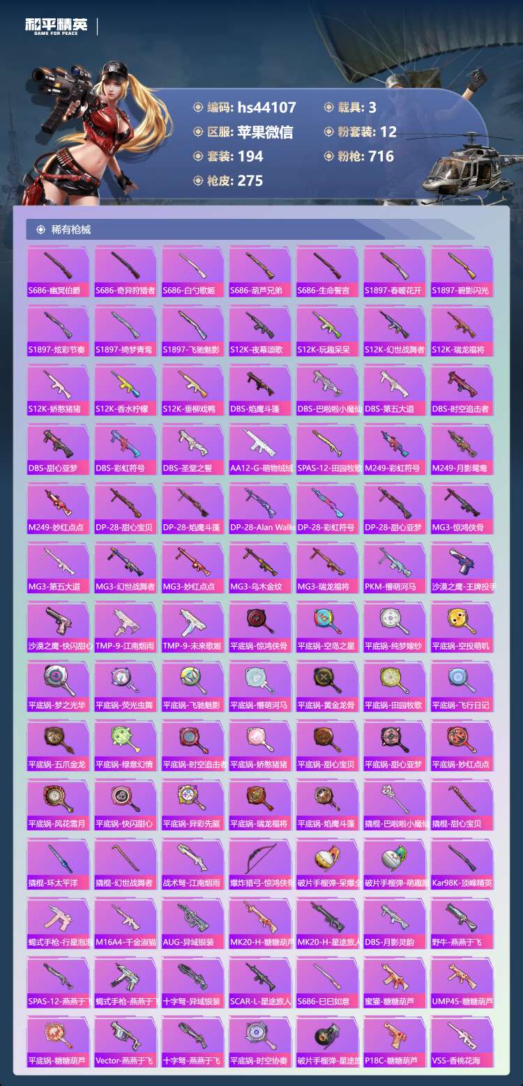 hs44107 苹果v-17王牌印记-12粉装-13特效枪-3载具-101649热力值-194套装