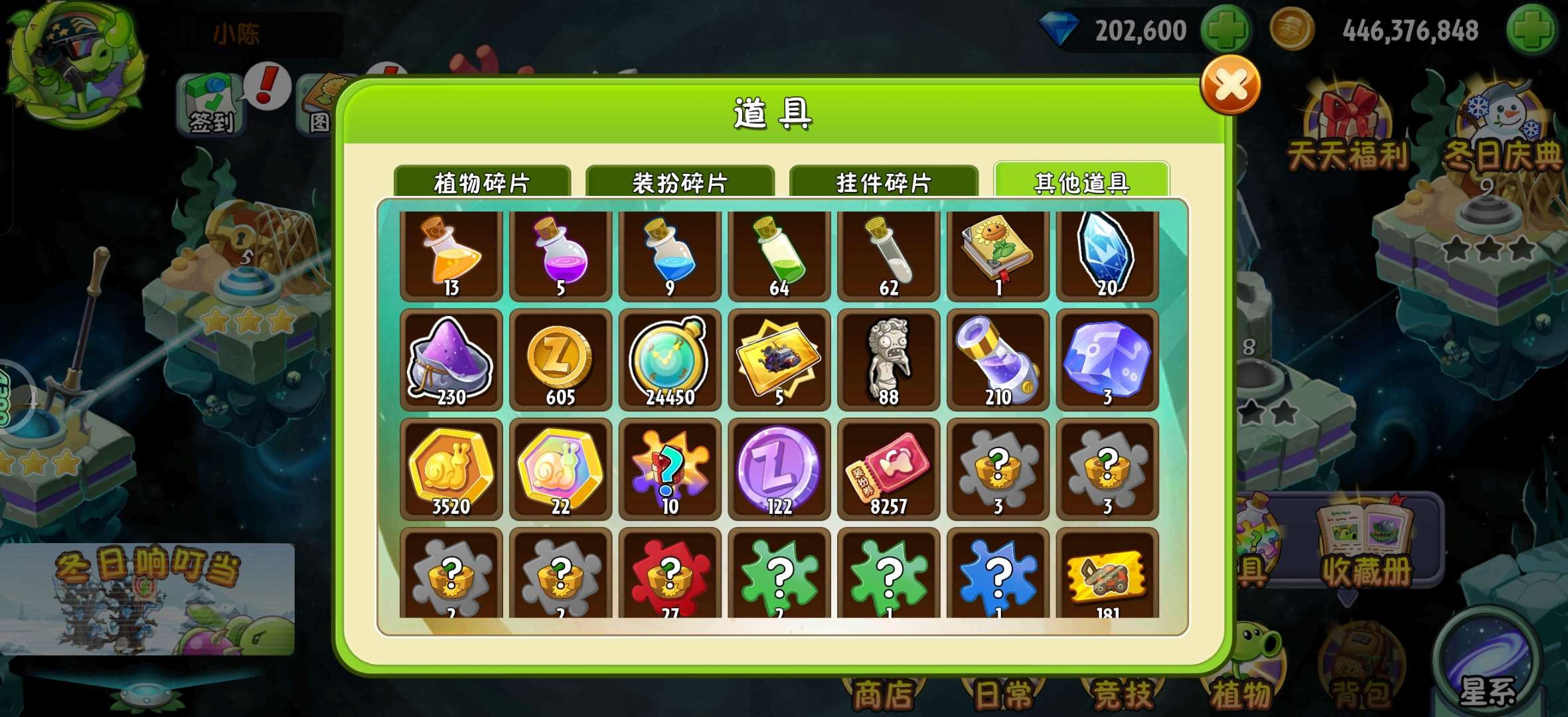植物大战僵尸2号账号有五阶茄子,冰壶兄弟,20万钻石一本升级书