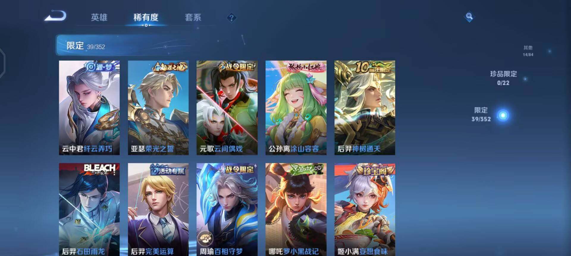 【限定皮肤】:狄仁杰阴阳师,赵云皇家上将,元歌云间偶戏,狄仁杰万华元夜,项羽海滩派对,程咬金演武夺筹