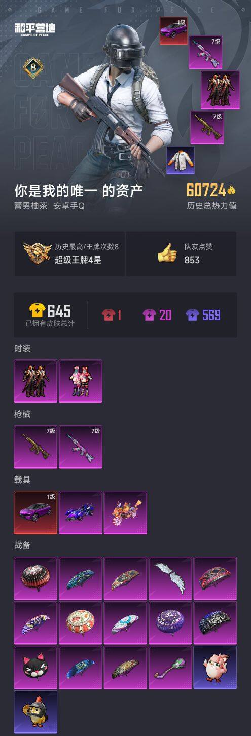 【AZH1778】安卓 手Q【巡查衣 满级炫紫旋律AKM满级五爪金龙M416 1级路特斯ELETRE(电光紫)】2粉装-2特效枪-3载具-2粉色飞行器-60724热力值-8王牌印记-135套装-174枪皮