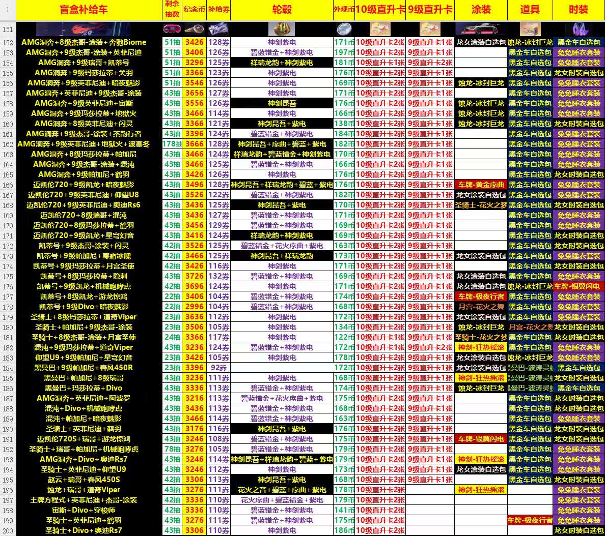 一行一个号,拍前先咨询我,绿色是王牌补给剩余多少抽出车,紫字是补给券数量,黄红字是纪念币数量
