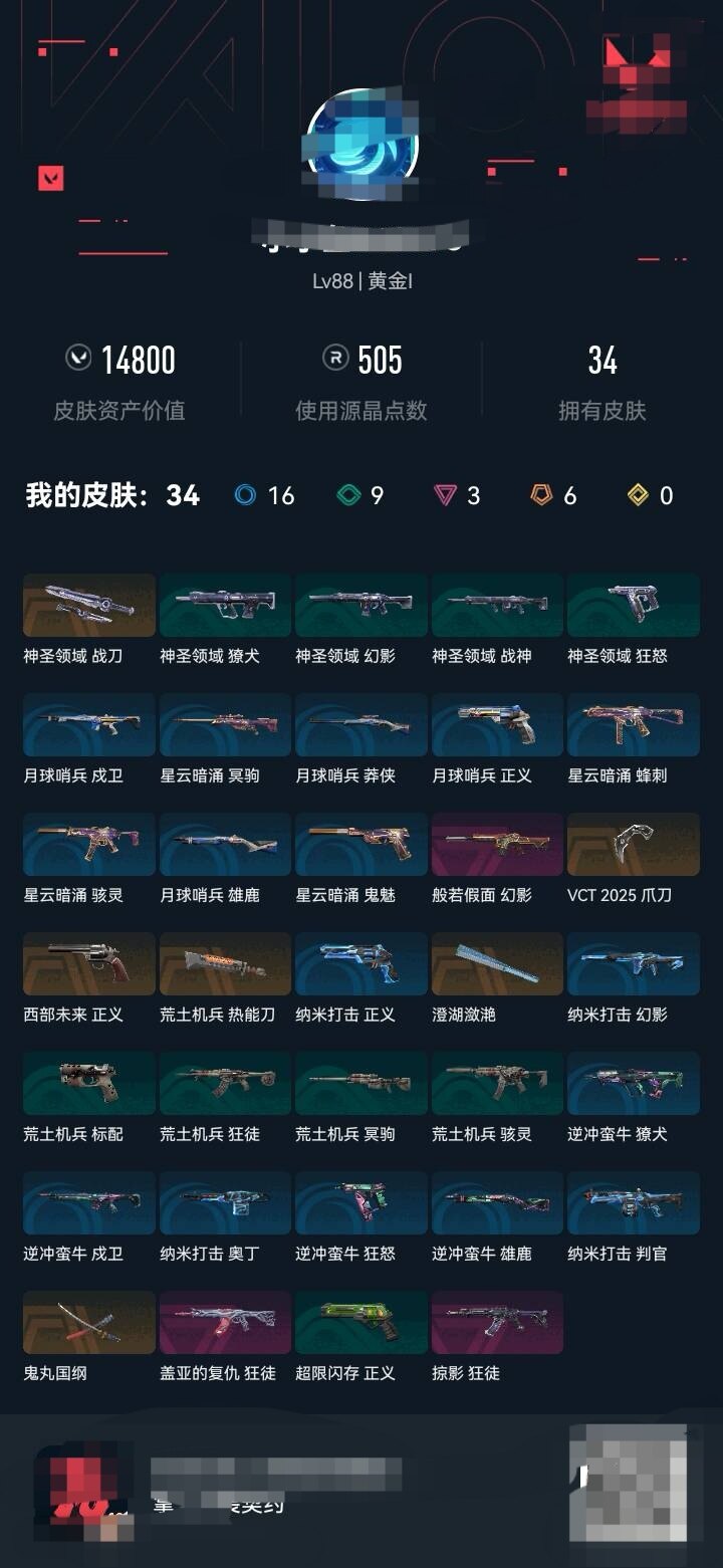 【WWN199】终极*6/卓越*3/皮肤*34/等级*88/段位:黄金/VCT 2025 赛季套装/炼狱/维斯/暮蝶/钛狐/壹决/铁臂/捷风/雷兹/幽影/不死鸟/贤者/猎枭/零/芮娜/奇乐/尚勃勒/霓虹/斯凯/夜露/星礈/K/O/盖可/黑梦/钢锁/近战武器-VCT 2025 爪刀/近战武器-澄湖潋滟/近战武器-鬼丸国纲/近战武器-荒土机兵 热能刀/近战武器-神圣领域 战刀/狂徒-掠影/狂徒-盖亚的复仇/狂徒-荒土机兵/幻影-般若假面/幻影-神圣领域/幻影-纳米打击/戍卫-逆冲蛮牛/戍卫-月球哨兵