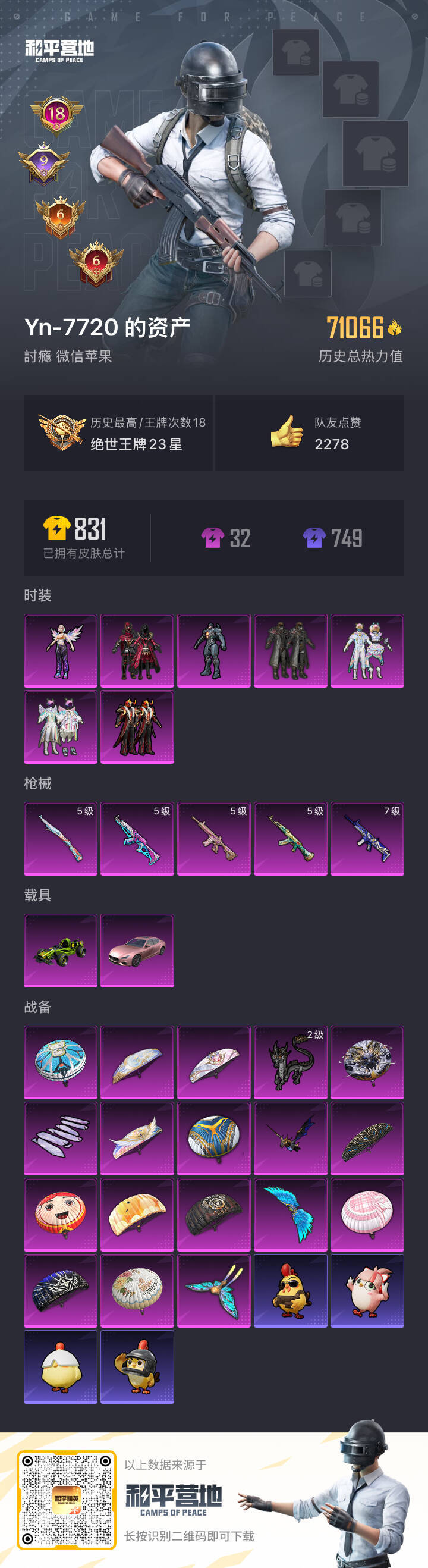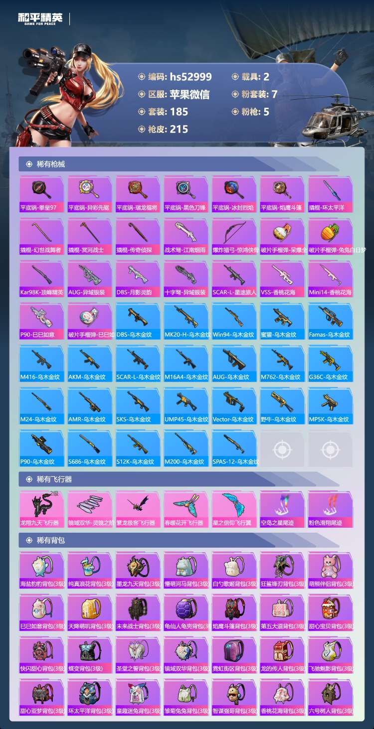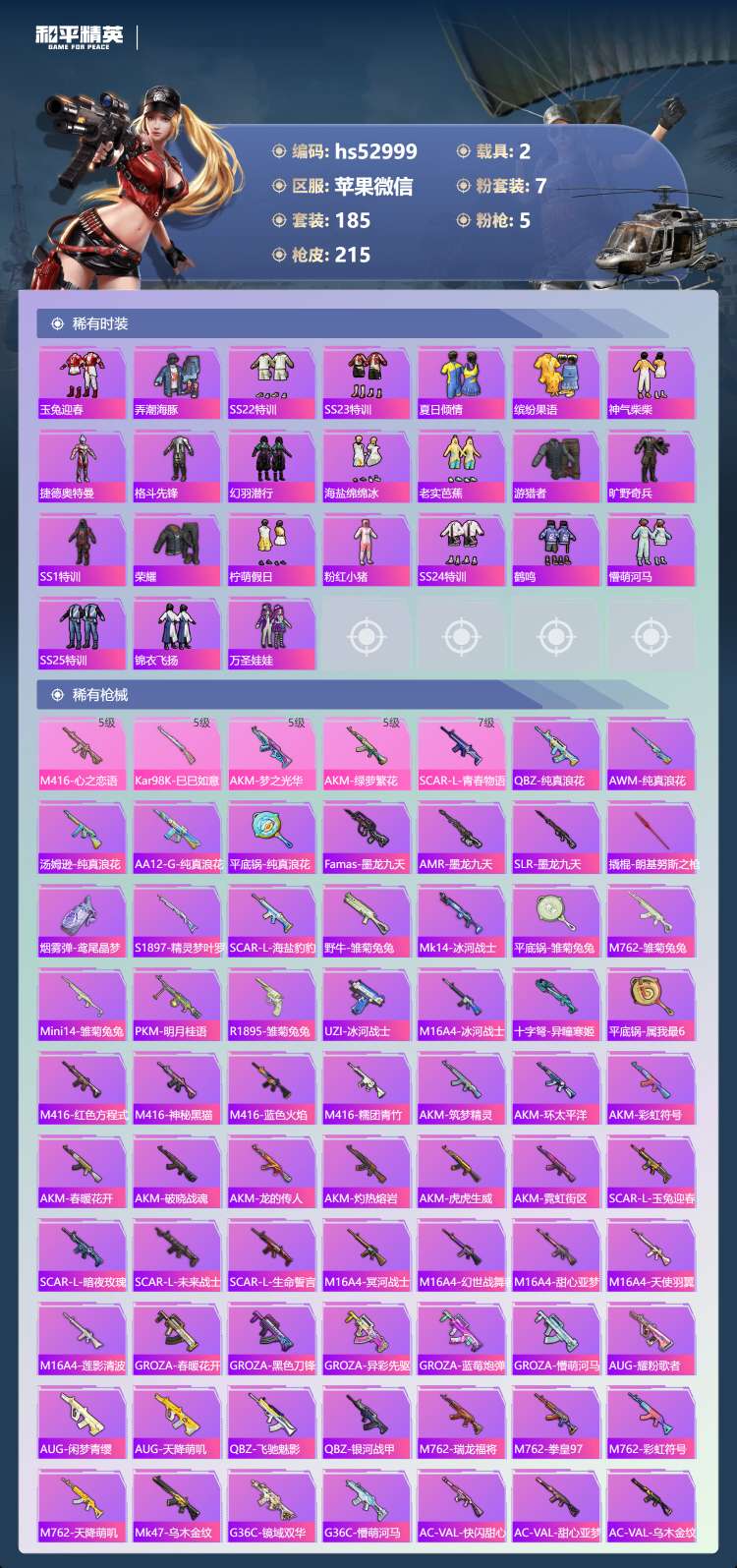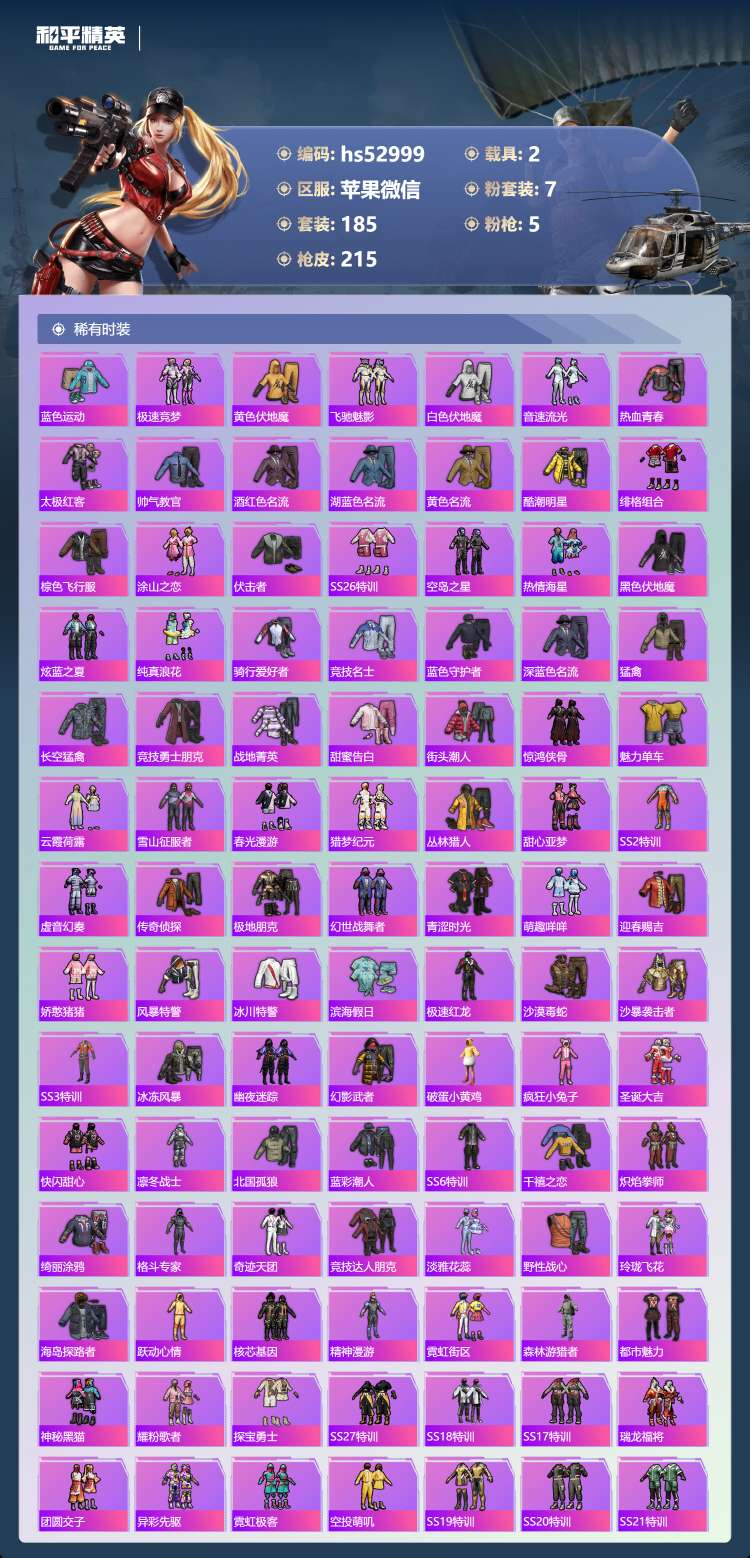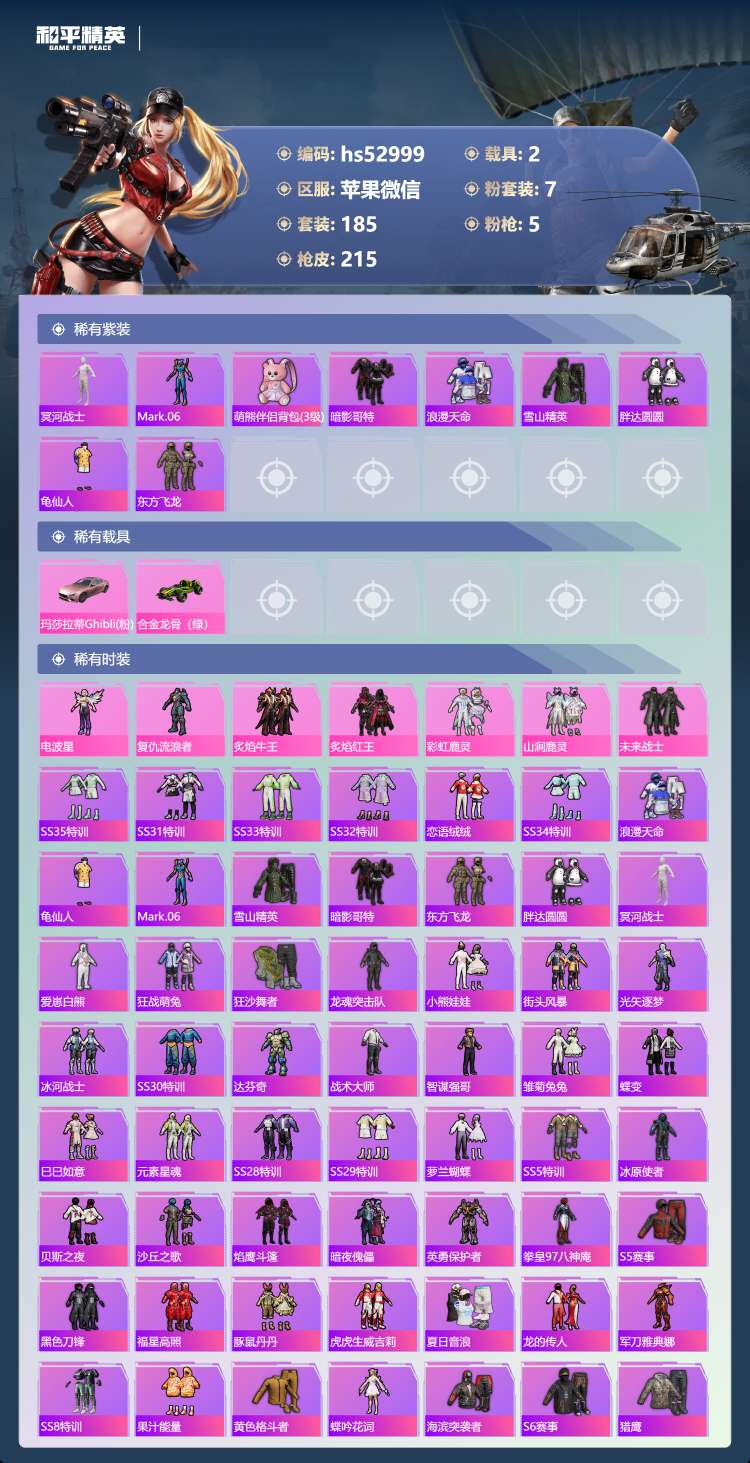 hs52999 苹果v-18王牌印记-7粉装-5特效枪-2载具-71066热力值-185套装-21