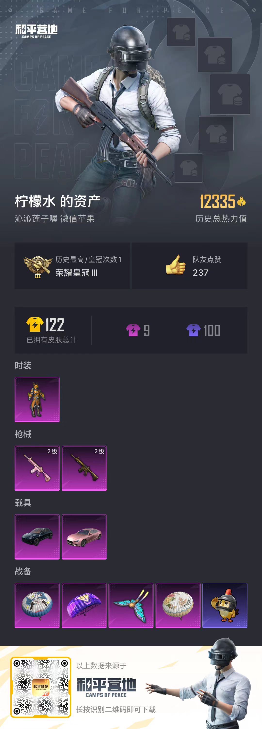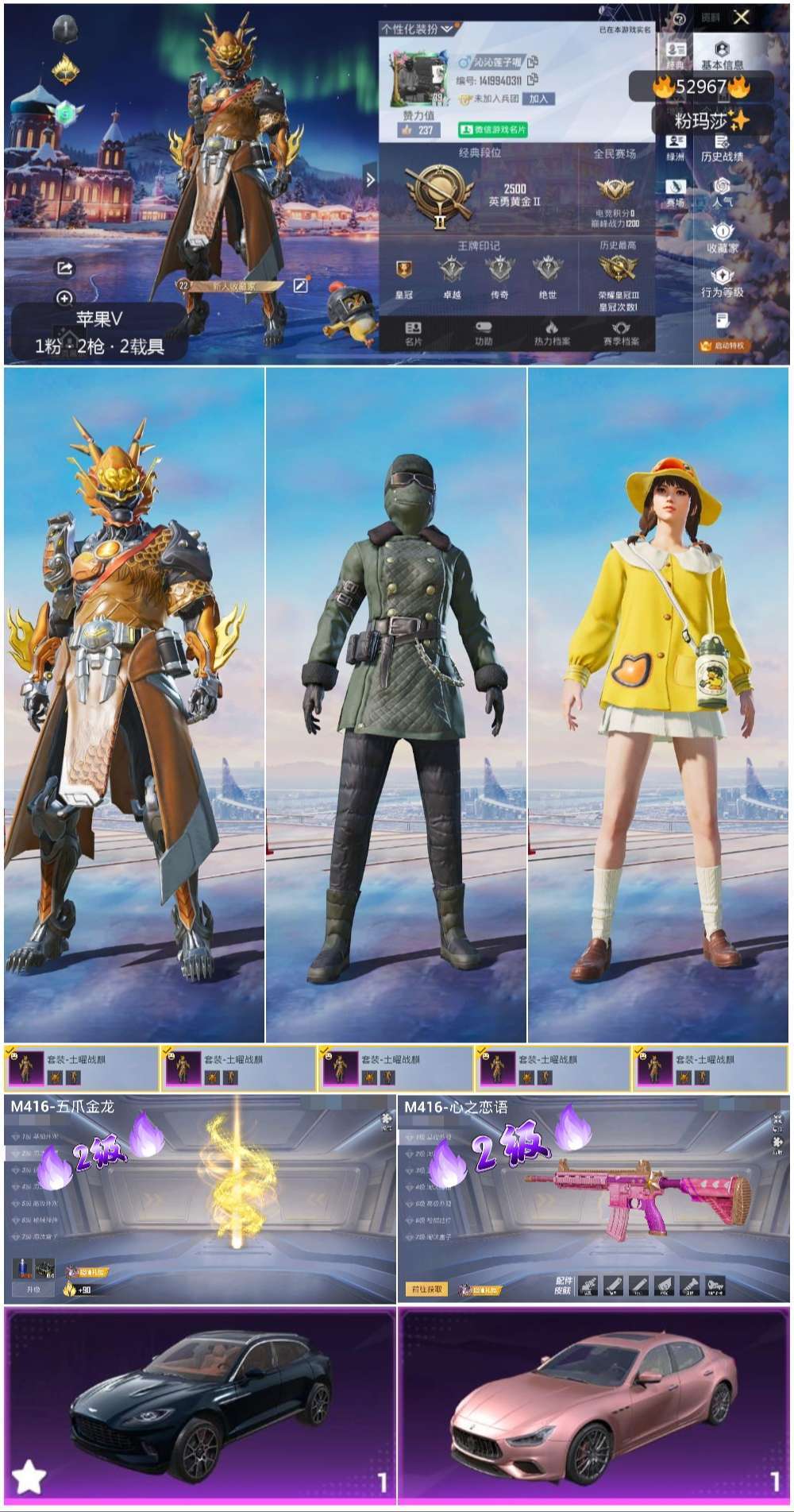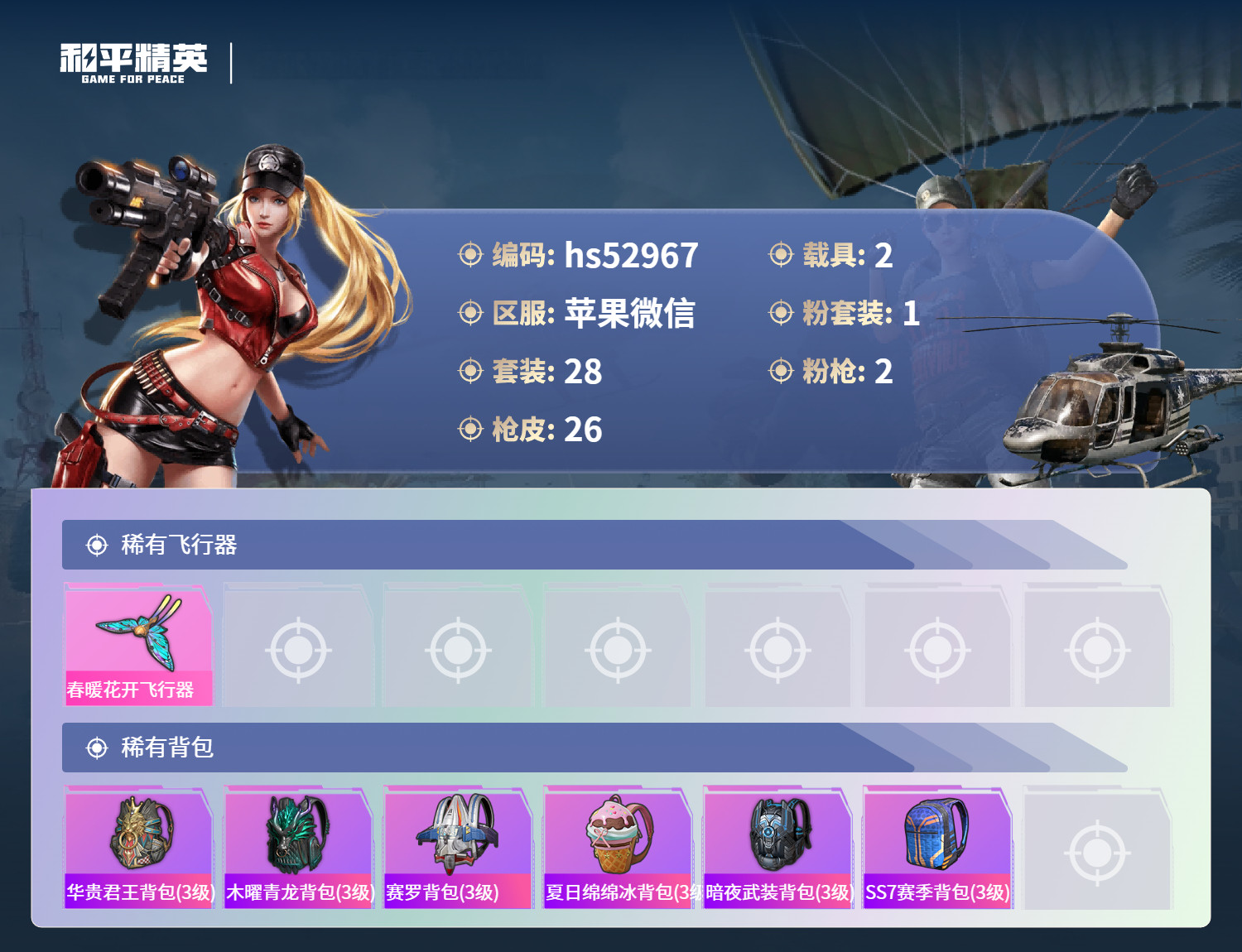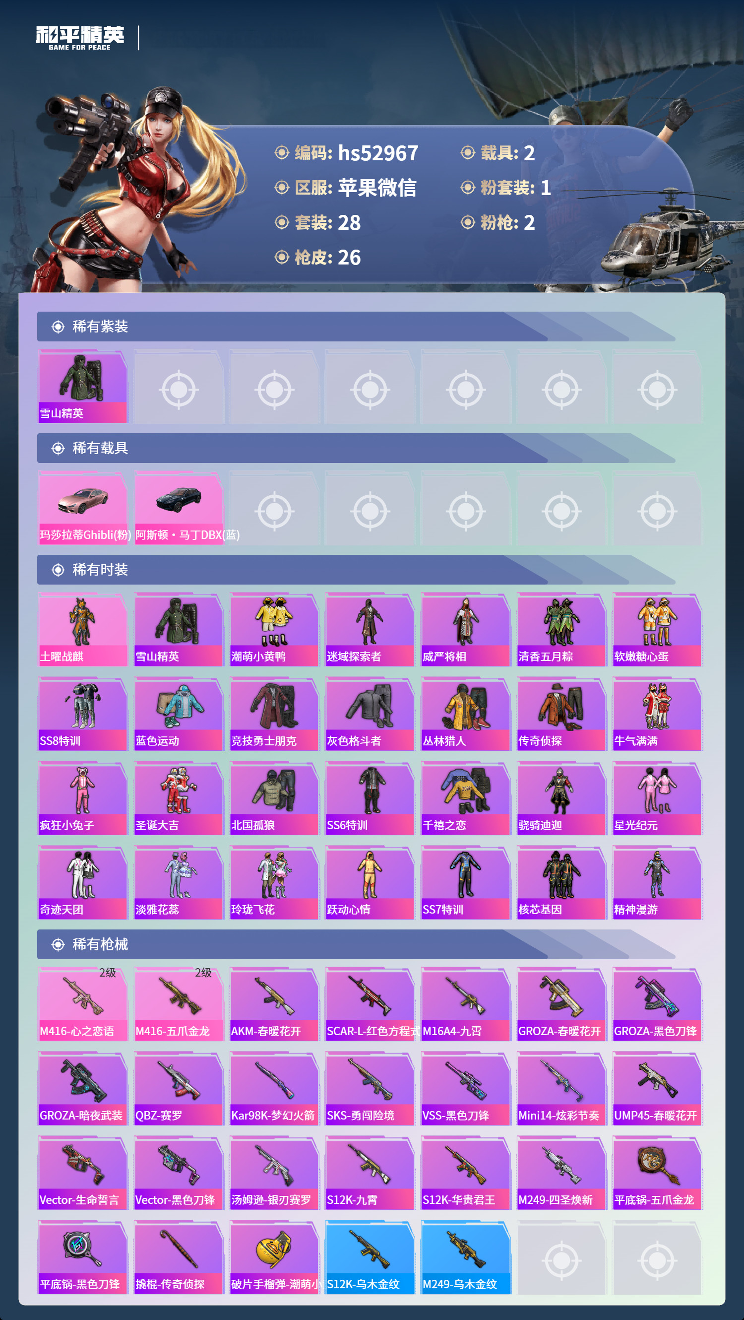 hs52967 苹果v-0王牌印记-1粉装-2特效枪-2载具-12335热力值-28套装-26枪皮