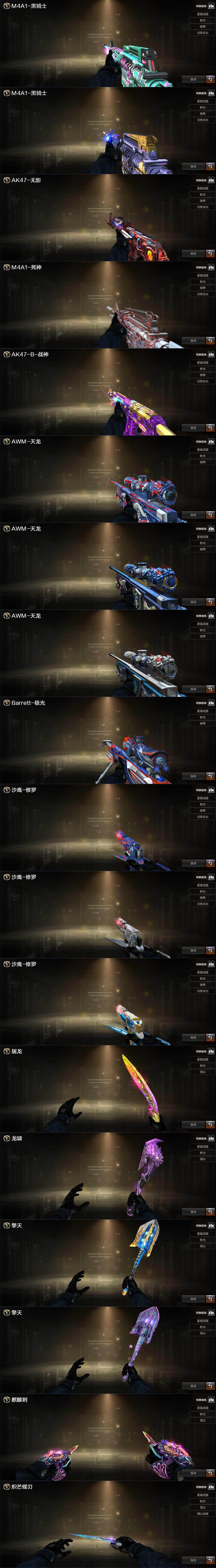 【热门武器】:传说暗裔,传说辉光,传说灵眸,G36C-幻影,QBZ03-金色蔷薇,M14EBR-玄武,Scar Light-白虎,HK417-朱雀,M4A1-青龙,M200-幻神*2,柯尔特-荣耀世冠白鲨2023,金色蔷薇-古蛇迷踪,修罗-古蛇迷踪,M200-竞技荣光,死亡之眼,