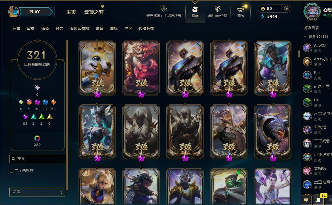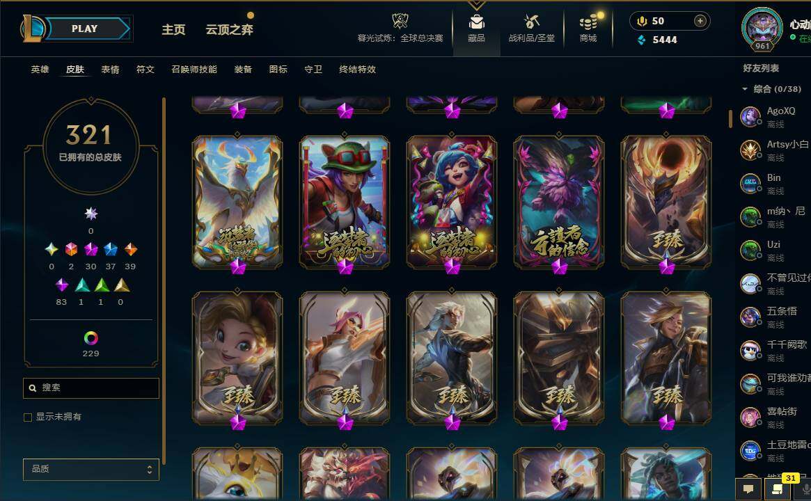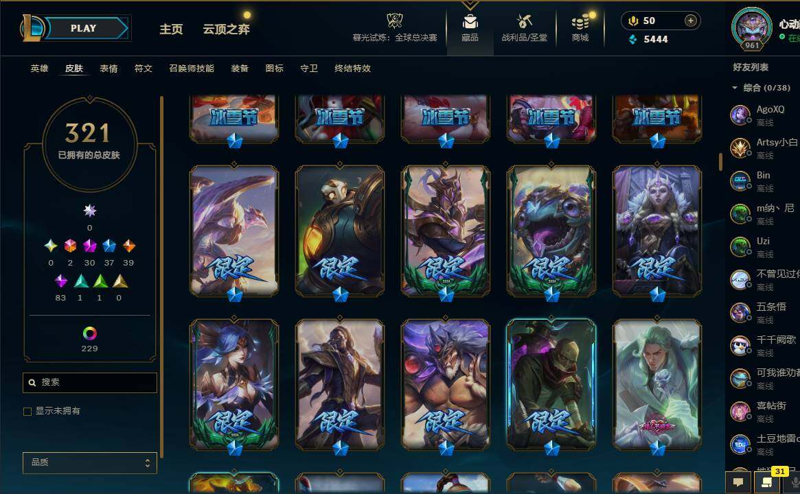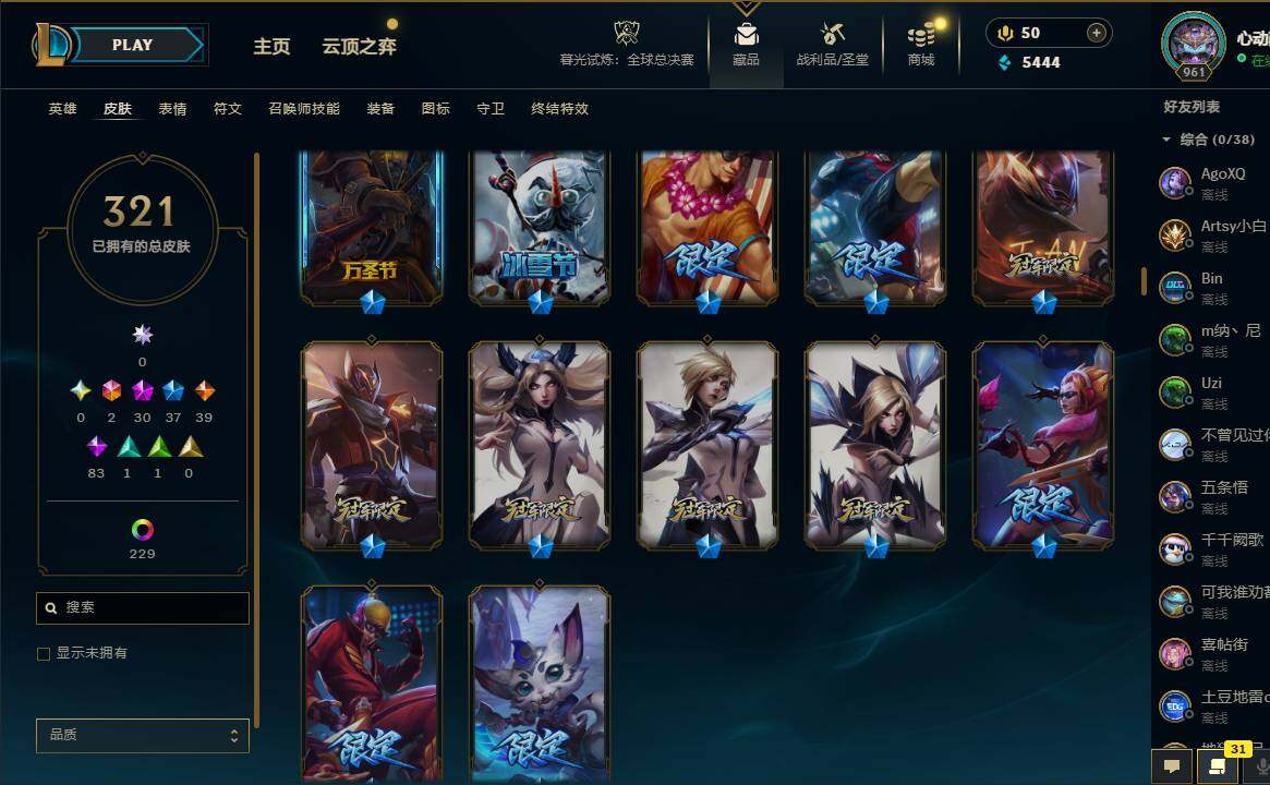 171英雄/321皮肤/2终极/30神话/37限定/3臻彩/240炫彩