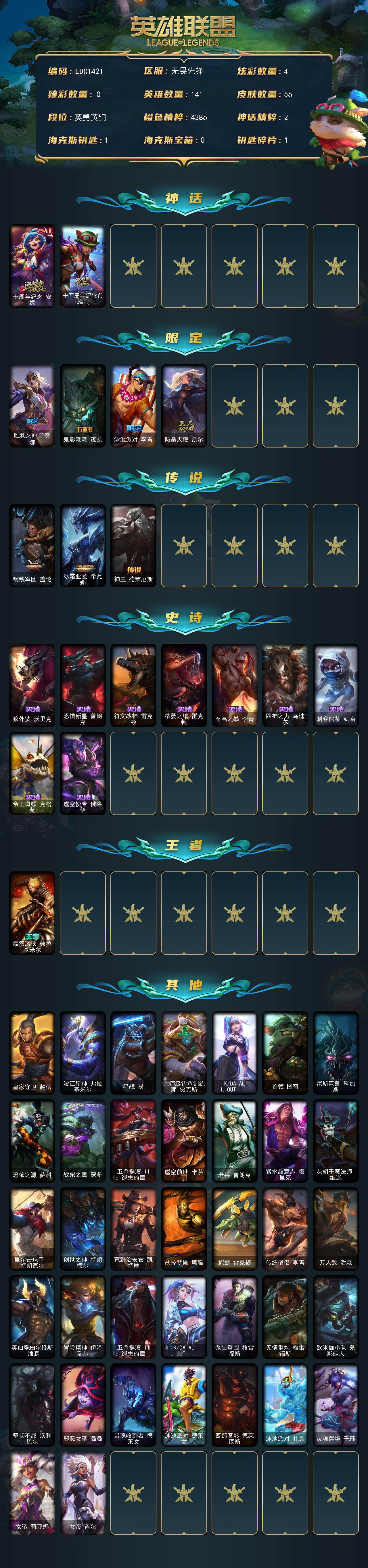 141英雄/56皮肤/2神话/4限定/4炫彩/3传说