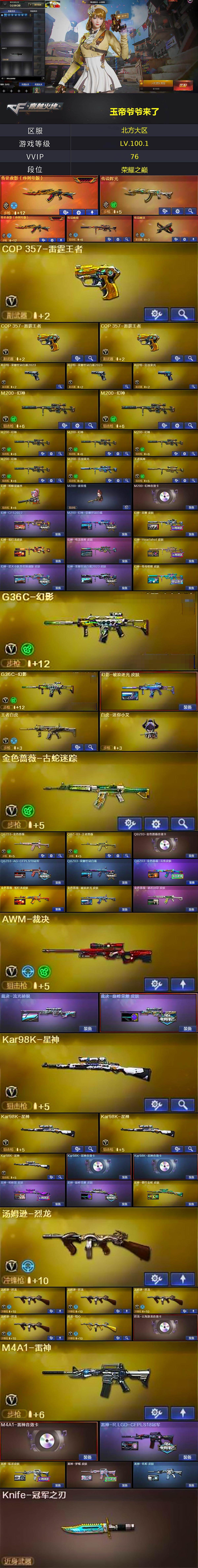 【热门武器】:传说夜影,传说辉光,传说幽瞳,传说幽冥,G36C-幻影*2,QBZ03-金色蔷薇,M200-幻神*6,柯尔特-荣耀世冠白鲨2023*2,金色蔷薇-古蛇迷踪,修罗-古蛇迷踪,M200-竞技荣光,Kar98K-星神*4,C.A.T,Cat-刀锋,牛牛-AK47,M4A1-黑骑士,汤姆逊