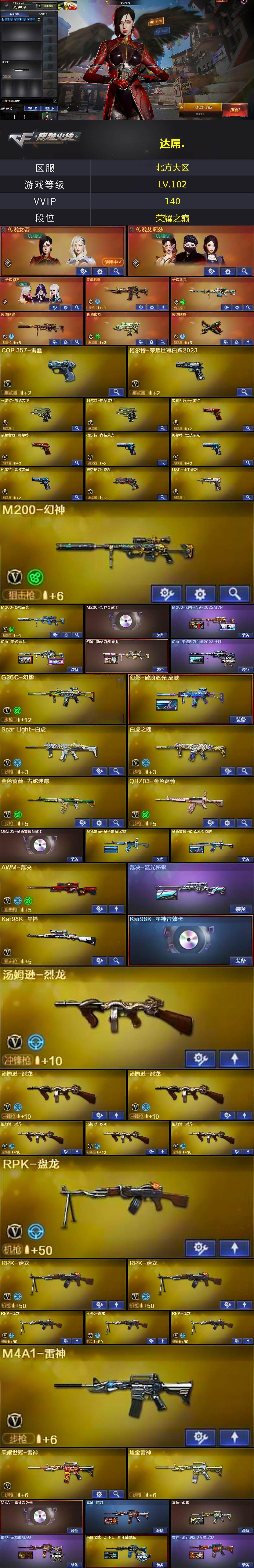 【热门武器】:传说暗裔,传说圣灵,传说幽瞳,传说破晓,传说幽冥,G36C-幻影,QBZ03-金色蔷薇,M14EBR-玄武,Scar Light-白虎,M4A1-青龙,M200-幻神,柯尔特-荣耀世冠白鲨2023,金色蔷薇-古蛇迷踪,修罗-古蛇迷踪,M