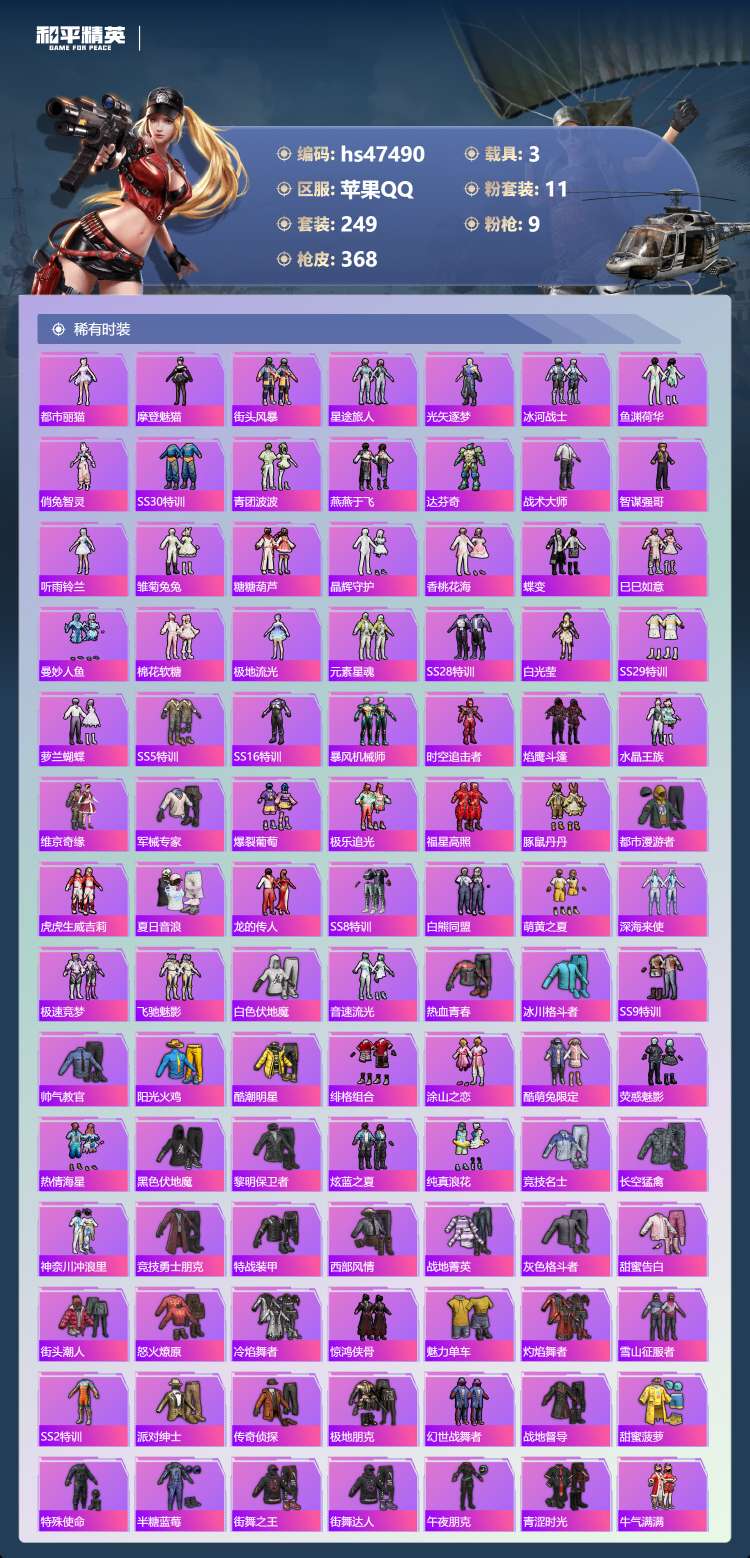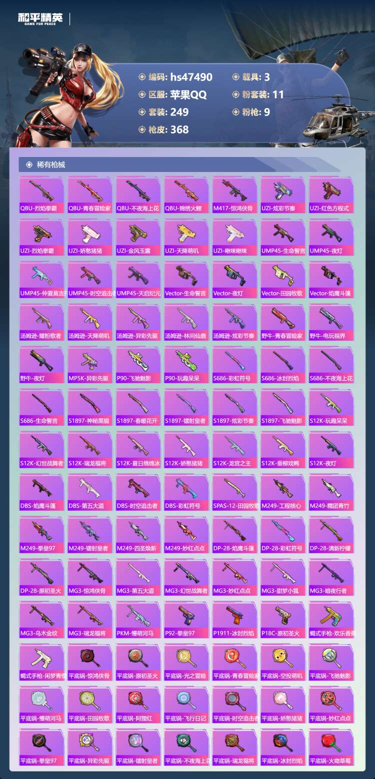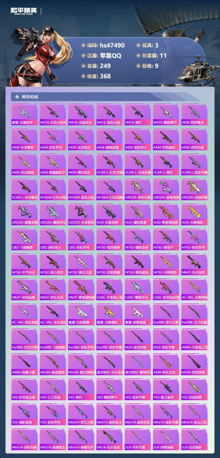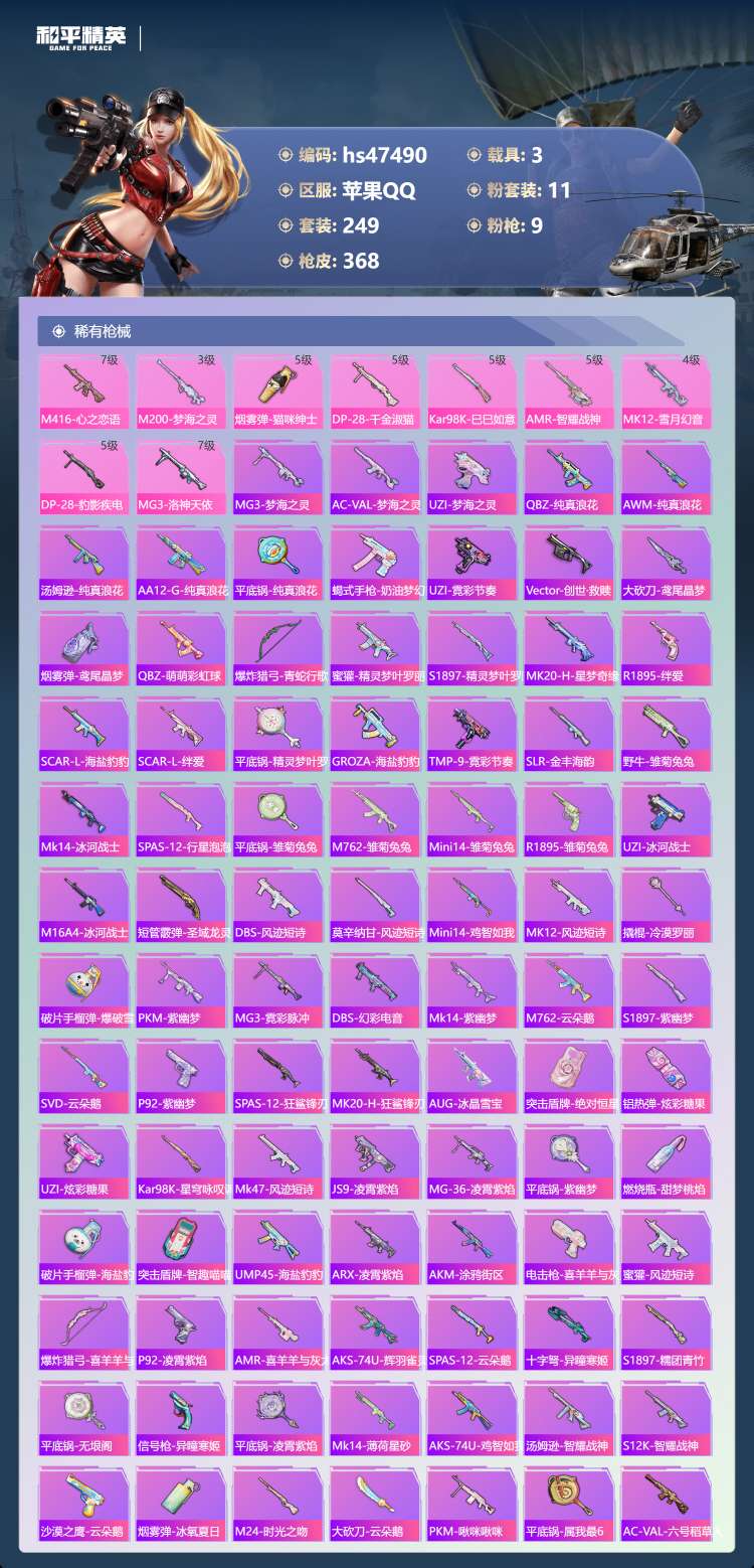 hs47490 苹果手Q-16王牌印记-1红装-11粉装-9特效枪-3载具-123365热力值-24