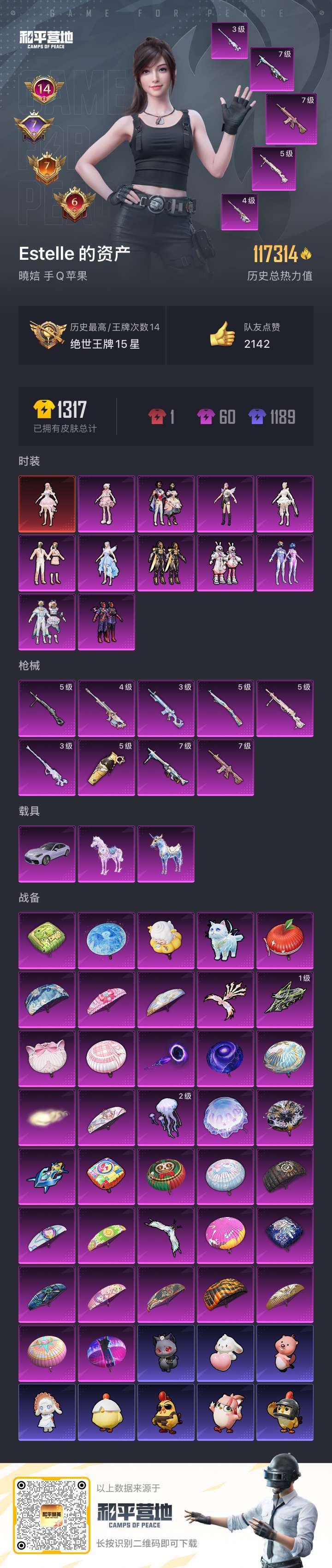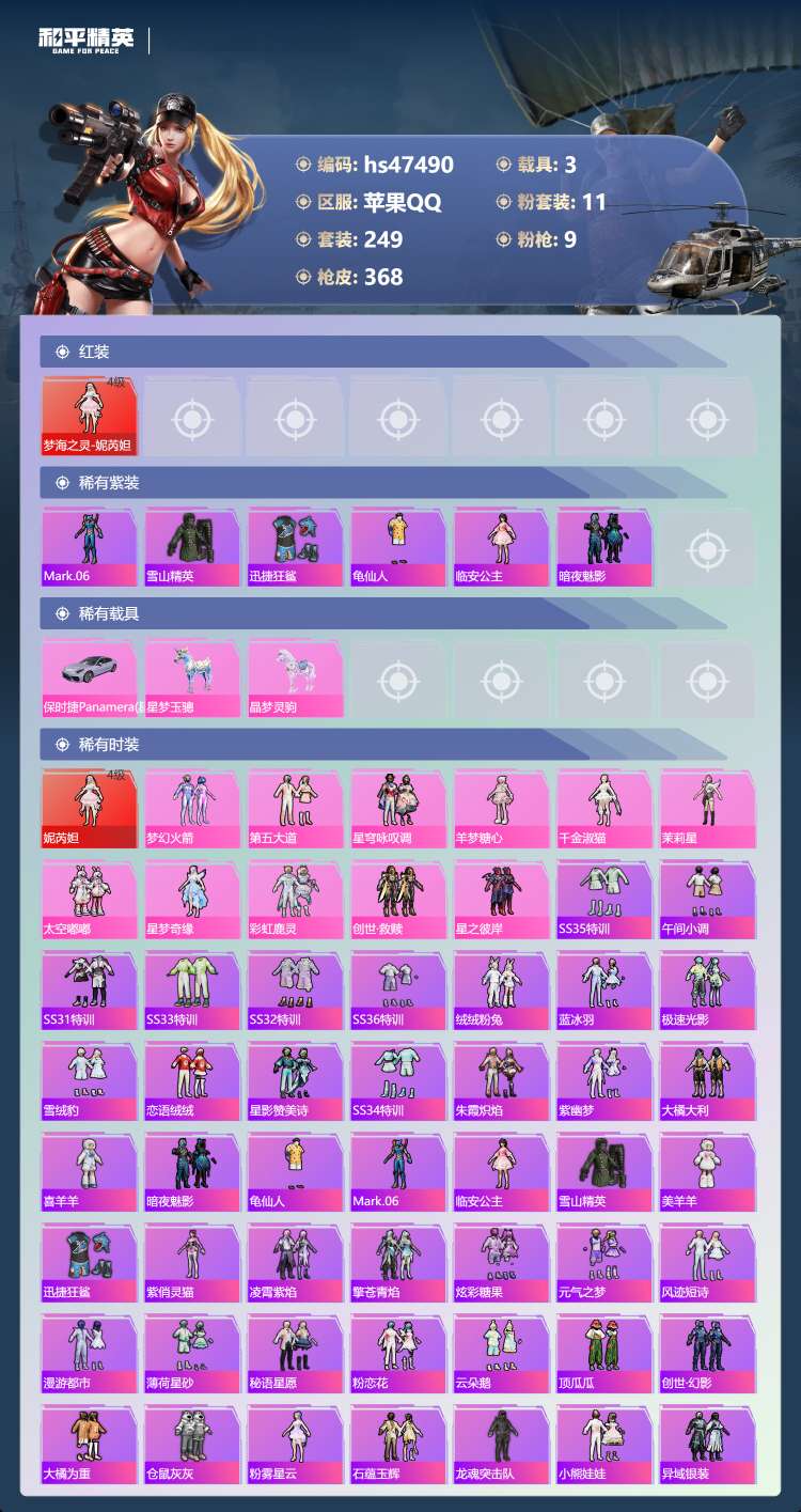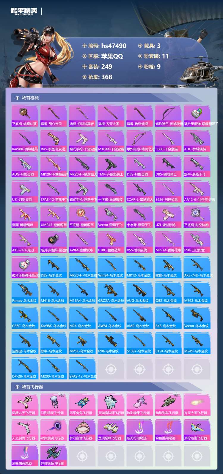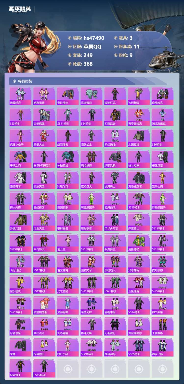 hs47490 苹果手Q-16王牌印记-1红装-11粉装-9特效枪-3载具-123365热力值-24