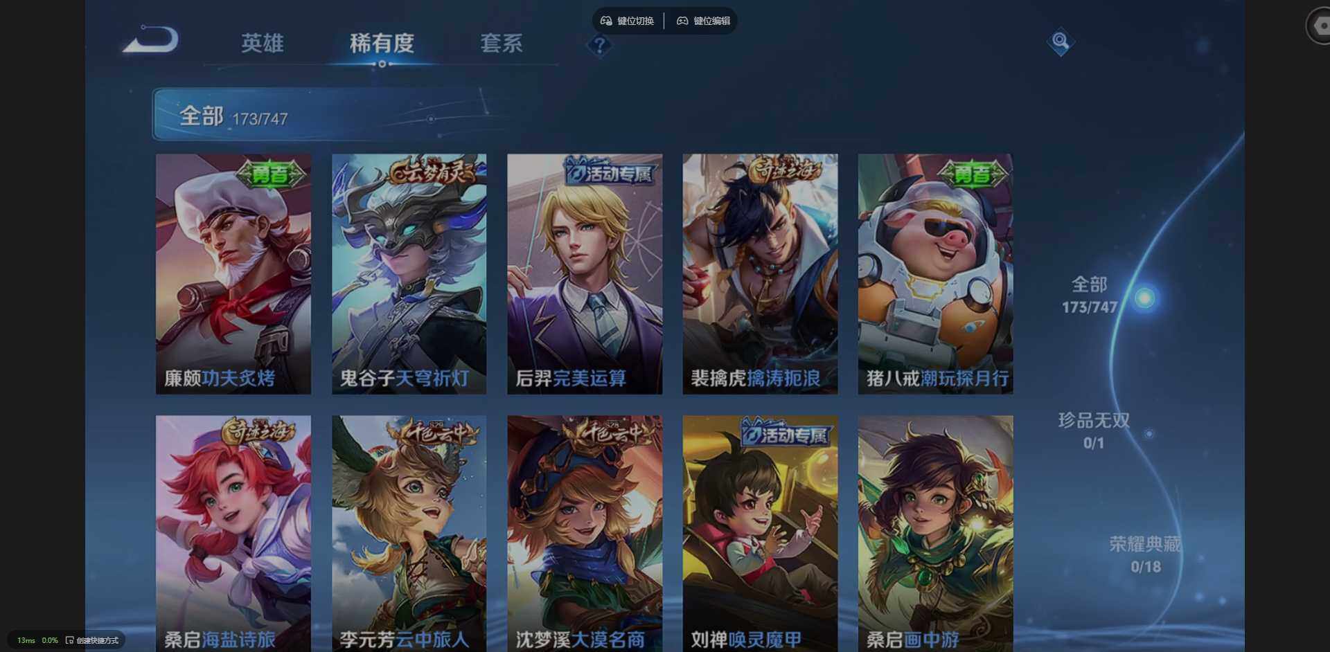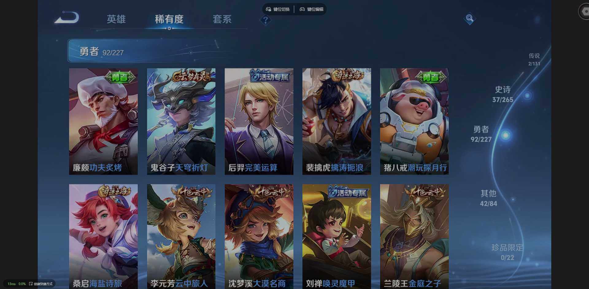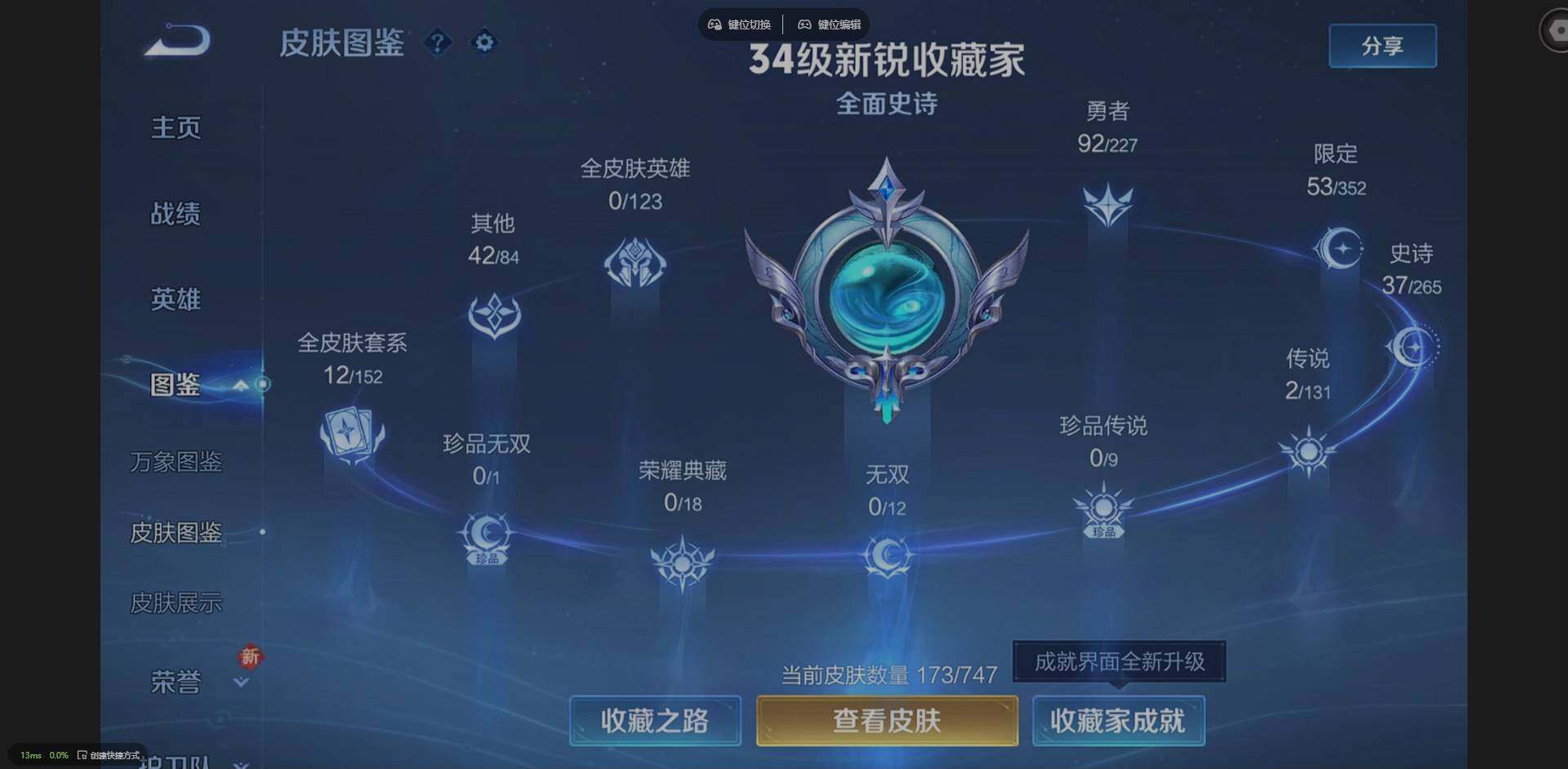 实名: 可修改 贵族等级: V7 英雄数: 123 皮肤数: 173 传说皮: