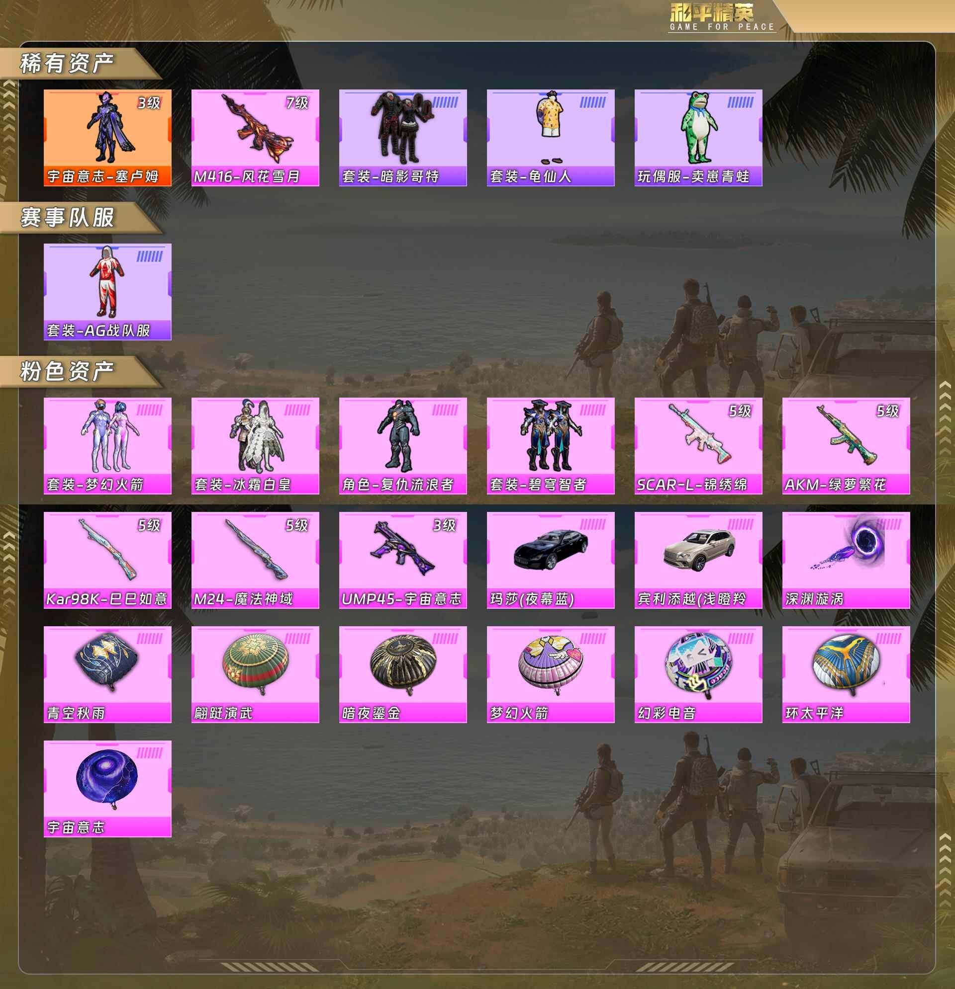 素材号-地铁满天赋-3级塞卢姆/火箭少女/红眼罩/卖崽青蛙/冰霜白皇/复仇流浪者/碧穹智者【枪皮】SCAR锦绣绵绵5级/AKM绿萝繁花5级/98K巳巳如意5级/M24魔法神域5级/UMP45宇宙意志3级/M4风花雪月7级【载具】玛莎拉蒂(夜幕蓝)/宾利添越(浅瞪羚棕) 没战神框(1神装4粉套6粉枪2载具)HP4199-1粉色飞行器-39369热力值-9王牌印记-76套装-124枪皮