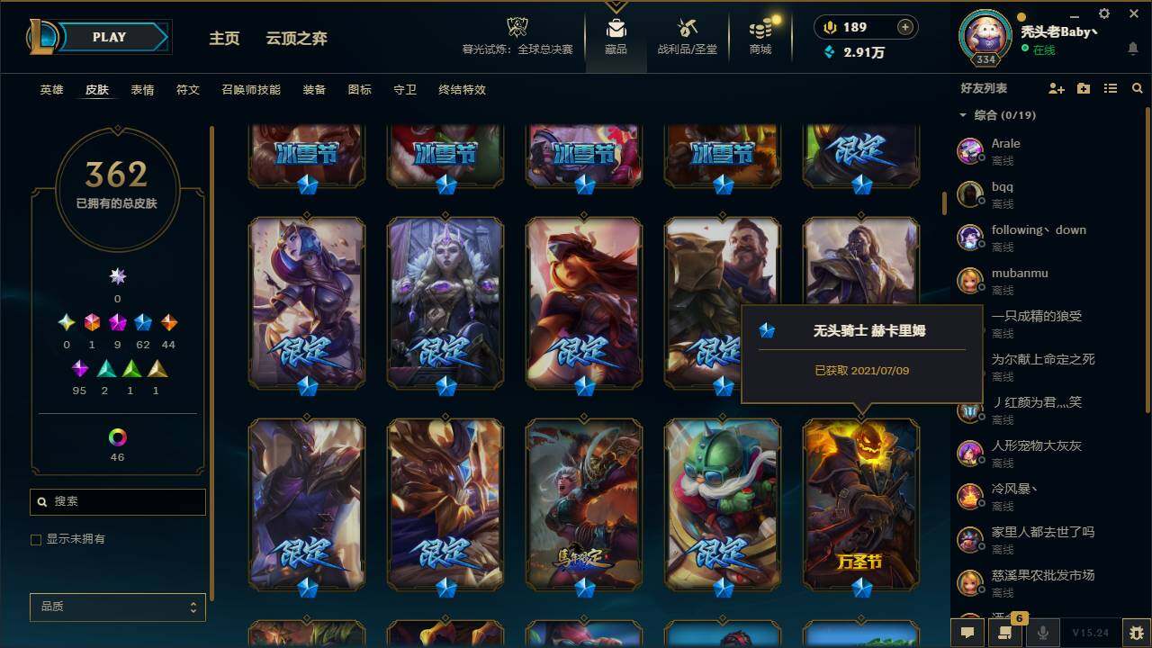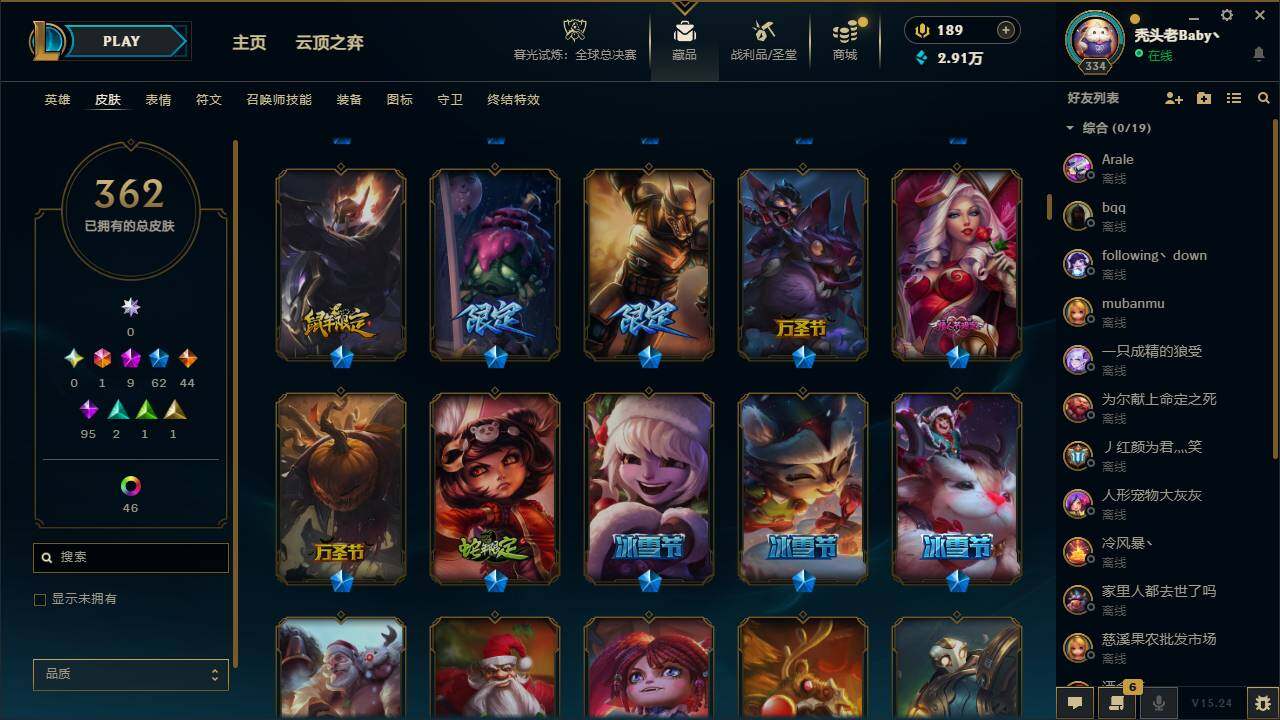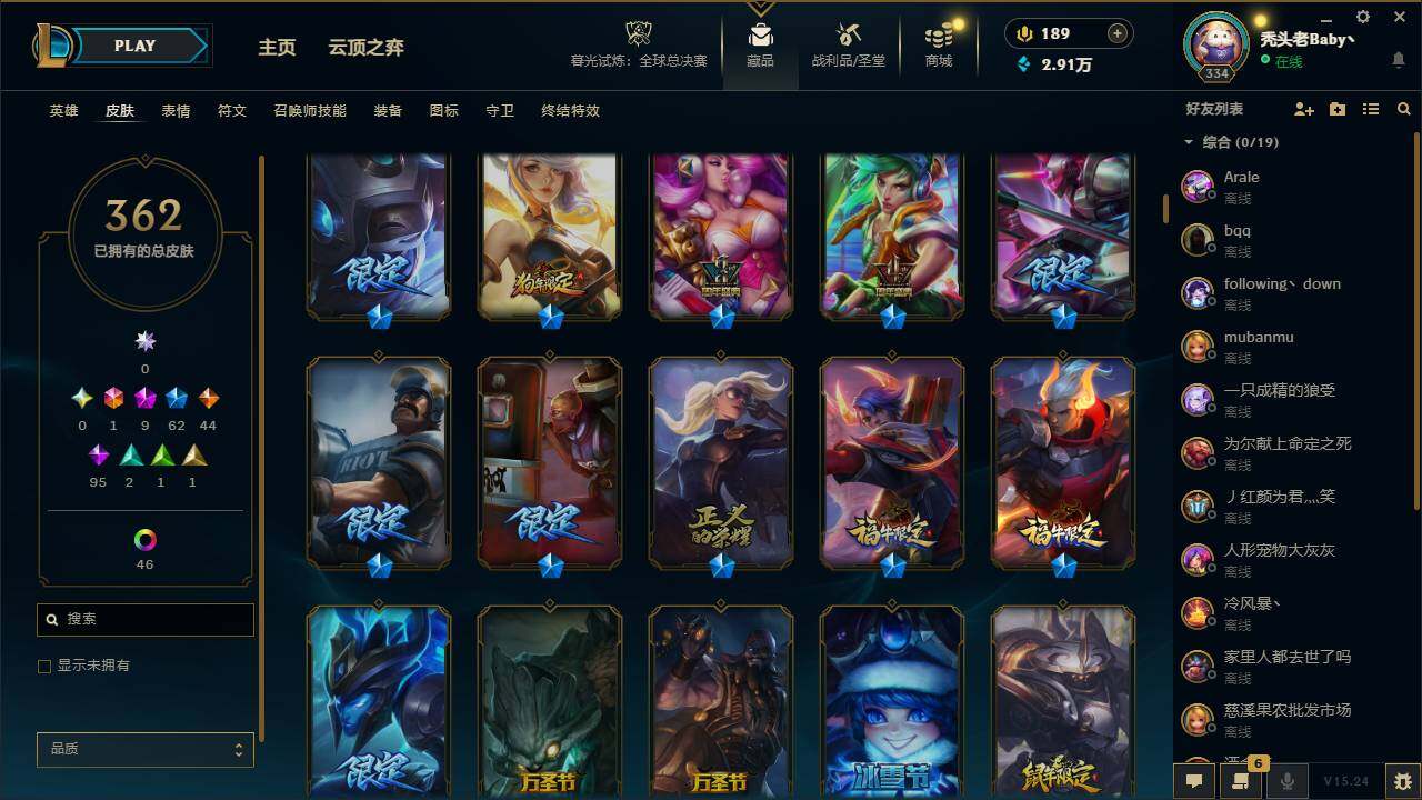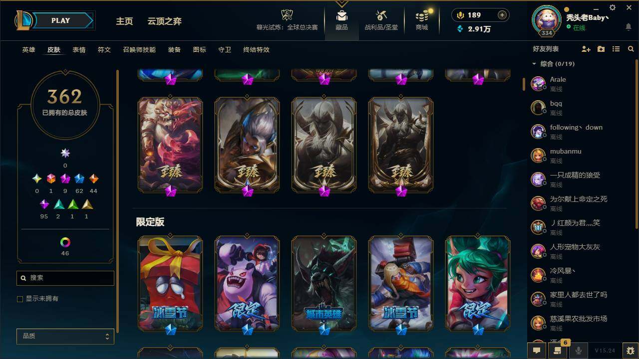 172英雄/362皮肤/1终极/9神话/62限定/2臻彩/56炫彩/44传说/95史诗/白银账号等级:334/