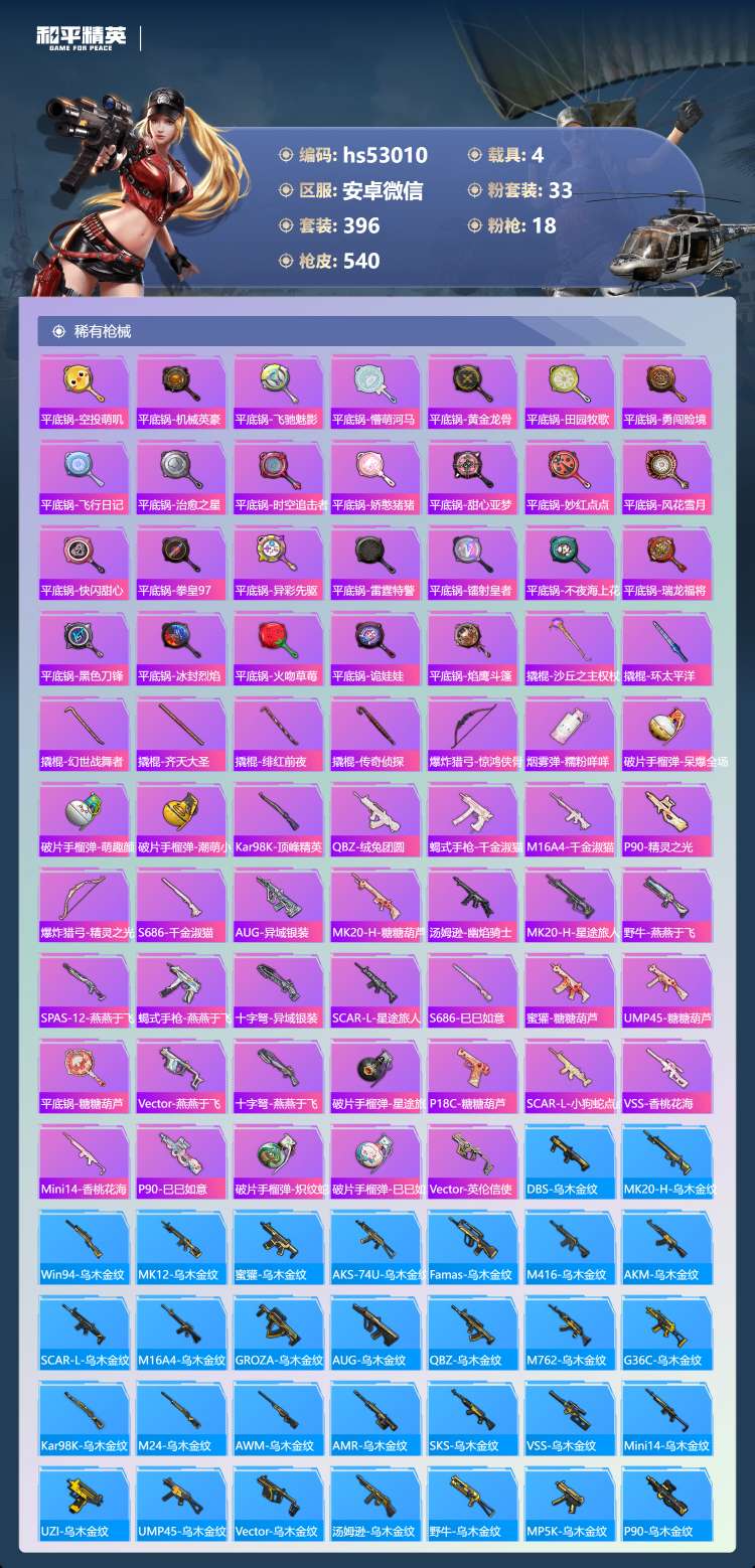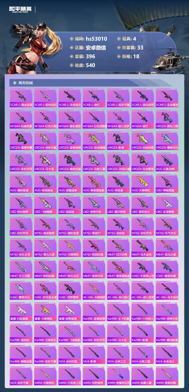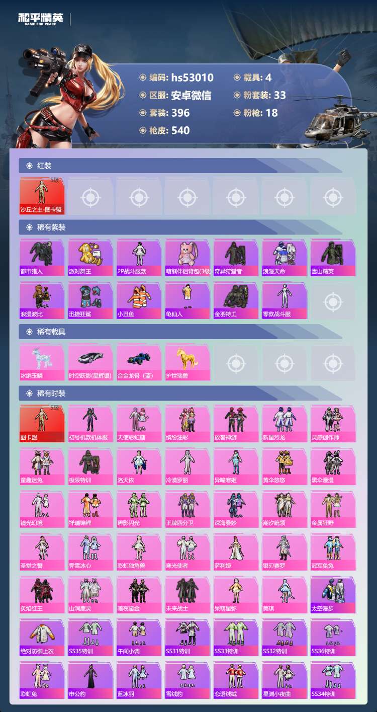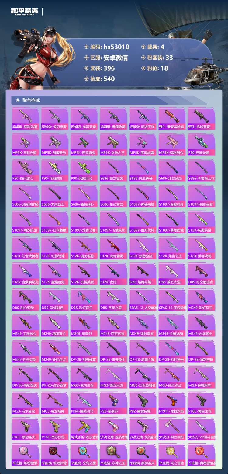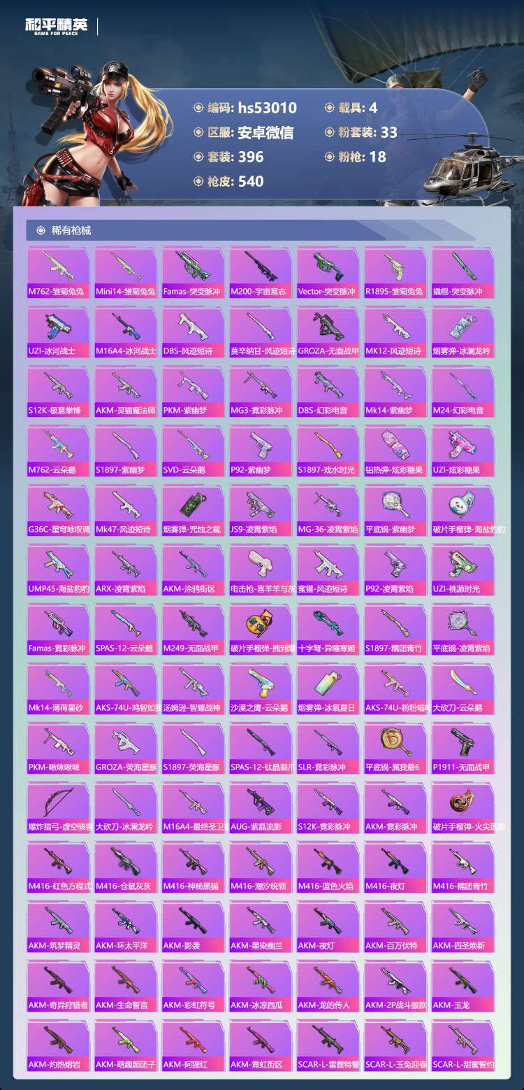 hs53010 安卓微-34王牌印记-有战神框-1红装-33粉装-18特效枪-4载具-198154