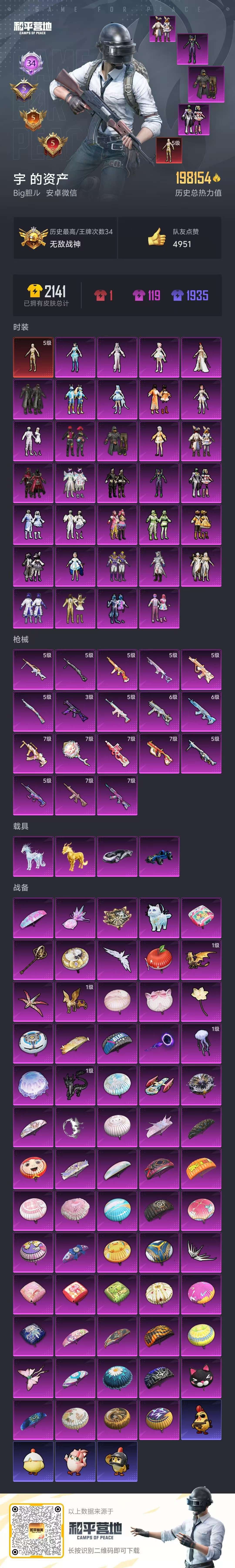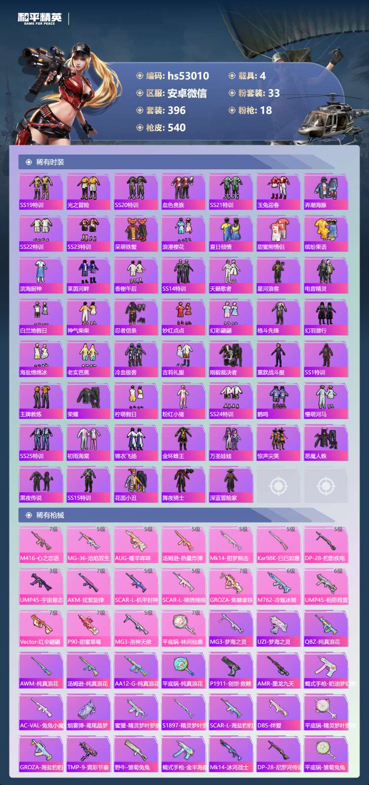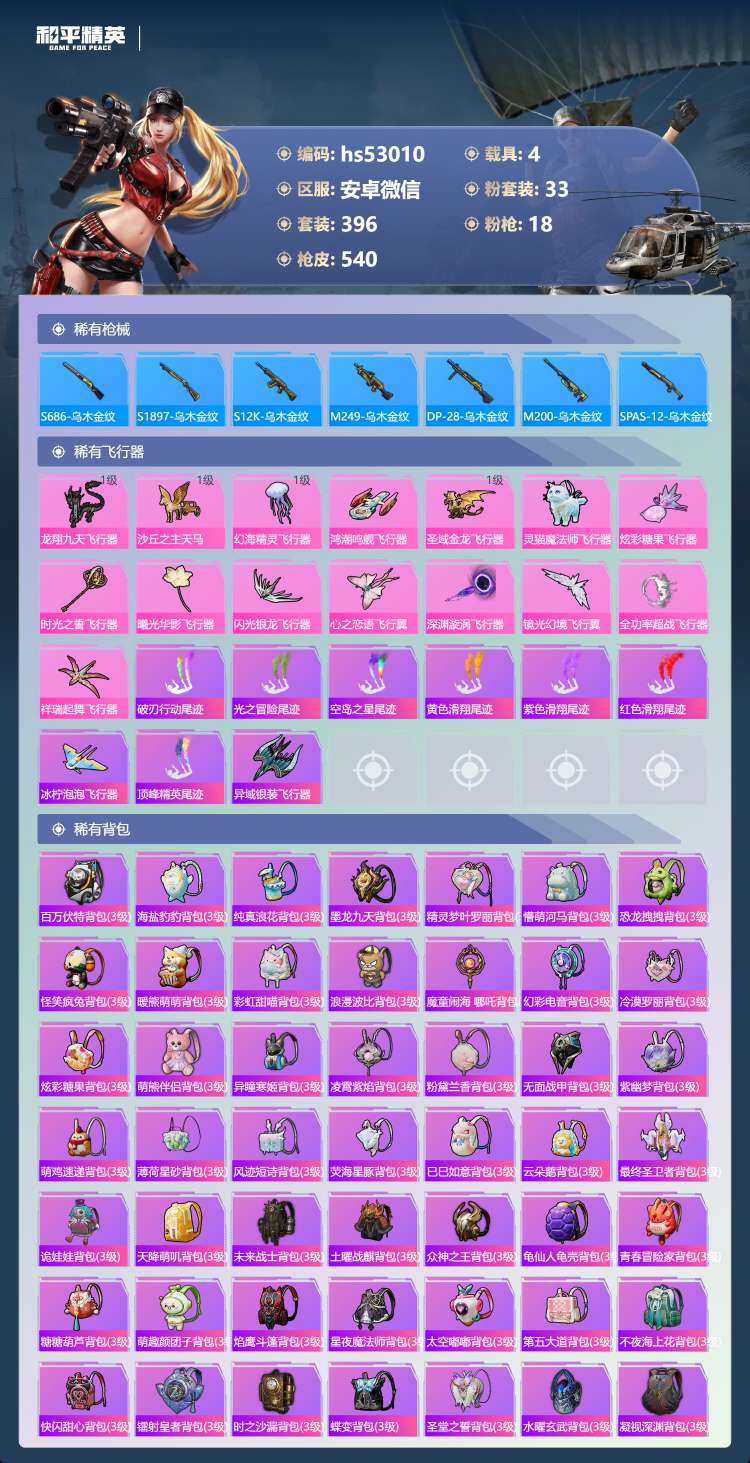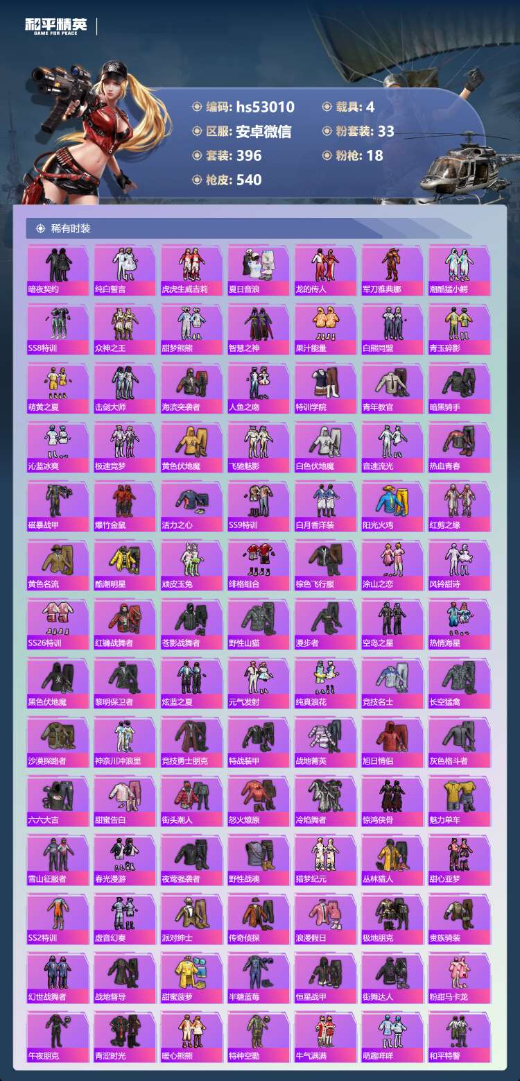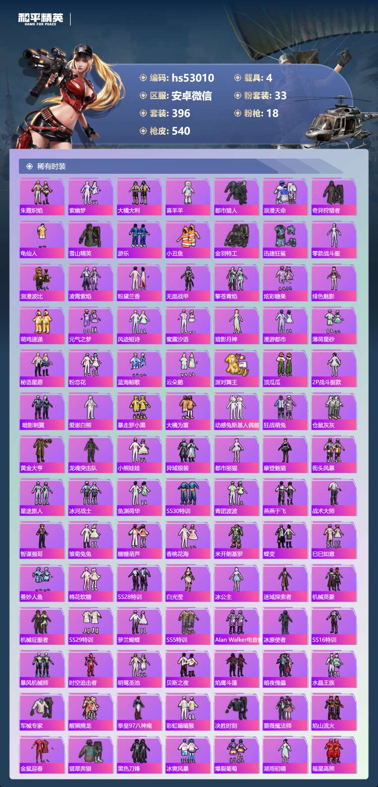 hs53010 安卓微-34王牌印记-有战神框-1红装-33粉装-18特效枪-4载具-198154