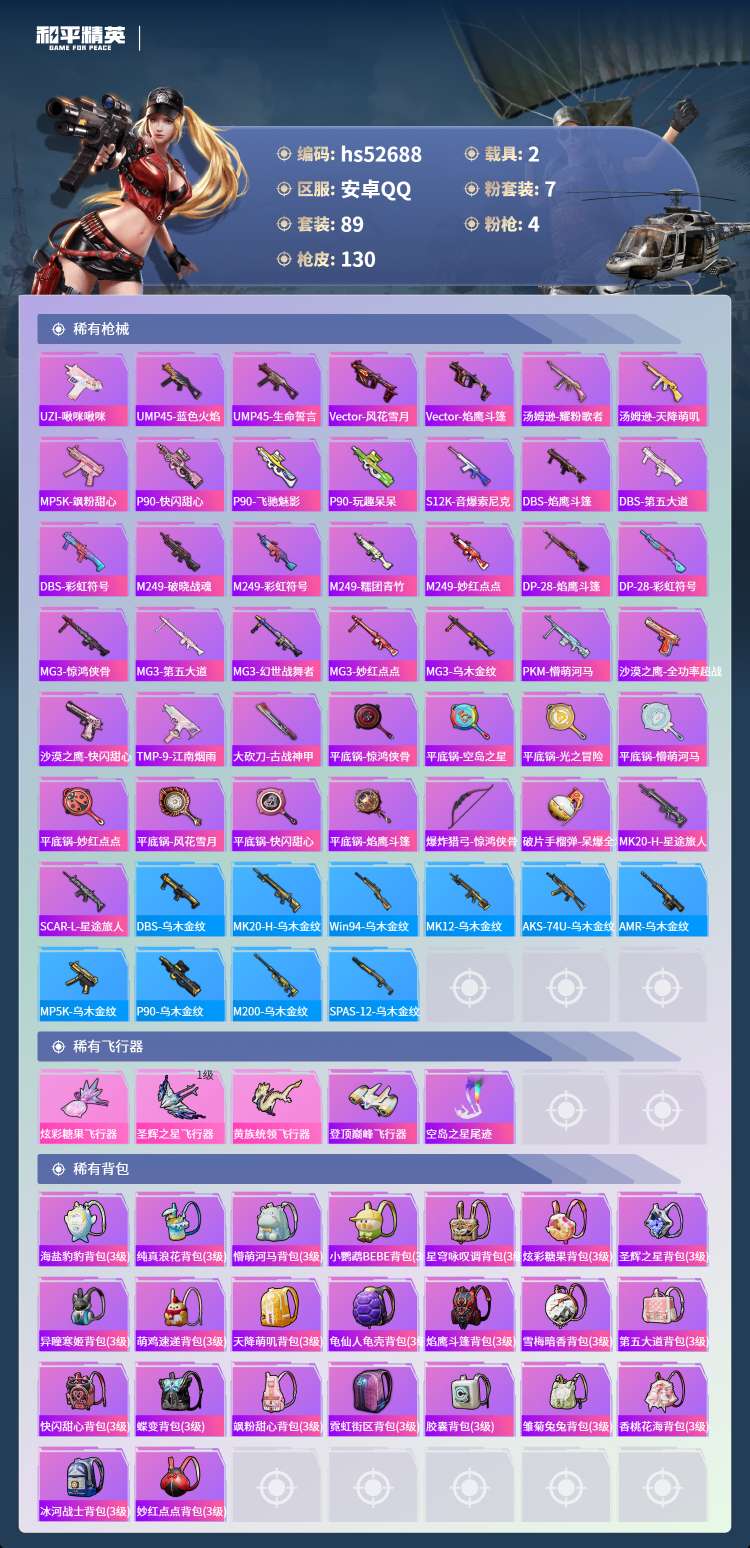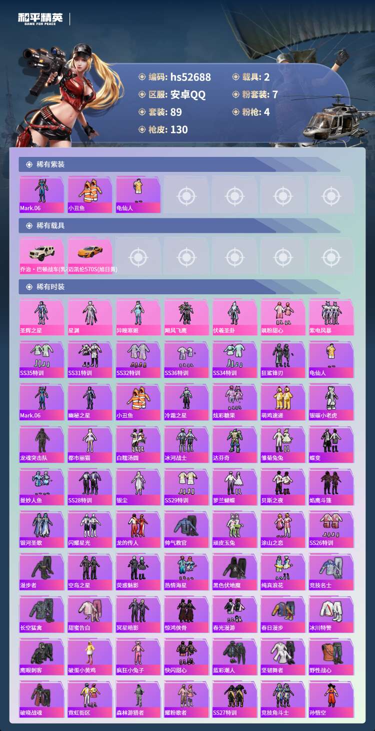 hs52688 安卓手Q-5王牌印记-7粉装-4特效枪-2载具-42405热力值-89套装-130枪