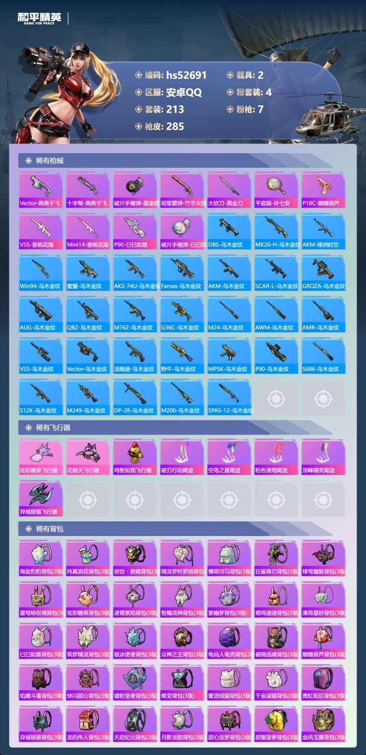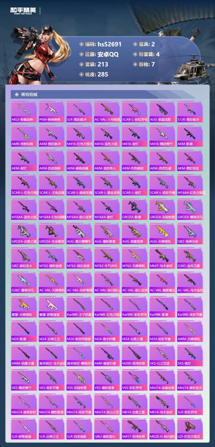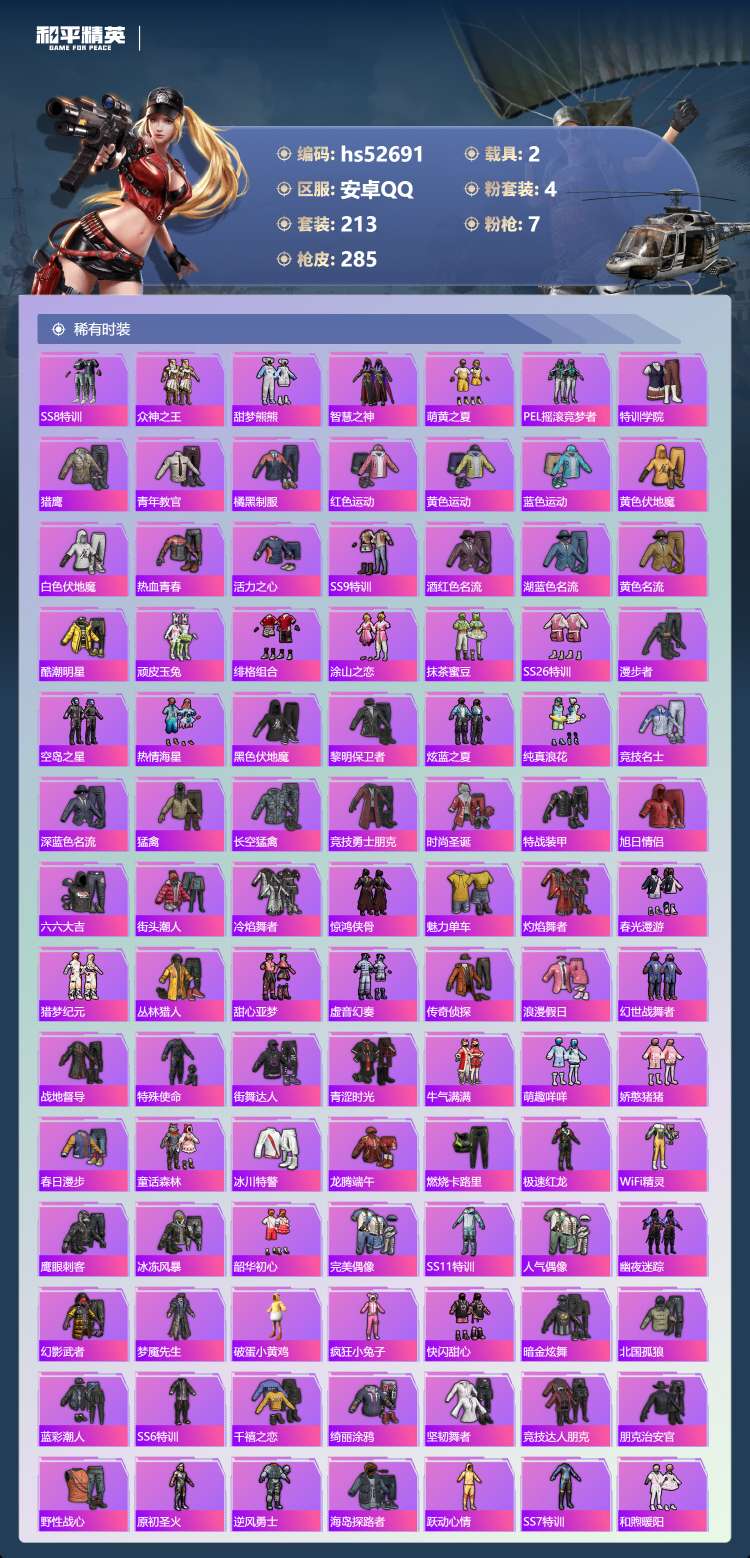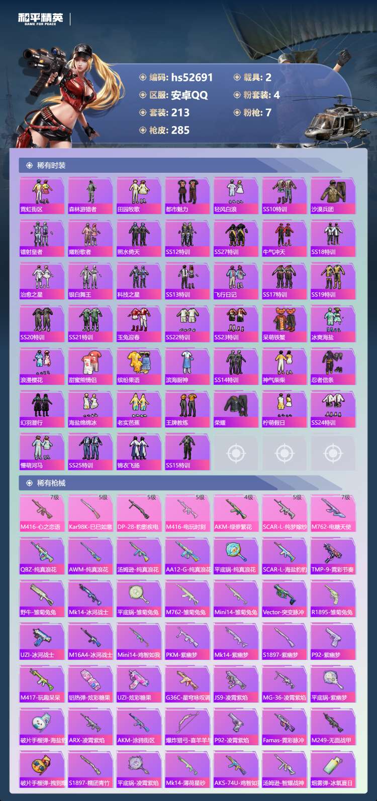 hs52691 安卓手Q-17王牌印记-4粉装-7特效枪-2载具-90561热力值-213套装-28