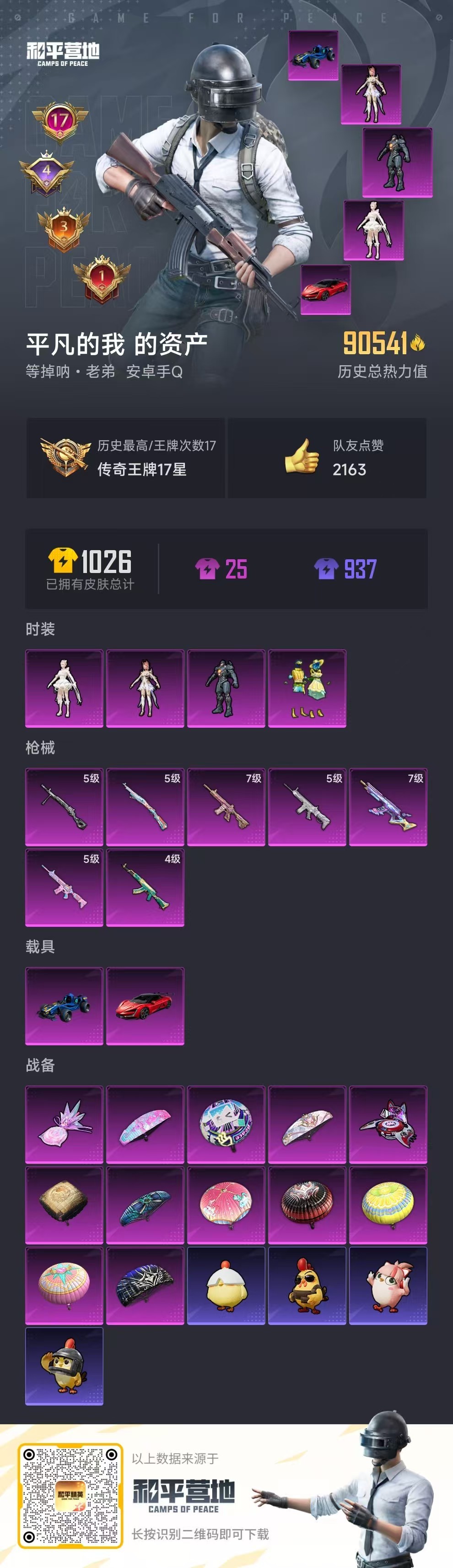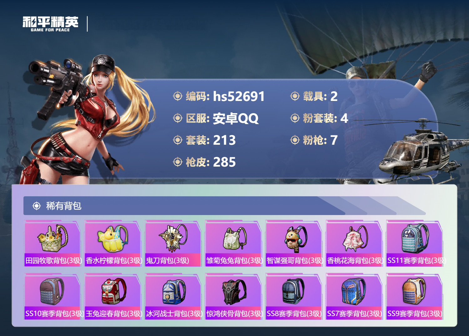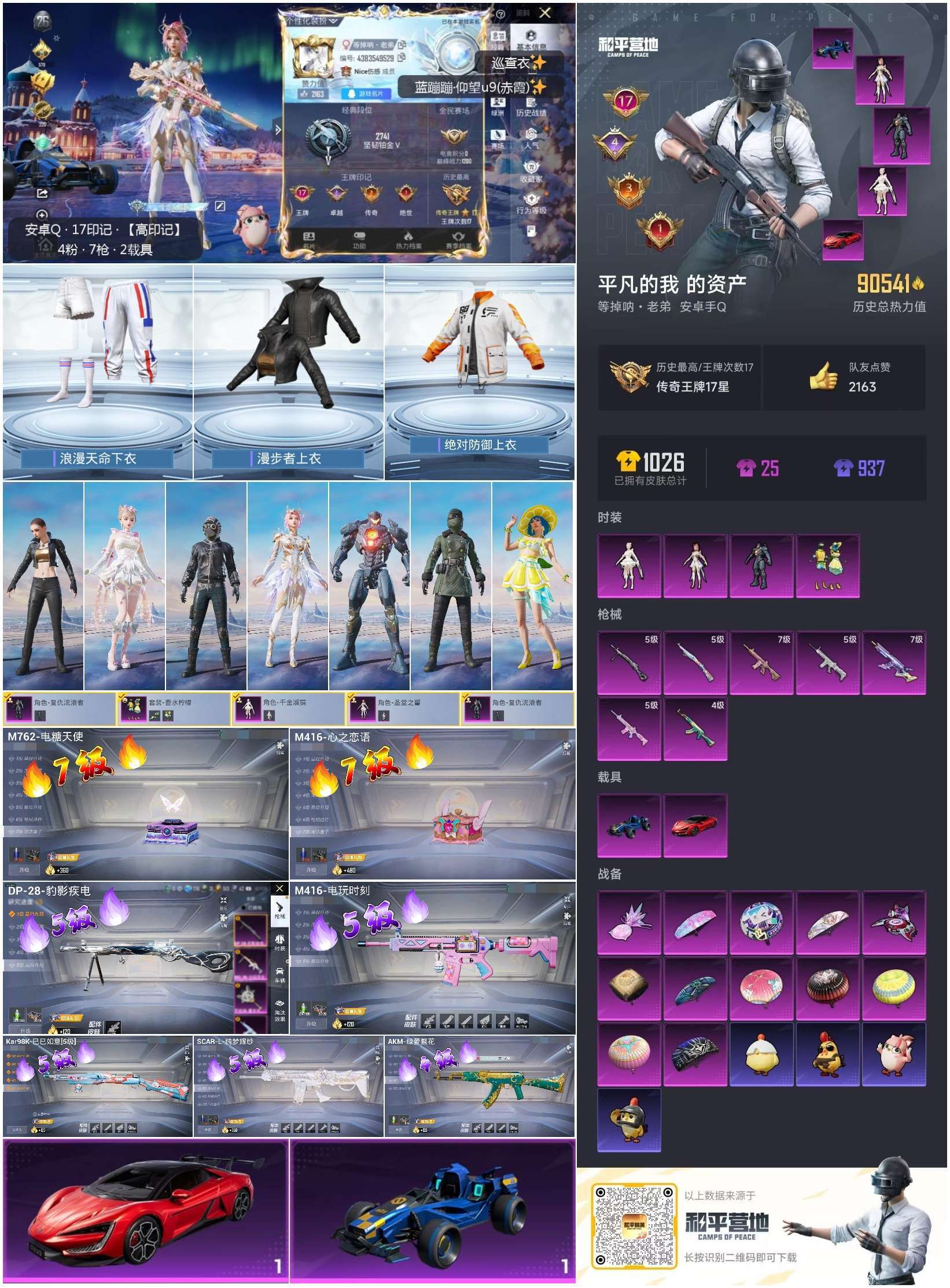 hs52691 安卓手Q-17王牌印记-4粉装-7特效枪-2载具-90561热力值-213套装-28