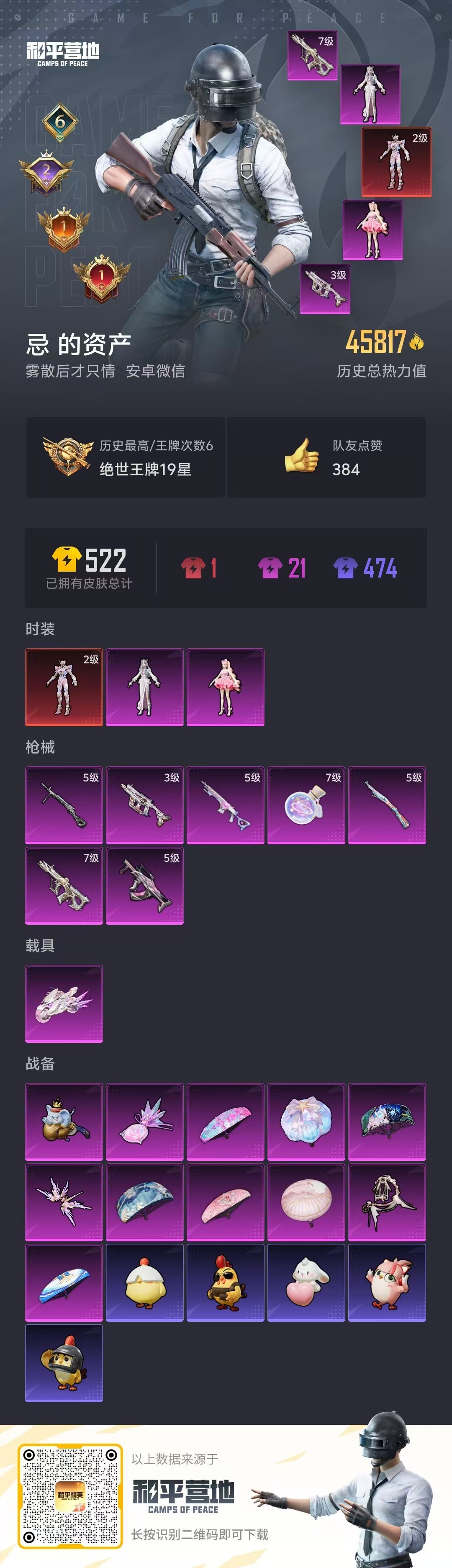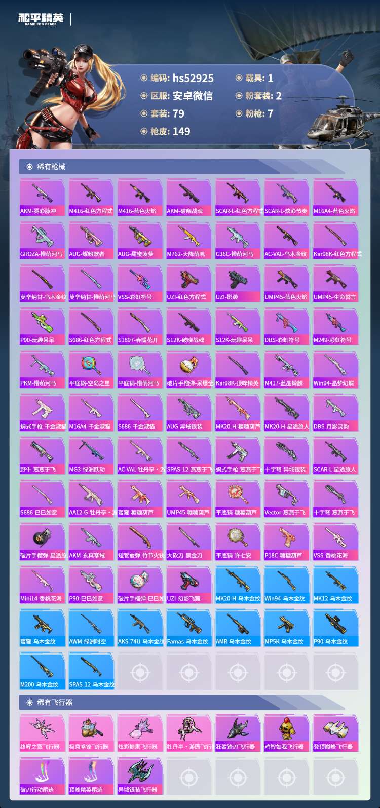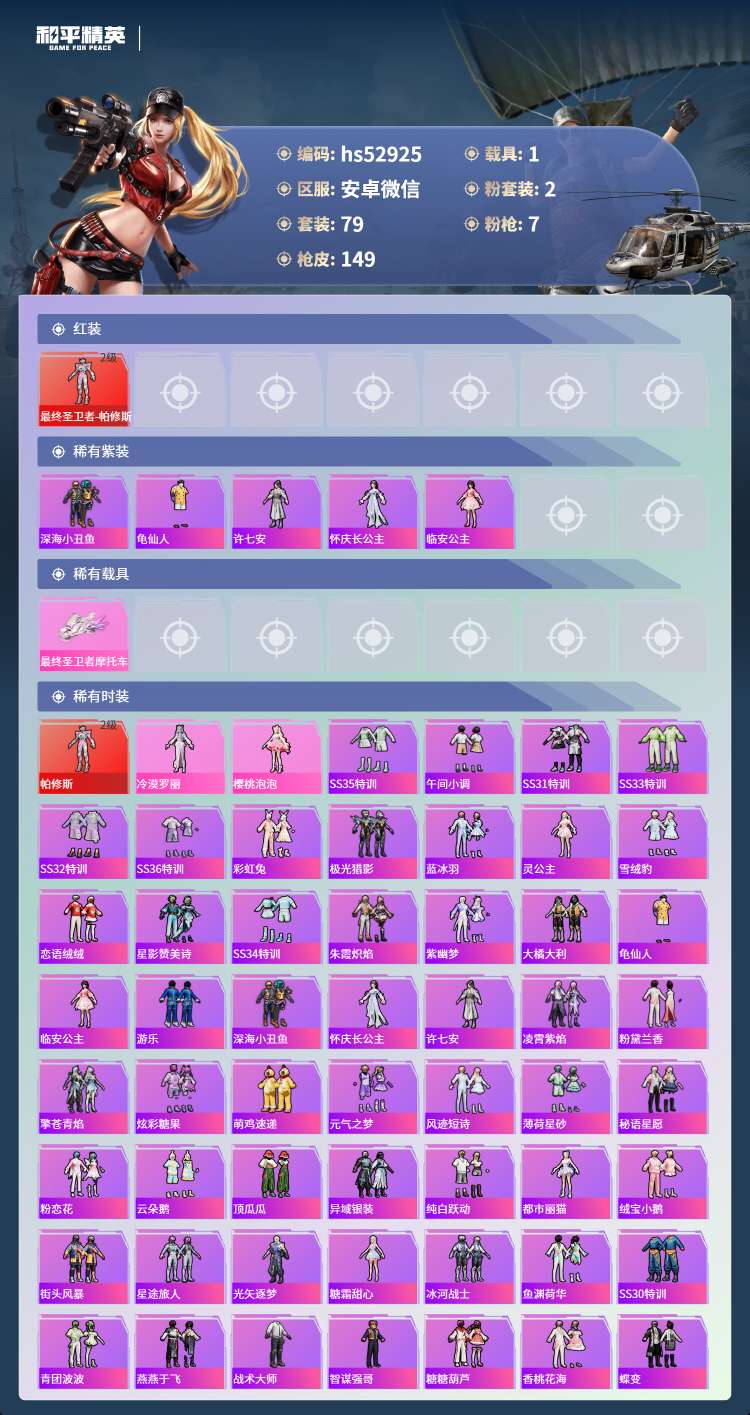 hs52925 安卓微 6王牌印记-1红装-2粉装-7特效枪-1载具-45817热力值-79套装-