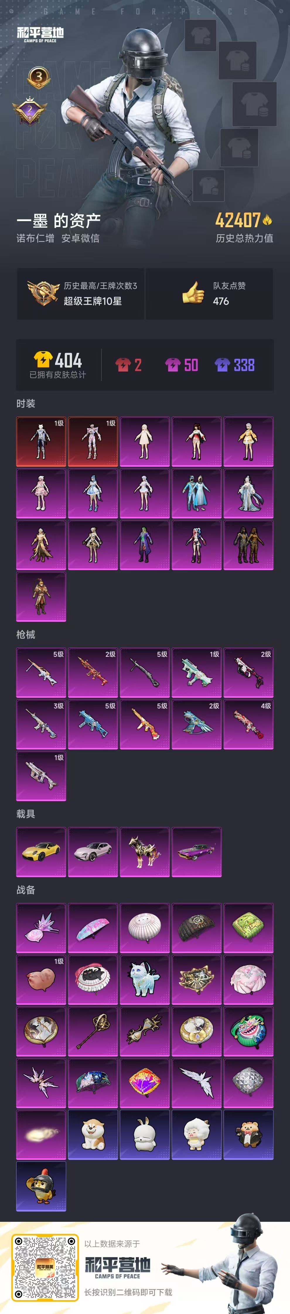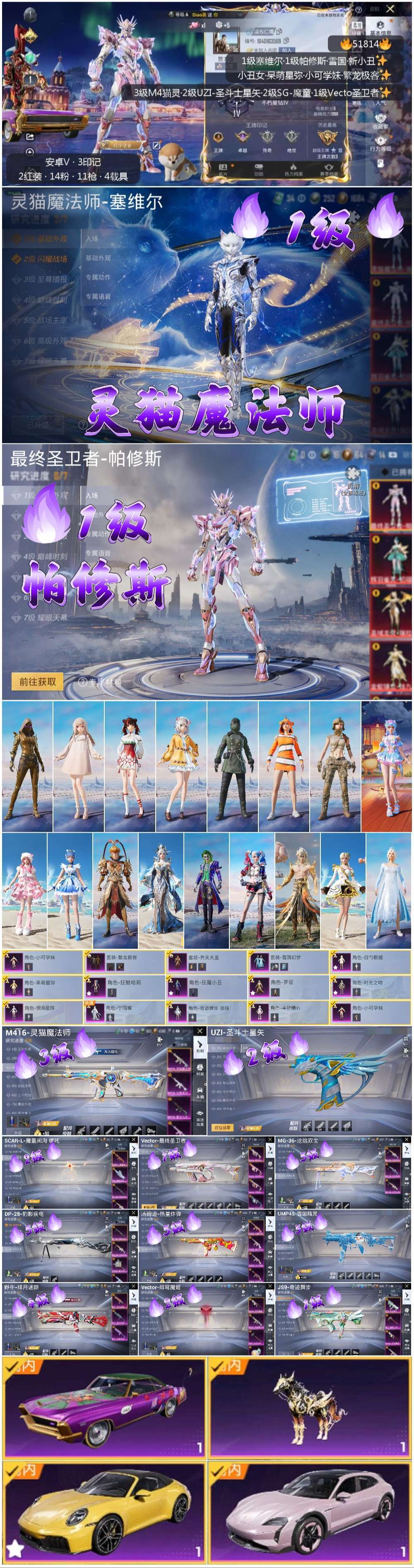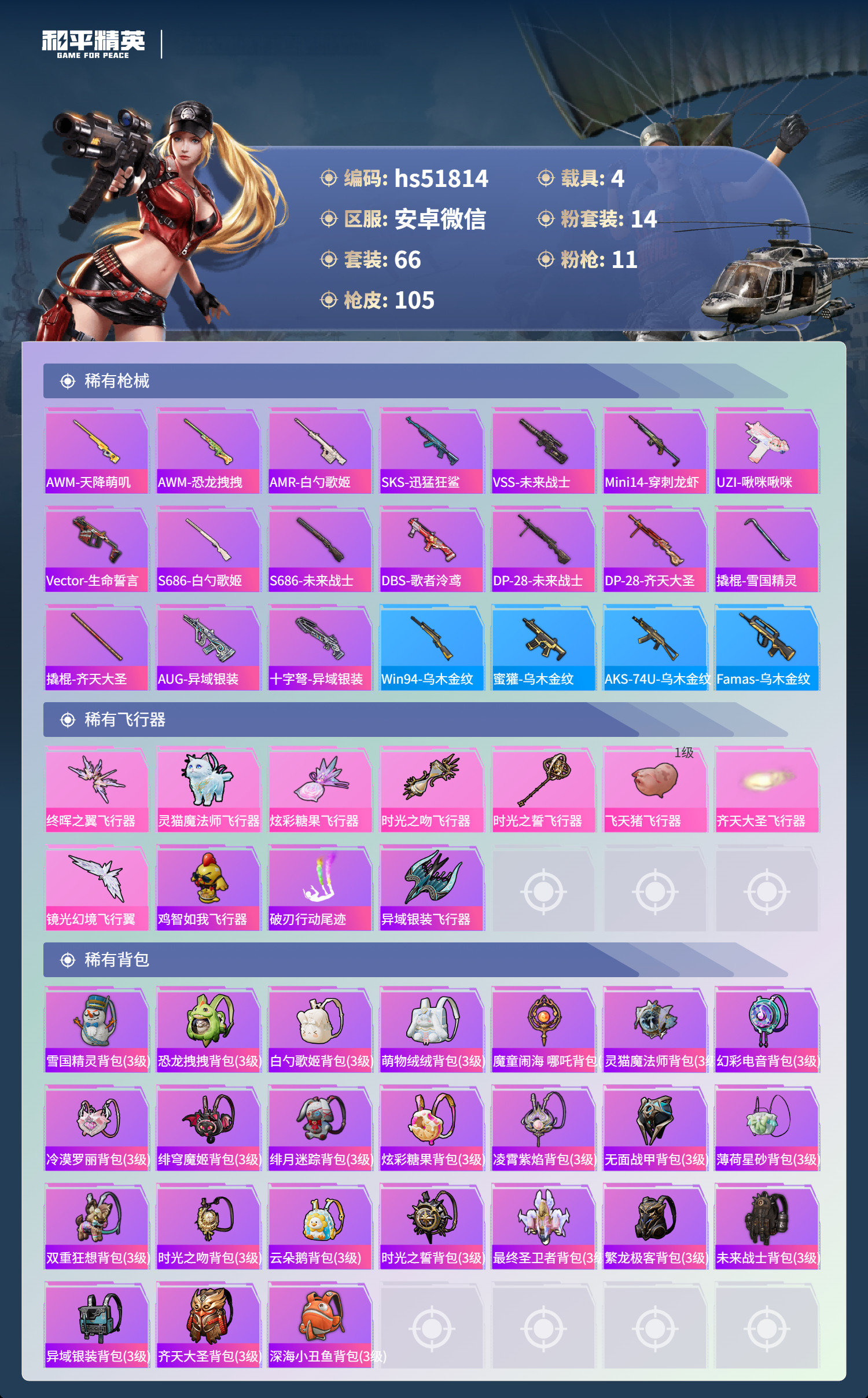 hs51814 安卓微-3王牌印记-2红装-14粉装-11特效枪-4载具-热力值-66套