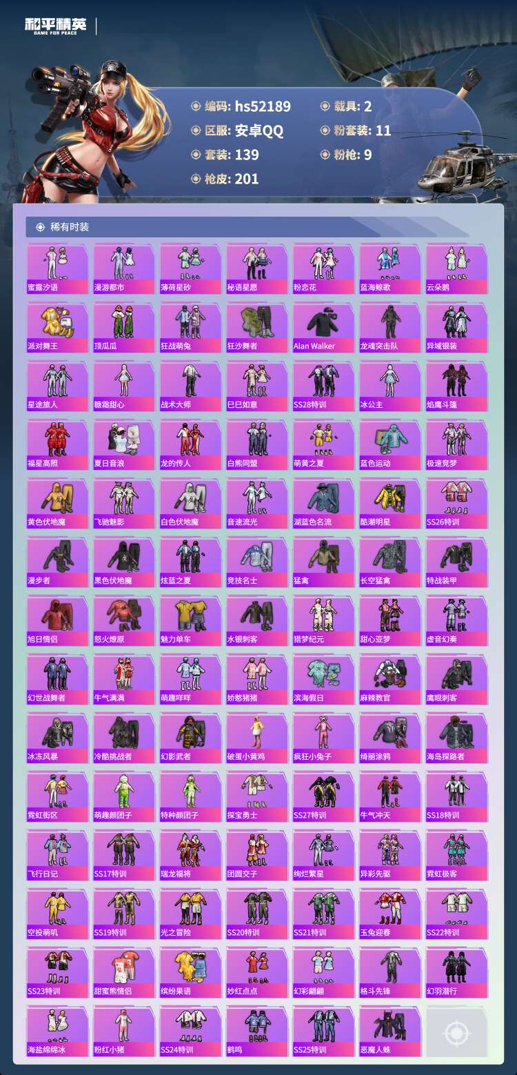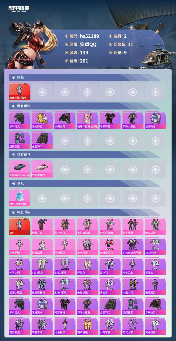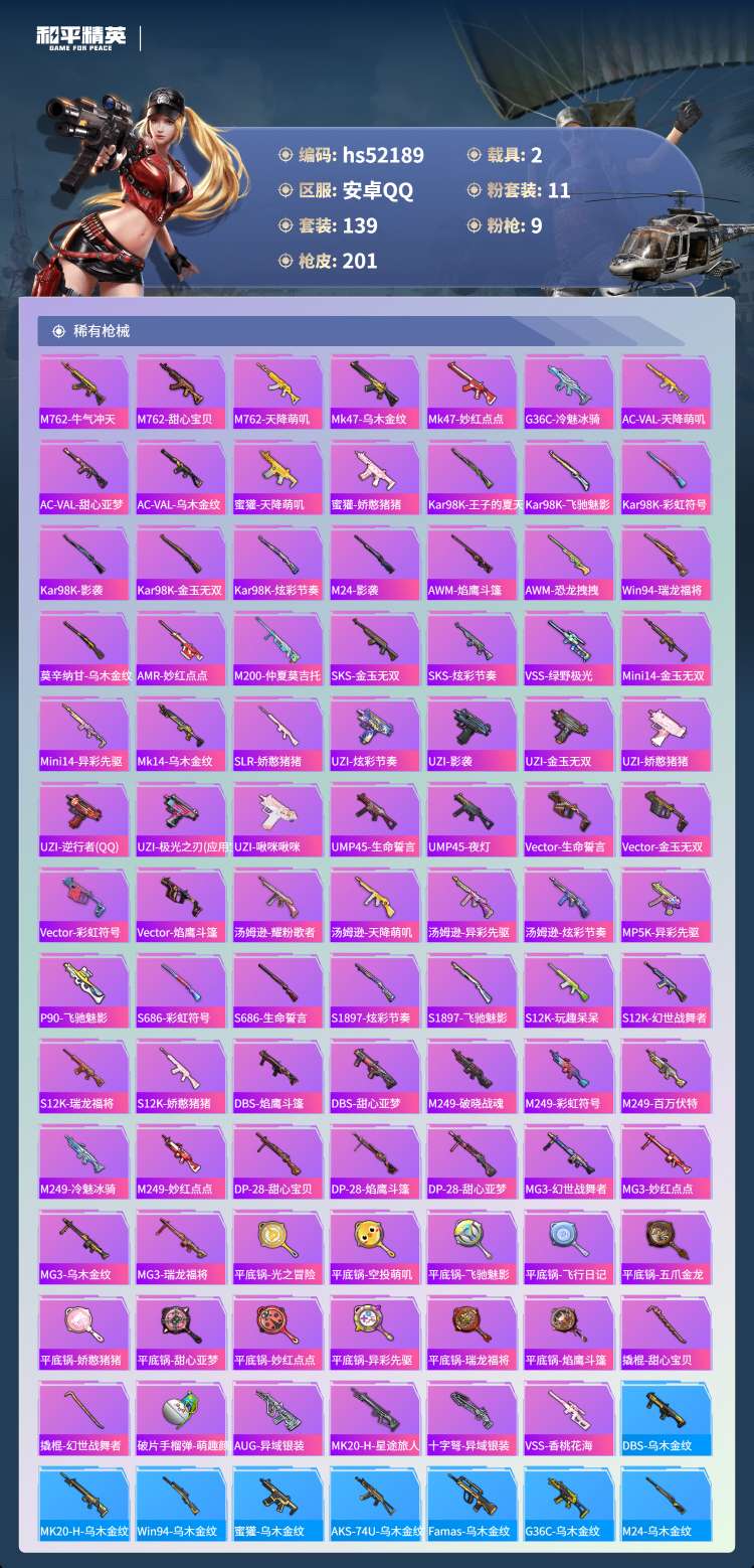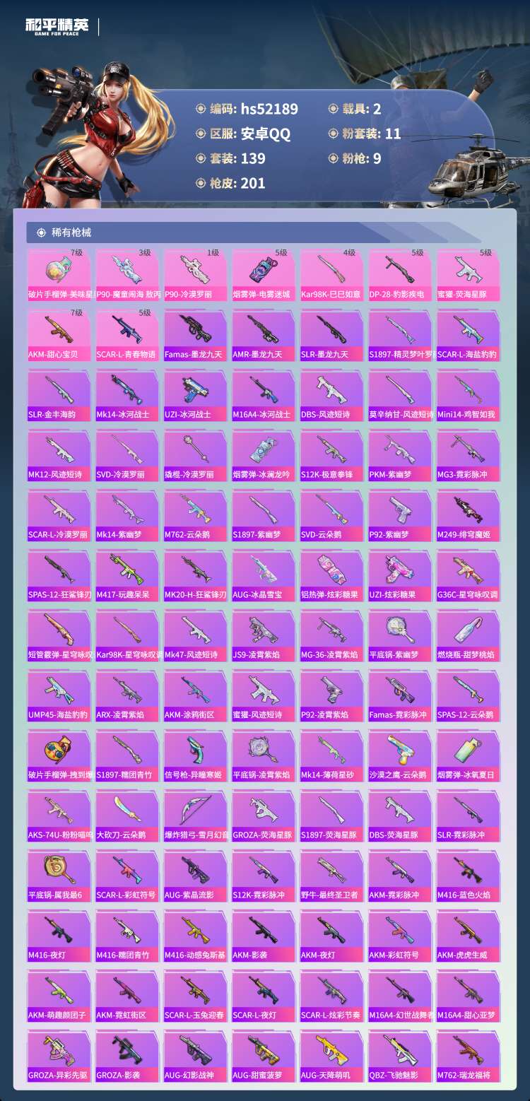 hs52189 安卓手Q-10王牌印记-1红装-11粉装-9特效枪-2载具-热力值-139