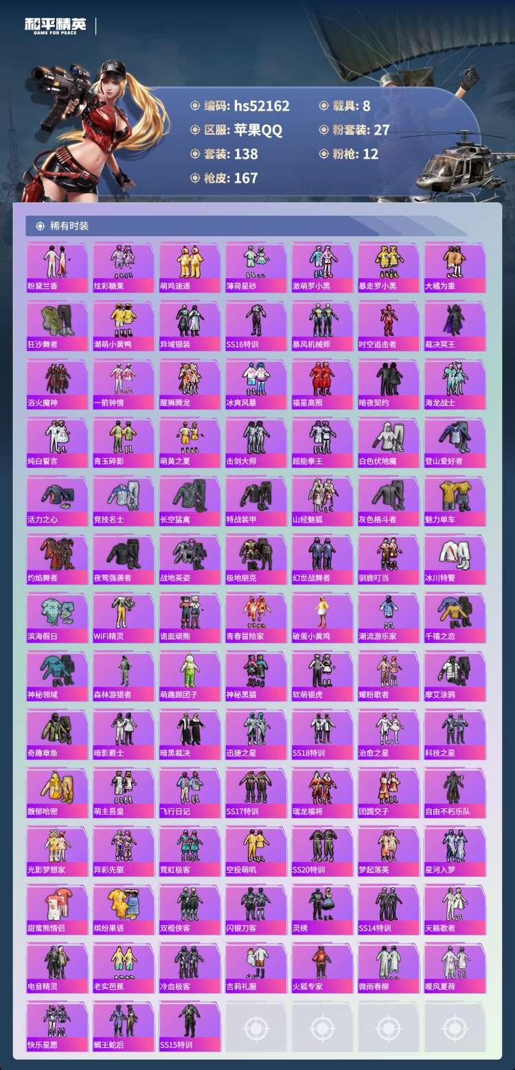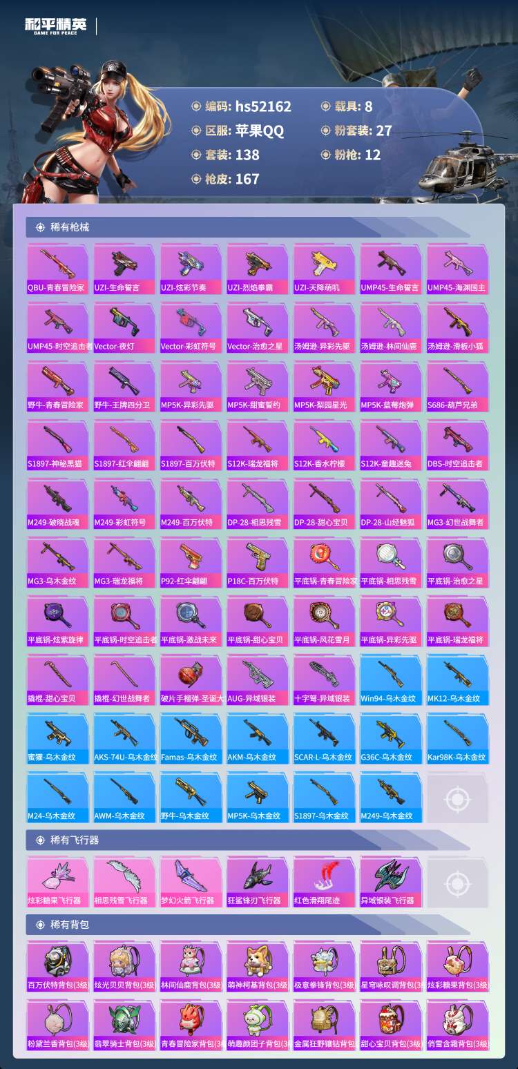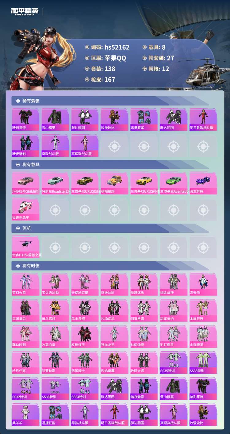 hs52162 苹果手Q-7王牌印记-27粉装-12特效枪-8载具-热力值-138套装-1