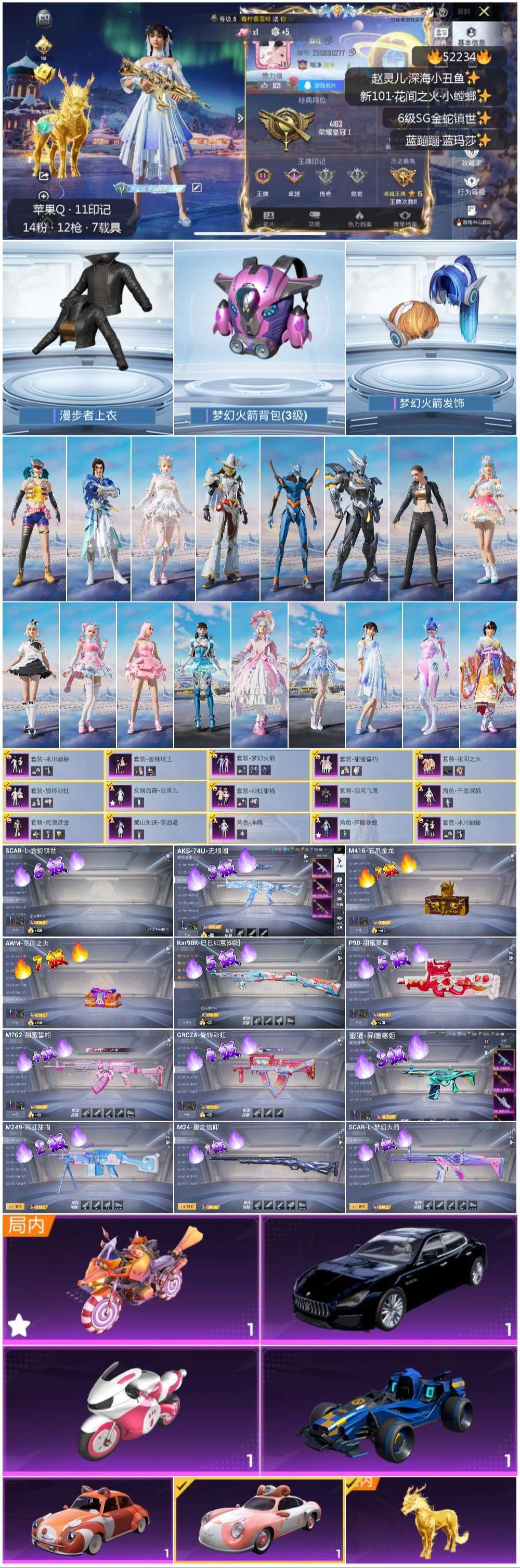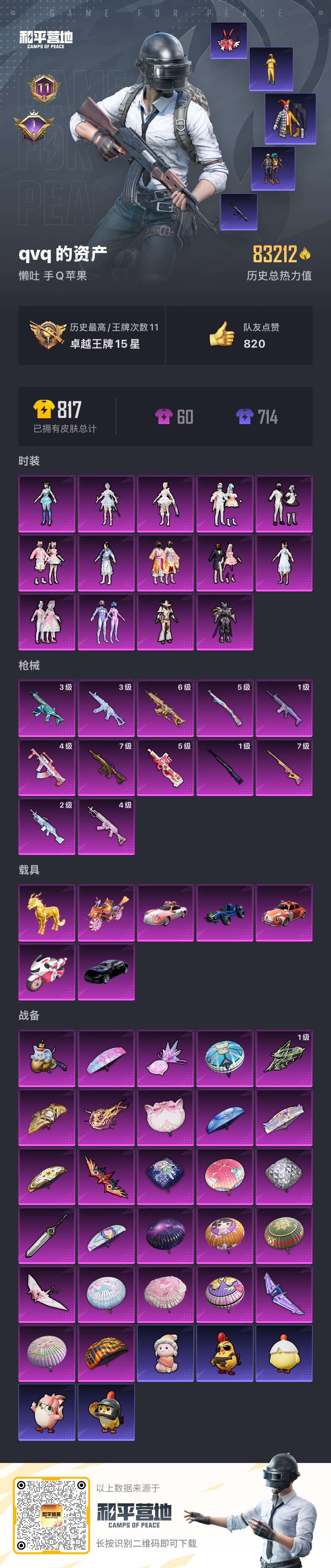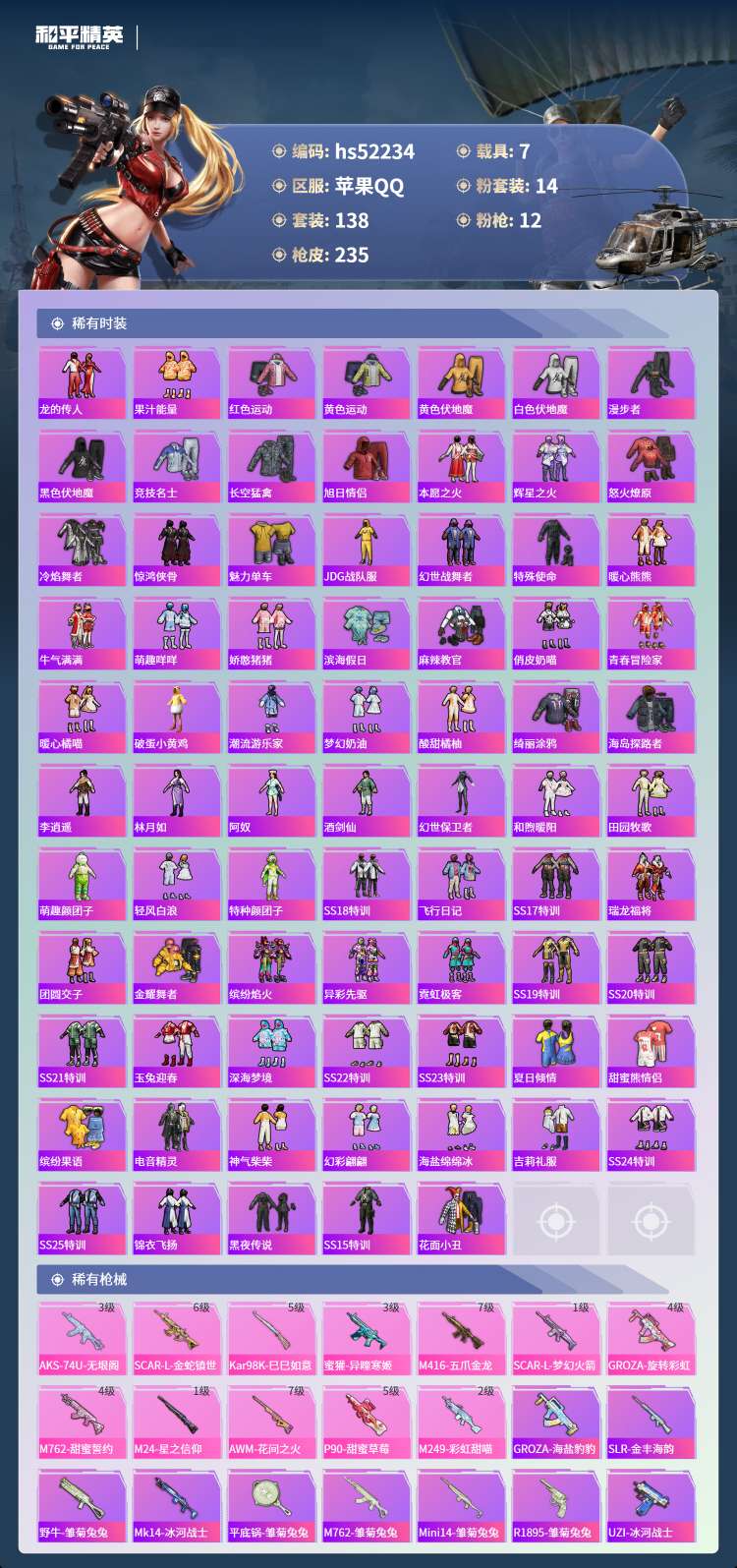 hs52234 苹果手Q-11王牌印记-14粉装-12特效枪-7载具-热力值-138套装-