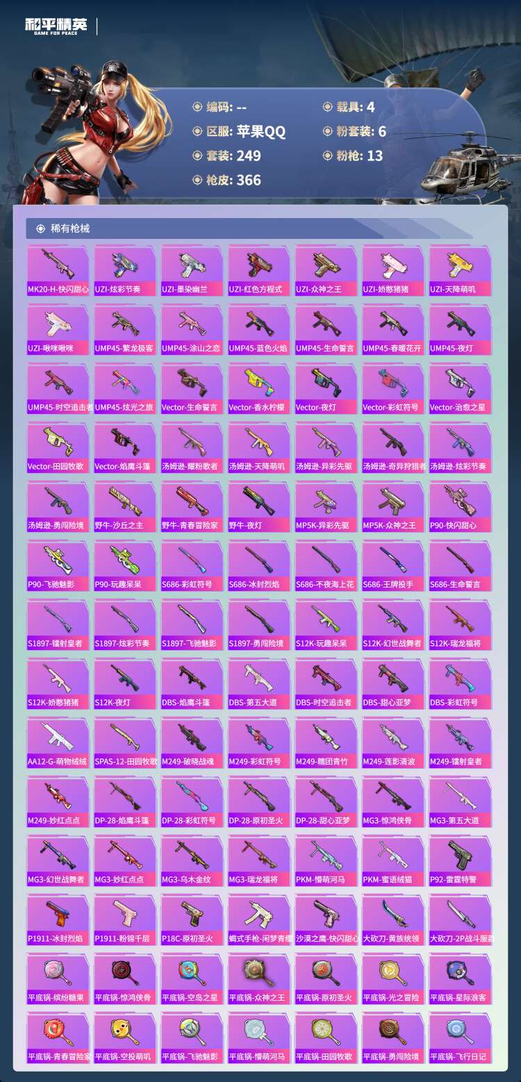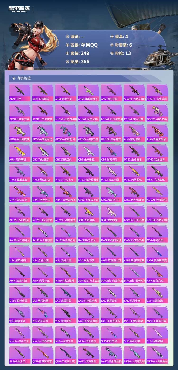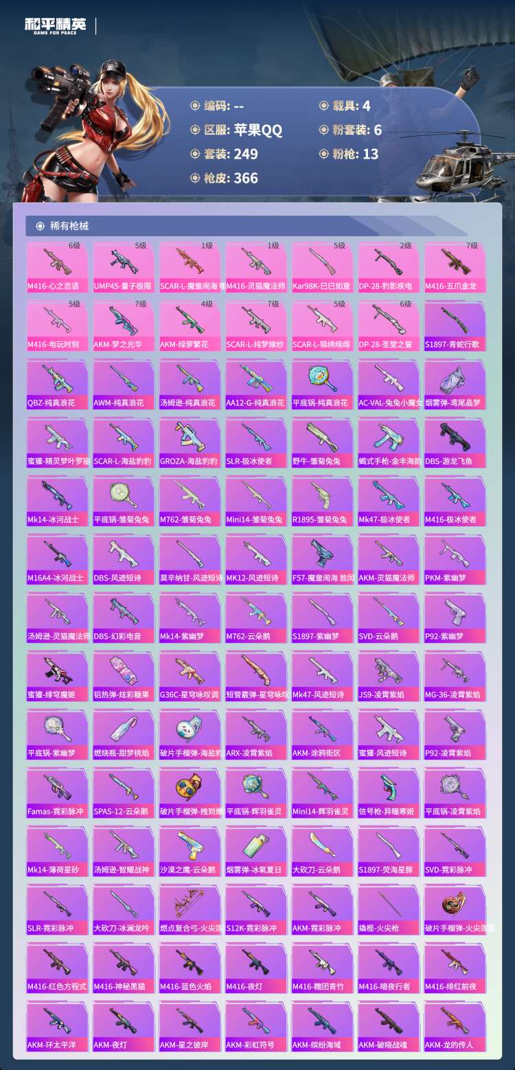 hs49880 苹果手Q-23王牌印记-1红装-6粉装-13特效枪-4载具-热力值-24