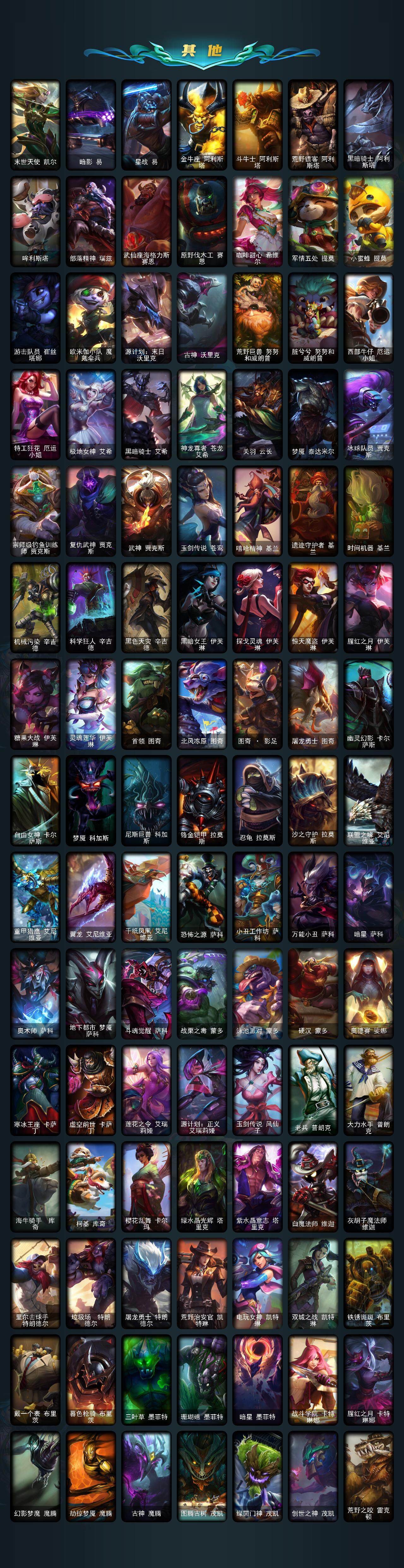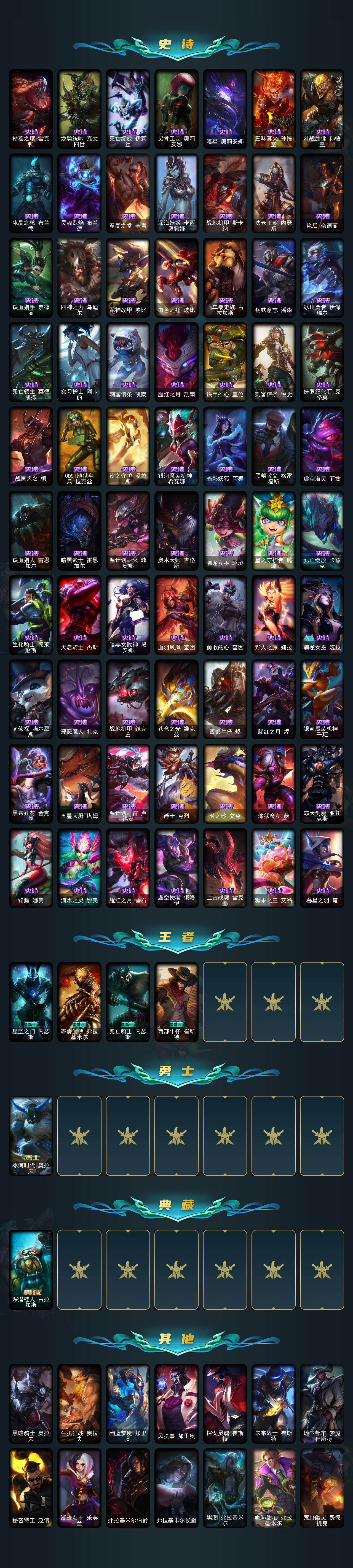 172英雄/501皮肤/4终极/13神话/47限定/16臻彩/199炫彩/51传说/112史诗/黄金/