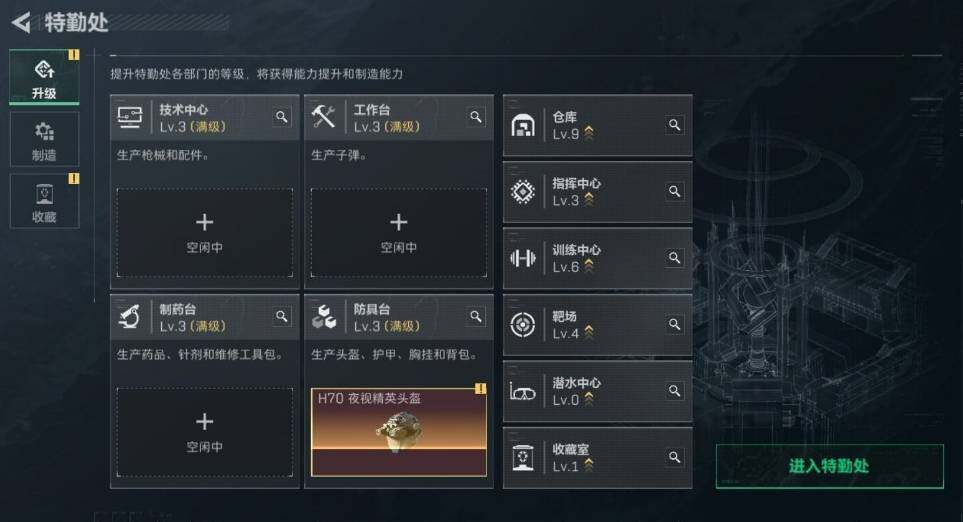 【特勤处】制药台Lv.3/工作台Lv.3/仓库Lv.9/防具台Lv.3/训练中心Lv.6/靶场Lv.4/技术