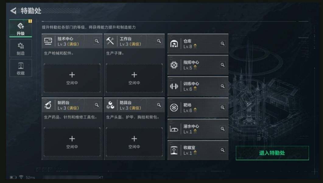 【特勤处】制药台Lv.3/工作台Lv.3/仓库Lv.8/防具台Lv.3/训练中心Lv.6/靶场Lv.6/技术中心Lv.3/指挥