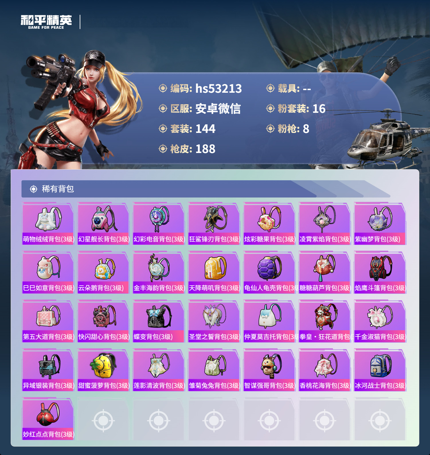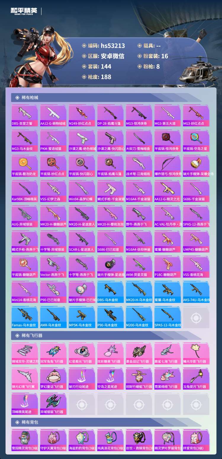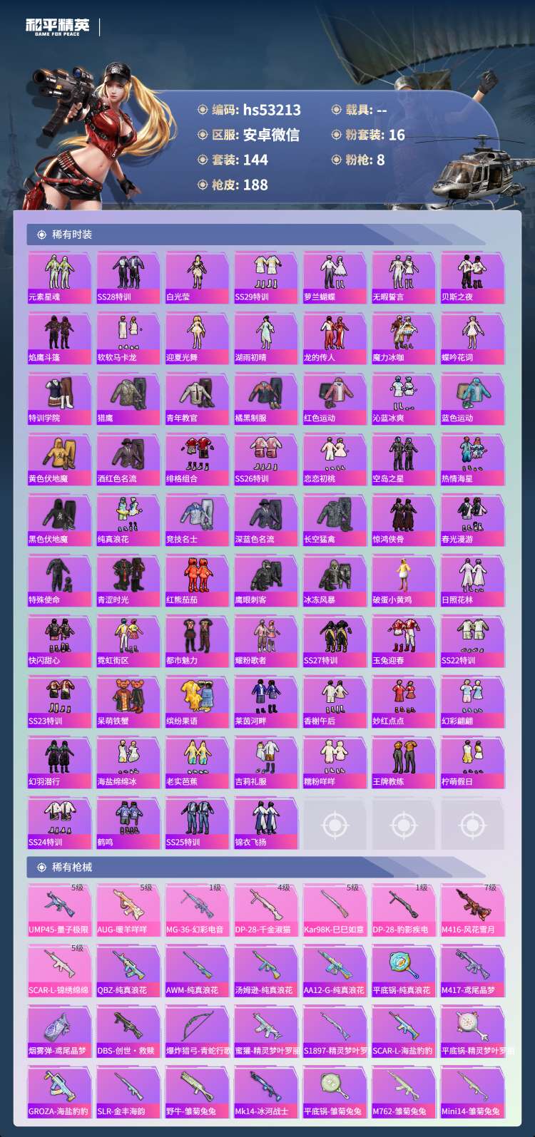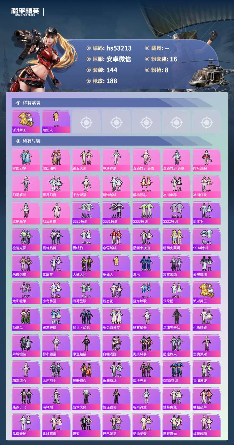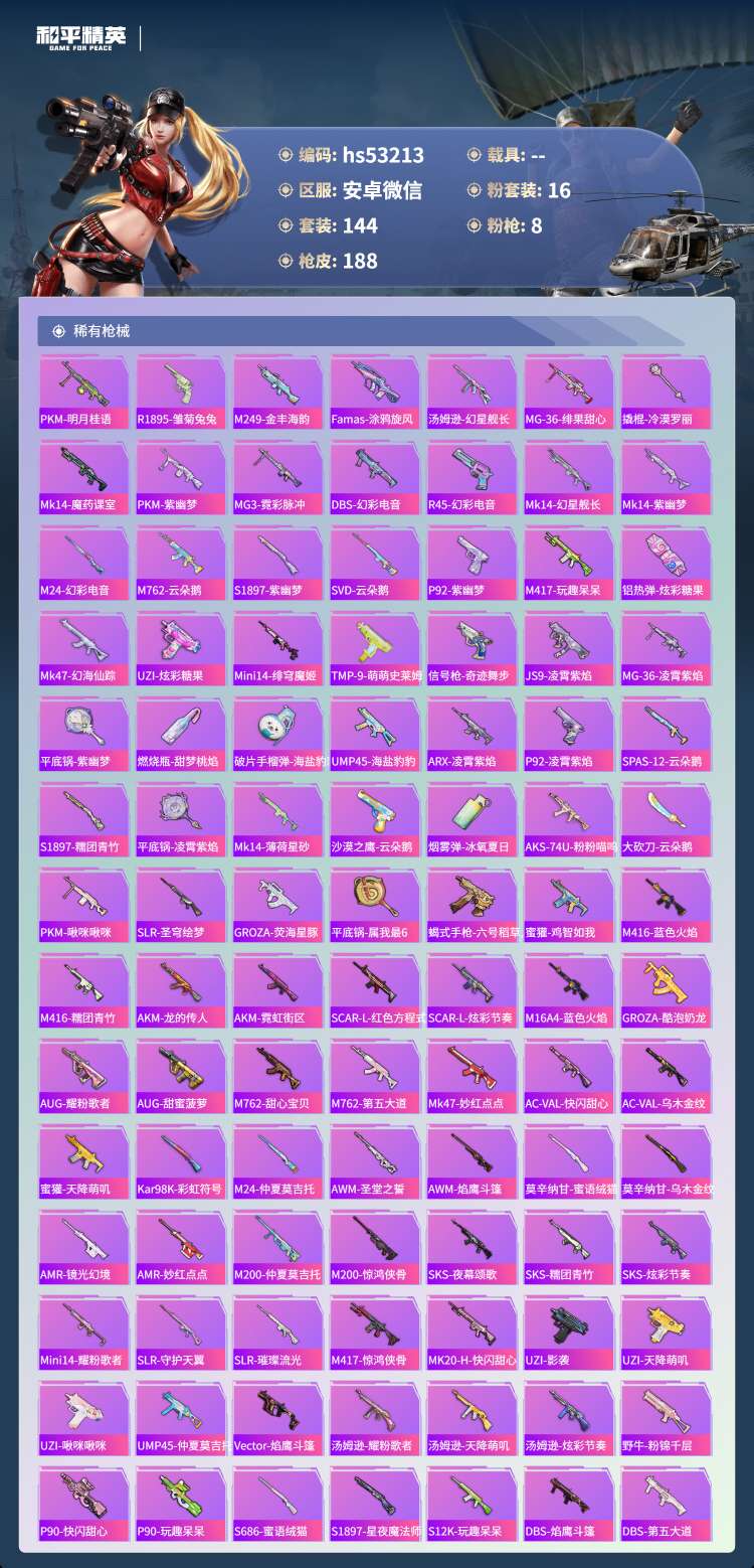 hs53213 安卓微-10王牌印记-16粉装-8特效枪-63795热力值-144套装-188枪皮