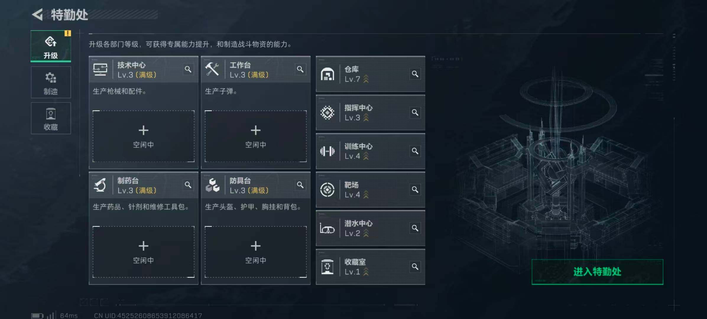 【特勤处】技术中心Lv3/工作台Lv3/制药台Lv3/防具台Lv3/仓库Lv7/指挥中心Lv3/训练中心Lv4/靶场Lv4