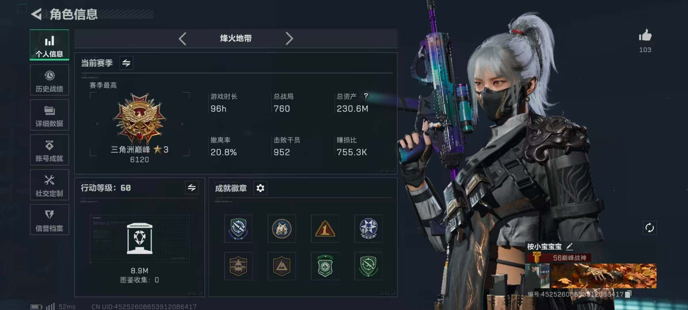 【玩家信息】行动等级:60,三角洲巅峰,战场等级:11,列兵,