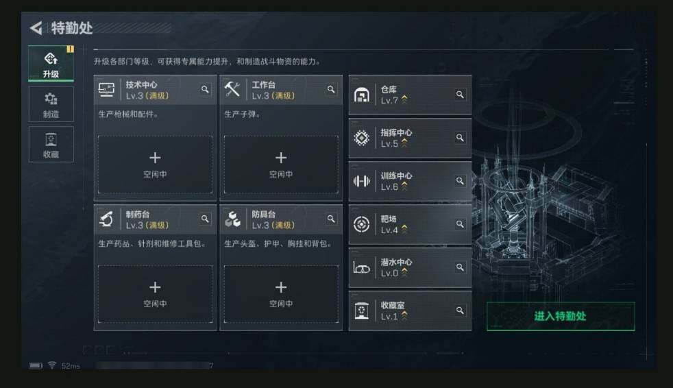 【特勤处】制药台Lv.3/工作台Lv.3/仓库Lv.7/防具台Lv.3/训练中心Lv.6/靶
