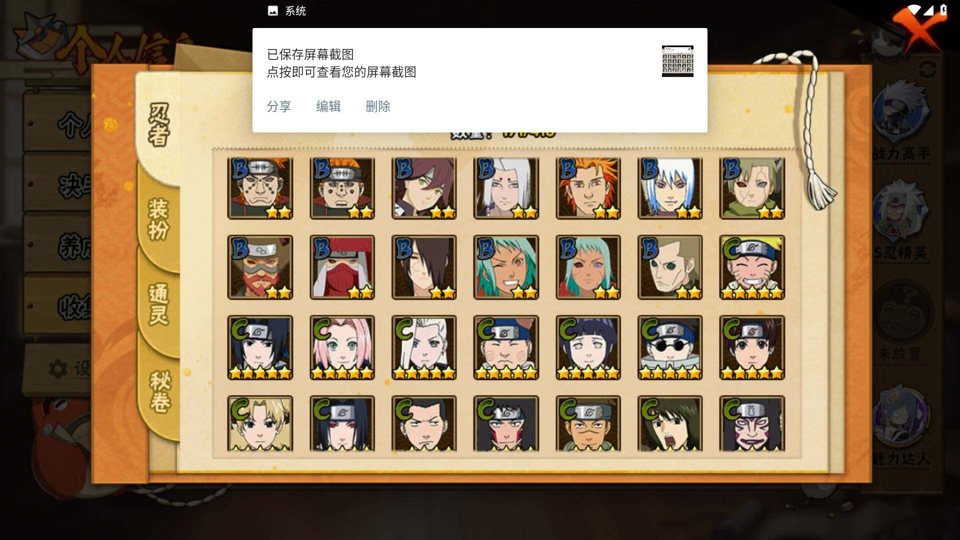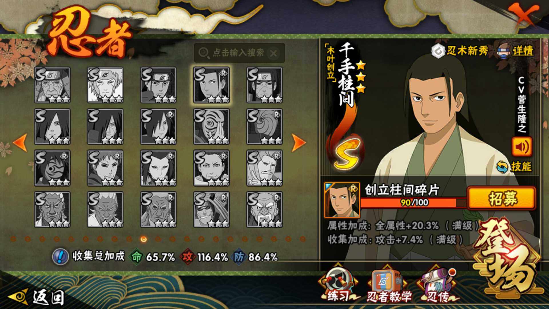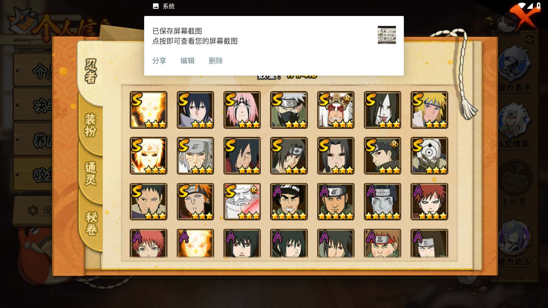 【S级忍者】:千手扉间「秽土转生」(3星),宇智波鼬「秽土转生」(3星),宇智波斑「秽土转生·解」(3星),春野樱「忍界大战」(3星),宇智波带土「忍界大战」(3星),宇智波鼬「须佐能乎」(3星),宇智波止水「须佐能乎」(3星),旗木卡卡西